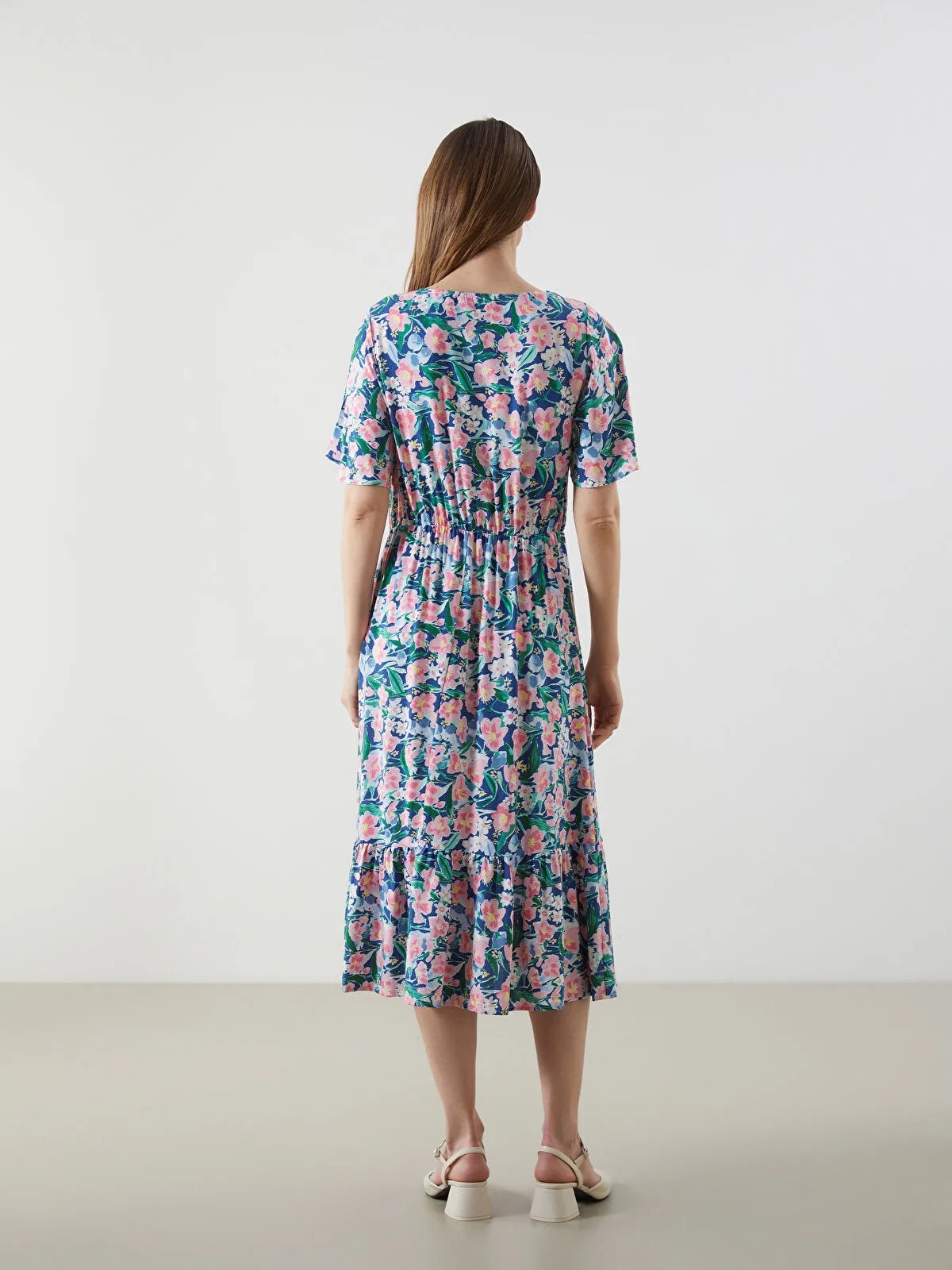 قصة عادية (Regular Fit)، بياقة V، أكمام قصيرة، بدون بطانة، بطول ميدي تقريبًا