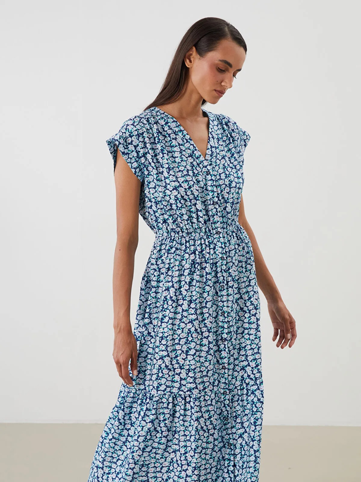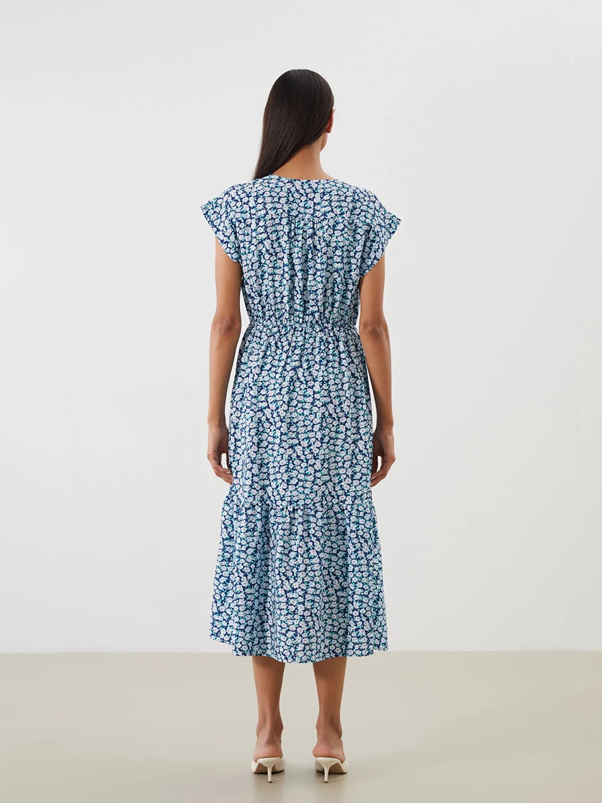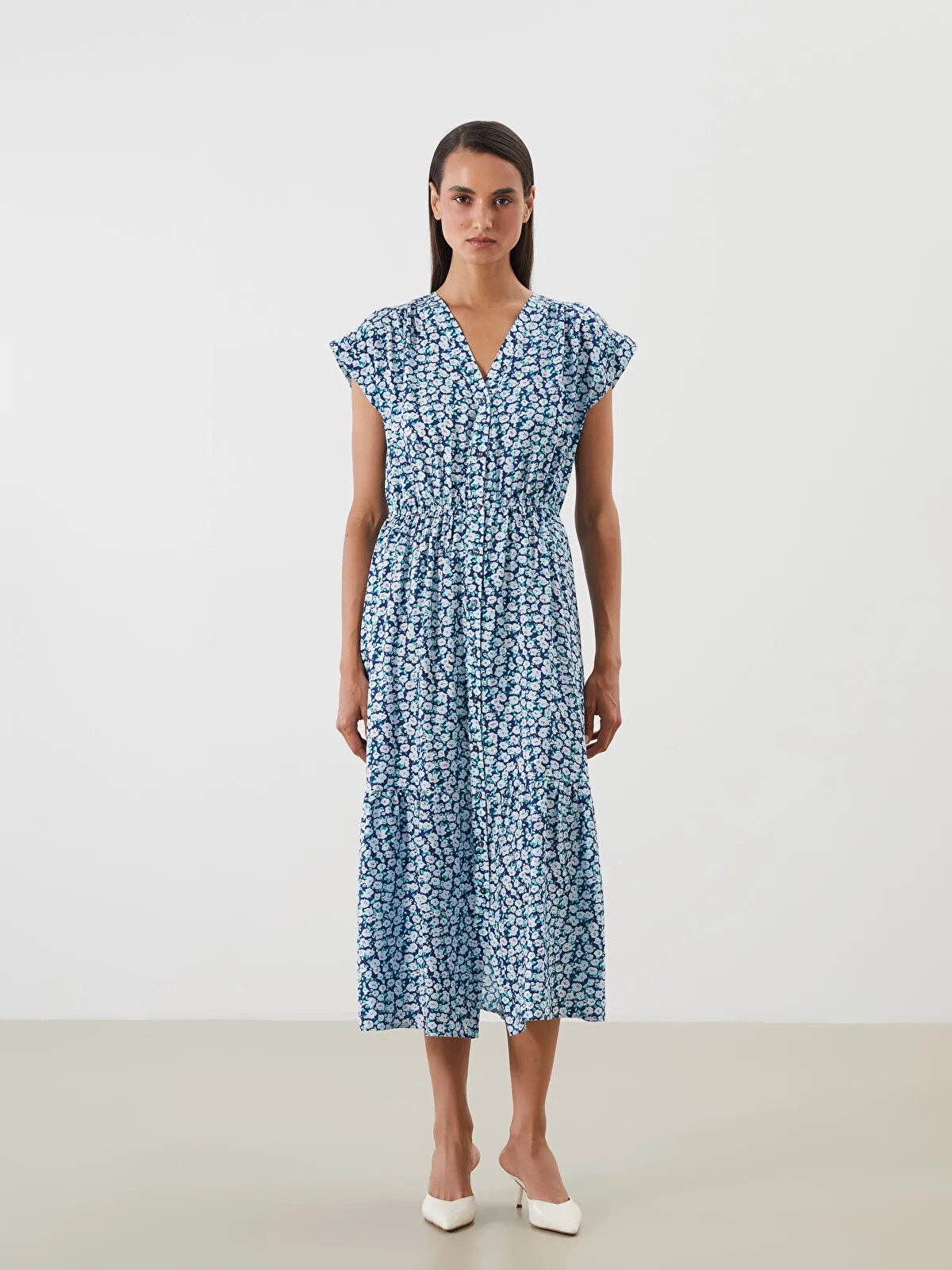 فستان بطبعة زهرية مُنعشة بتصميم بياقة V عملية وأكمام قصيرة، يحافظ على الراحة والأناقة في كل مرة ترتديه.