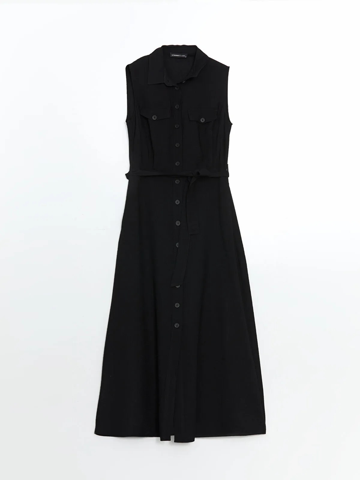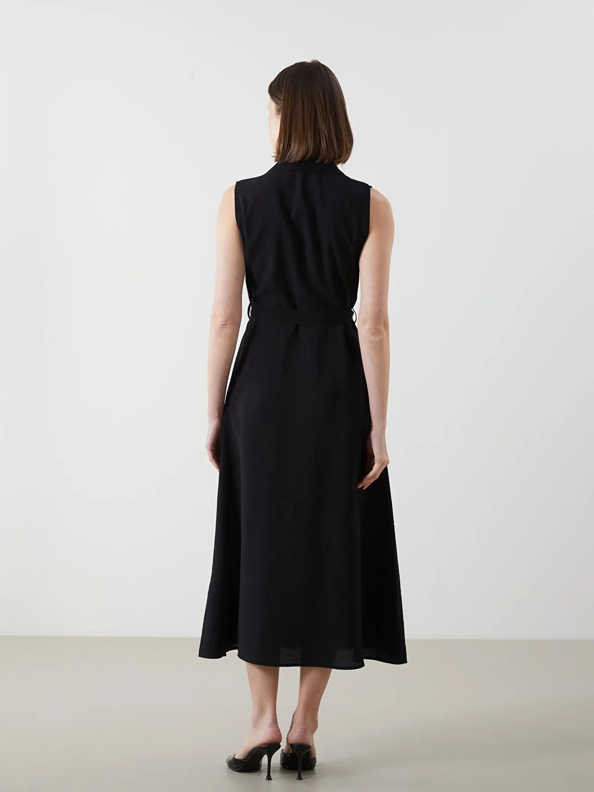 قصة عادية (Regular Fit)، خالٍ من الأكمام، طراز Midi، بياقة قميص، تفاصيل أزرار أمامية مخفية، وحزام عند الخصر للتعديل حسب الوضعية، بدون بطانة