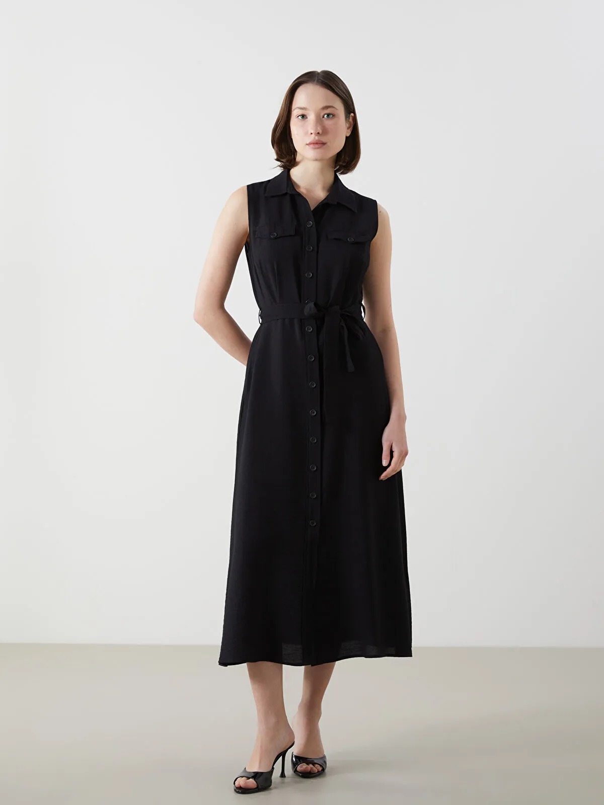 فستان قميصي أسود بتصميم عملي وكاجوال، خال من الأكمام ويأتي بحزام عند الخصر لتحديد الشكل، مثالي للمظهر اليومي والاسترخاء. خامته مريحة ومظهره أنيق دون تعقيد.