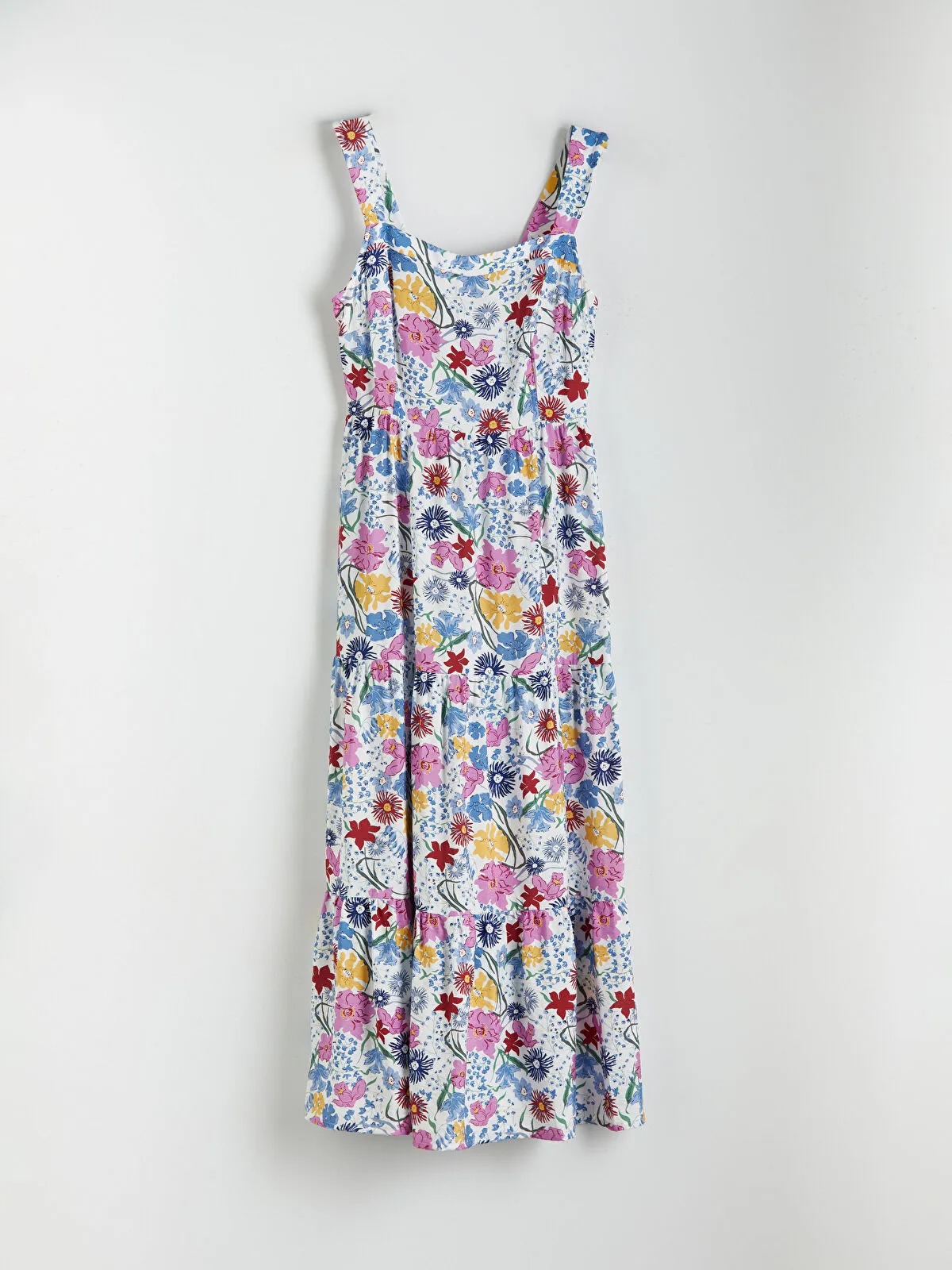 قصة عادية (Regular Fit)، بدون بطانة، ياقة مربعة، بدون أكمام بتصميم Poplin بطول Midi وخياطة عند الخصر مع خصر مطاطي بسيط لإضفاء شكل متوازن