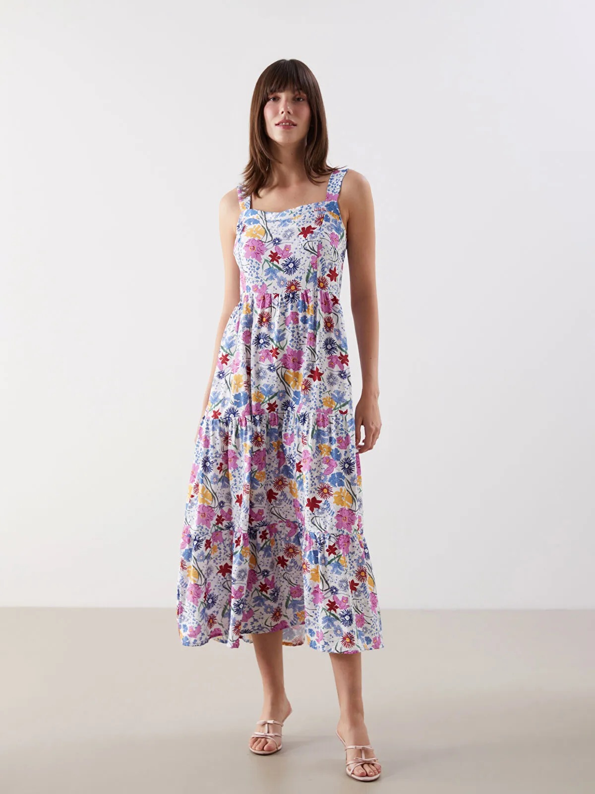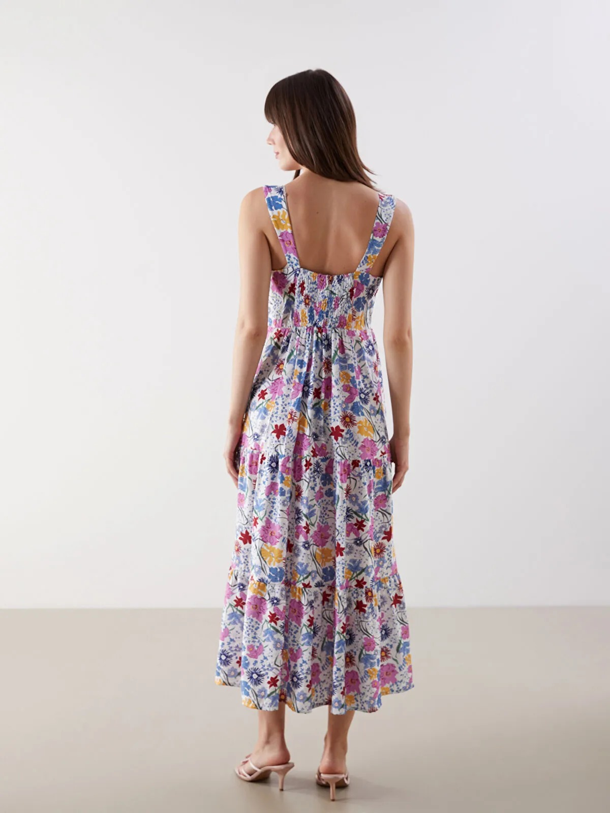 فستان ميدي زهري برقبة مربعة وكشاكش ناعمة، مصنوع من قماش Poplin مريح وخفيف، تصميم عصري وأنثوي مناسب للأيام الصيفية والإطلالات اليومية.