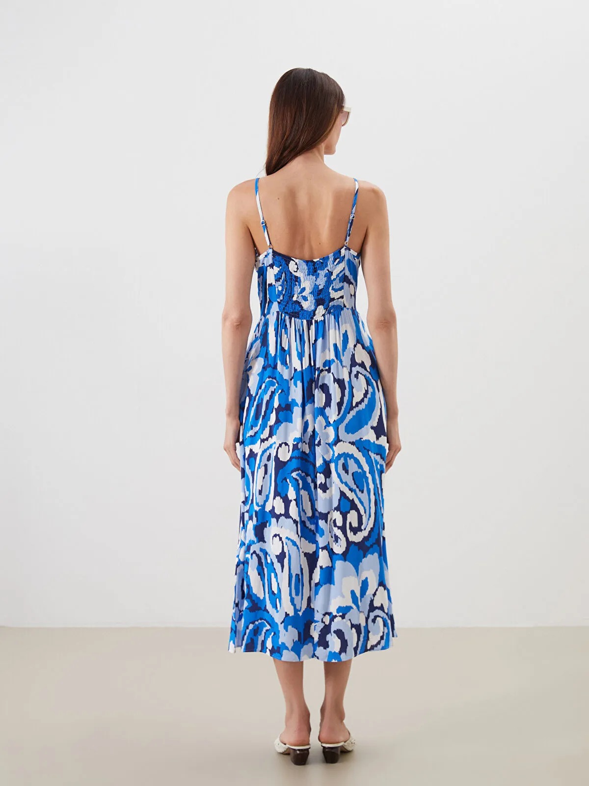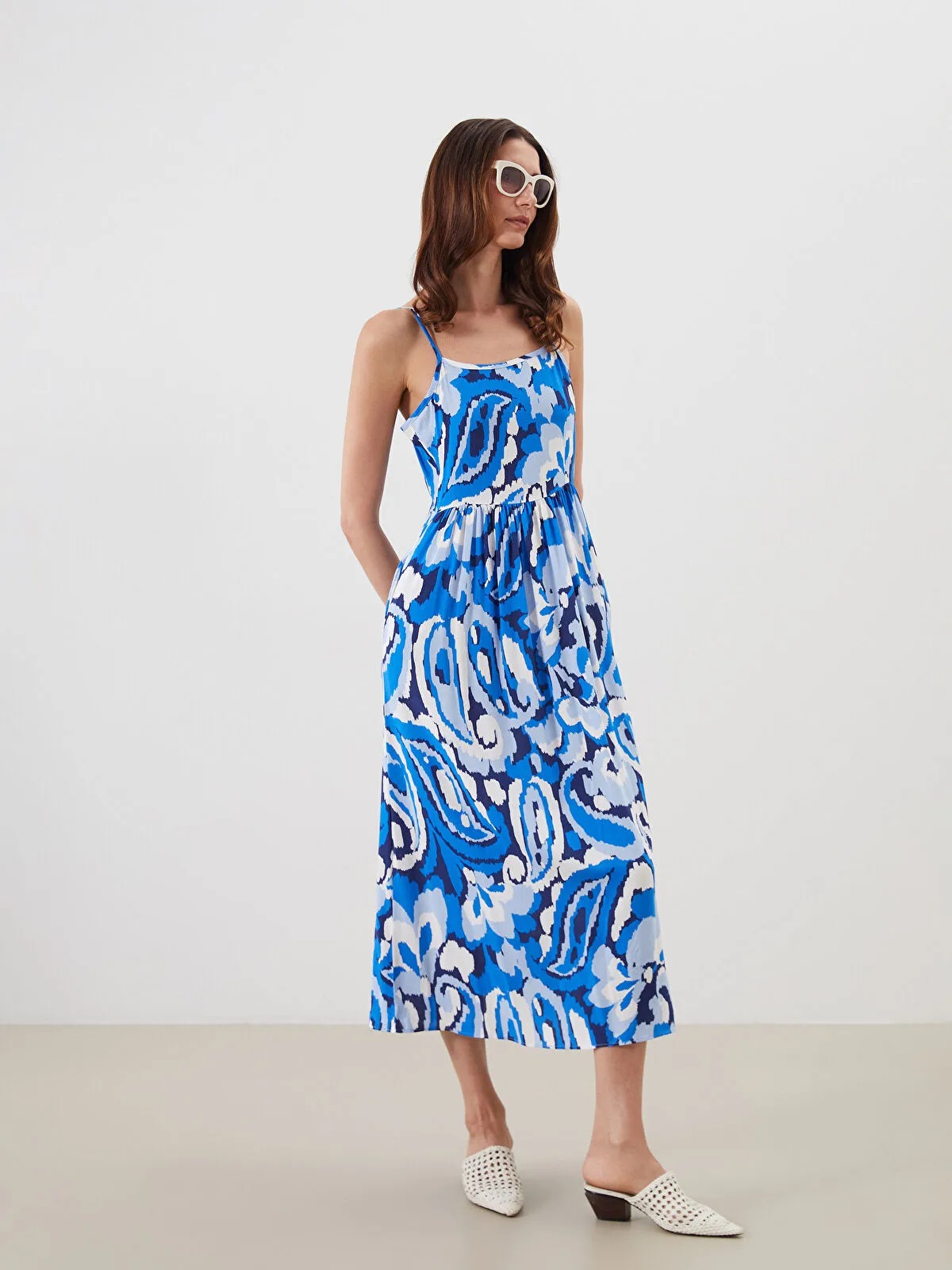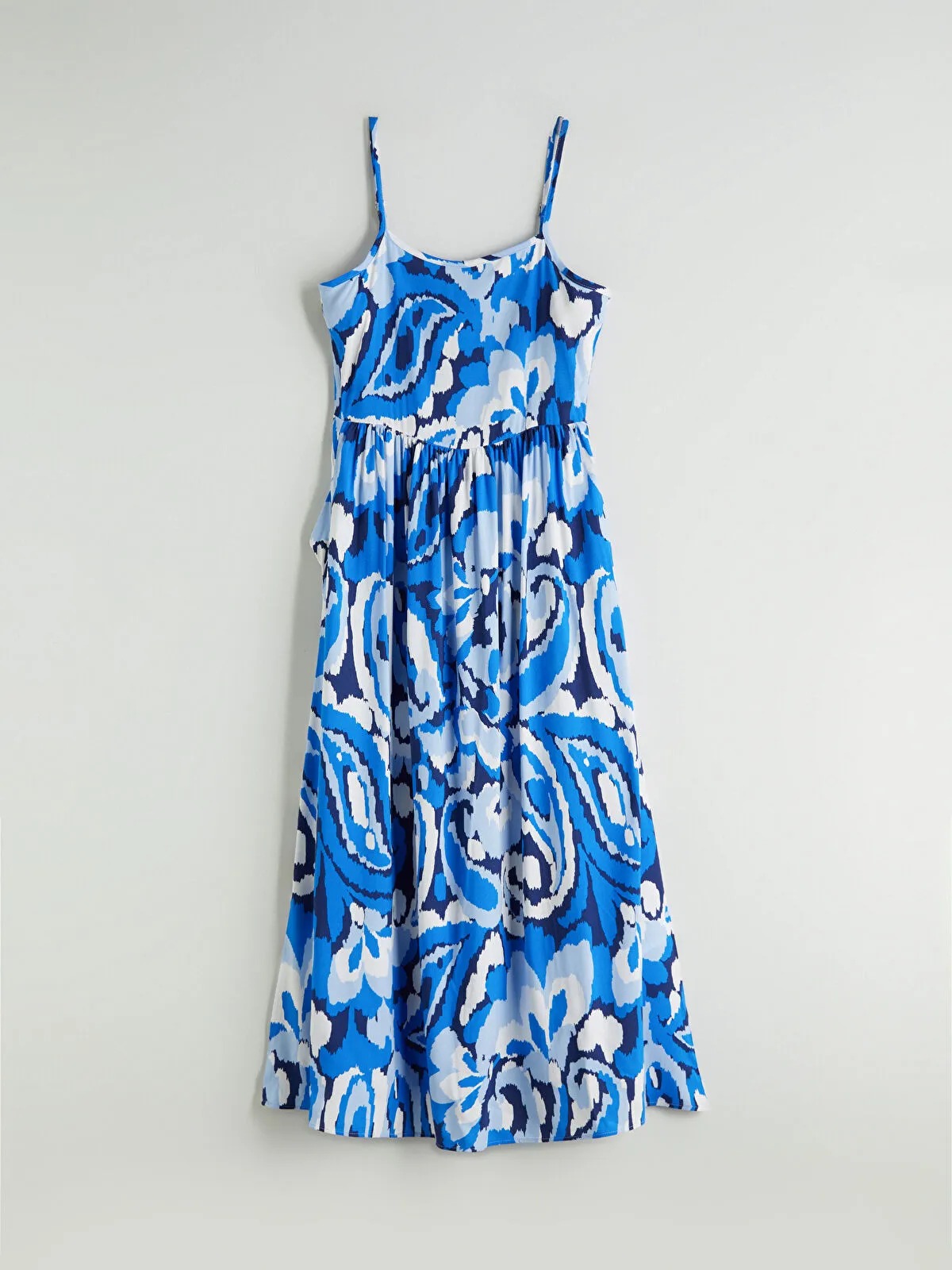 فستان أزرق مزخرف بنقشات ناعمة وتصميم برقبة مربعة (Square Neck)، بتفاصيل A‑Cut لتعزيز انسيابية الإطلالة، يُظهر مزيجًا بين الراحة والأناقة في آنٍ واحد.