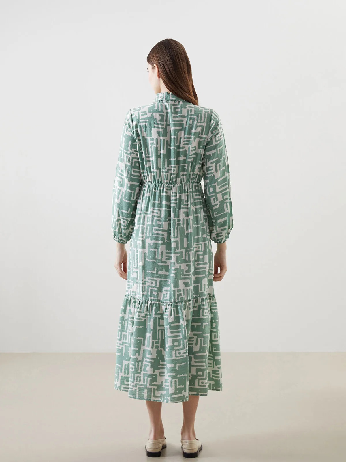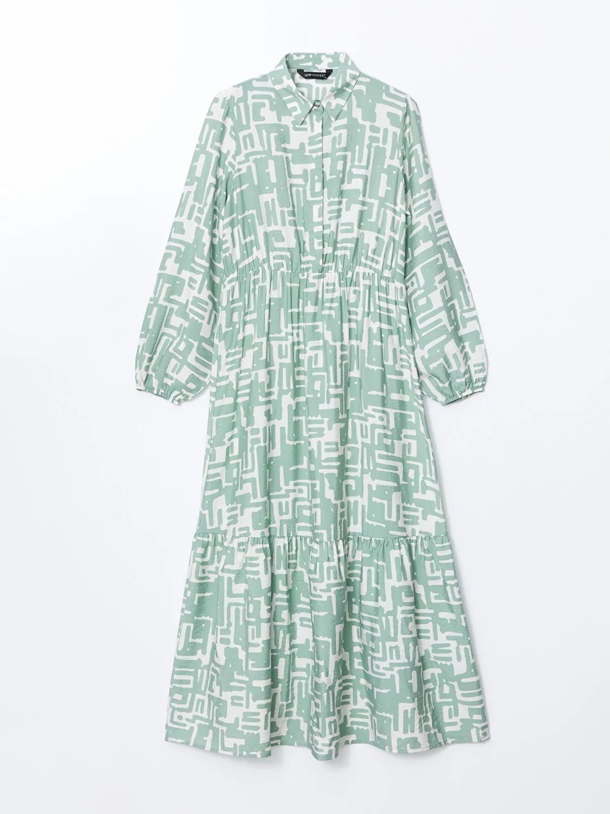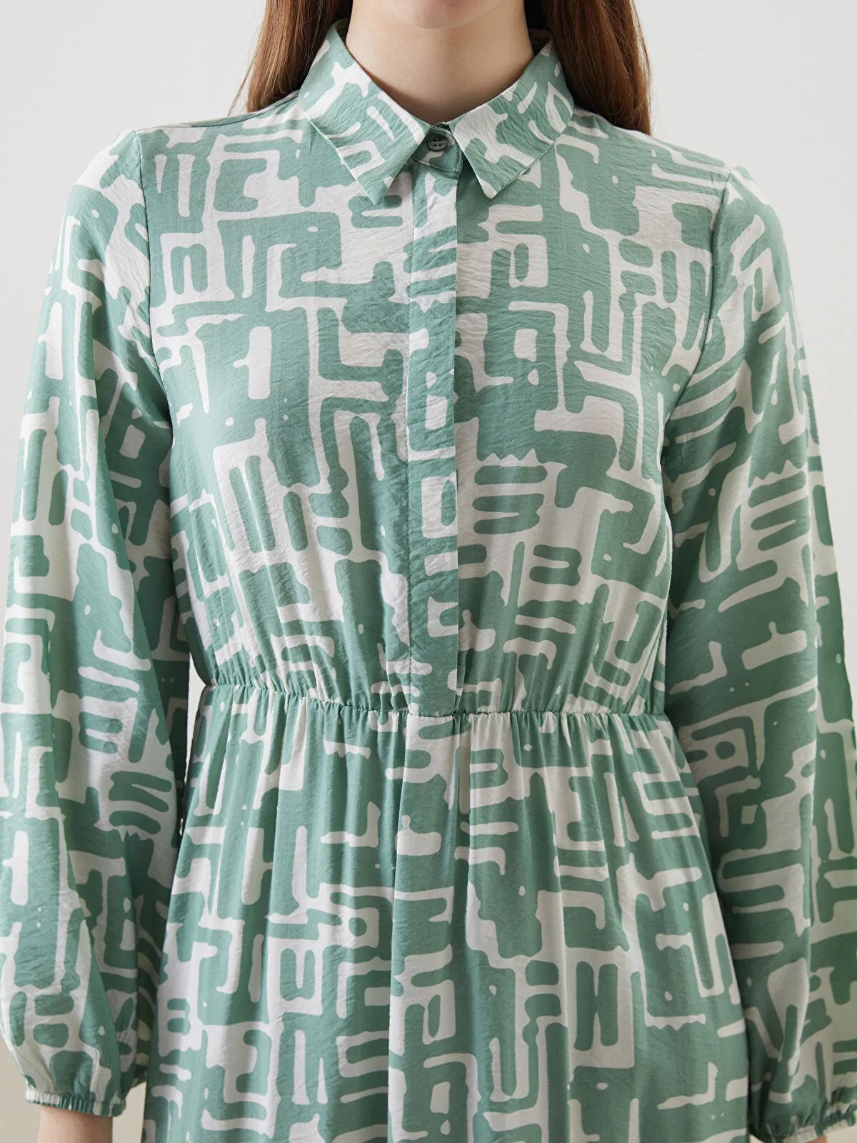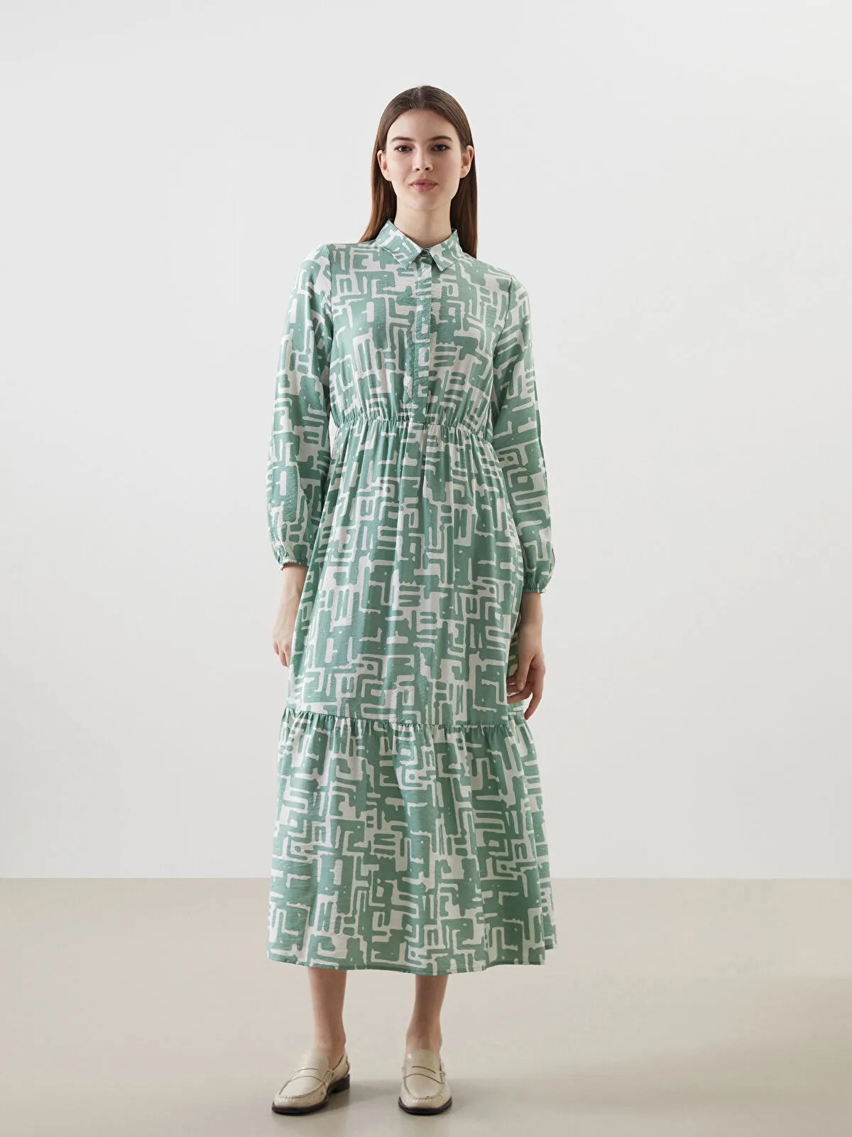 فستان أخضر بقصة قميص مصمّم بنقشات ناعمة وياقة قميص، بأكمام طويلة وتنورة بطبقات، يمنح إطلالة أنثوية راقية ومريحة مثالية للمناسبات أو الإطلالة اليومية.
