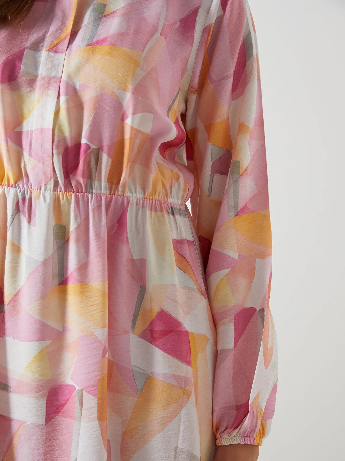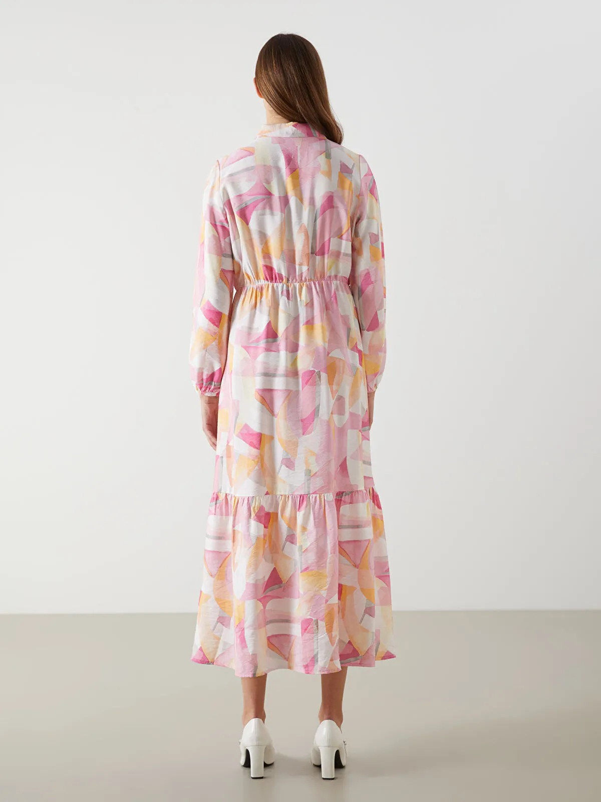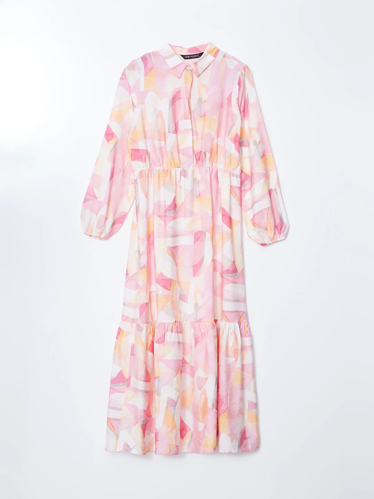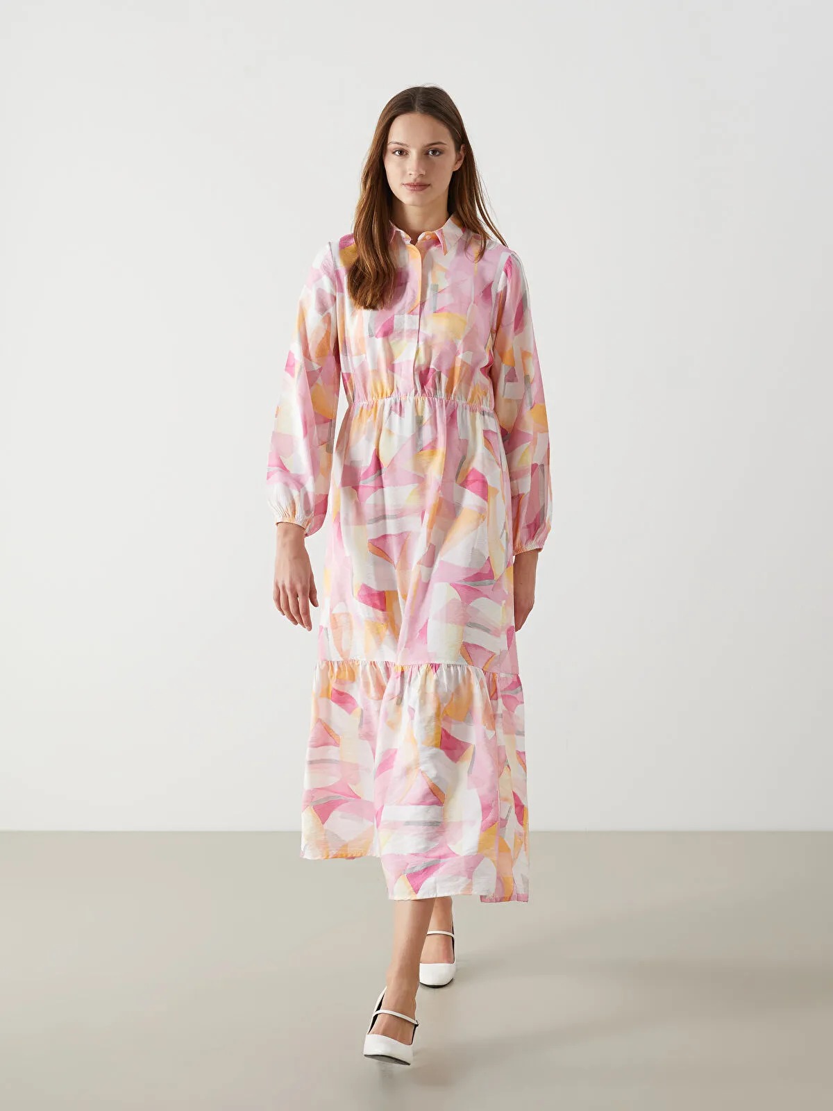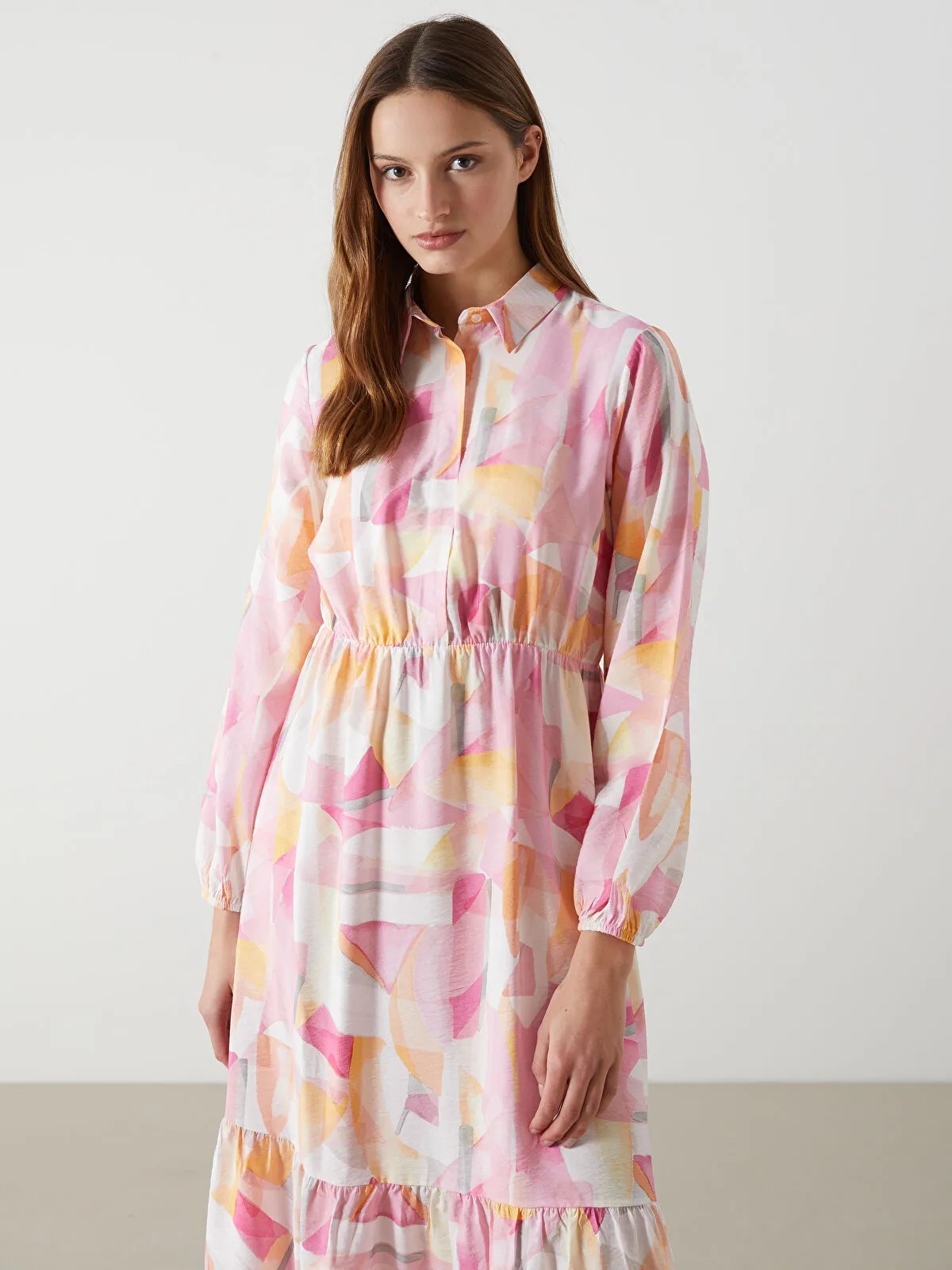 قصة عادية (Regular Fit)، بطول Midi تقريبًا، بياقة قميص، أكمام طويلة، حزام خصر بطول الخصر المرن، تنورة بطبقات، بدون بطانة، تصميم عملي ومناسب للارتداء اليومي
