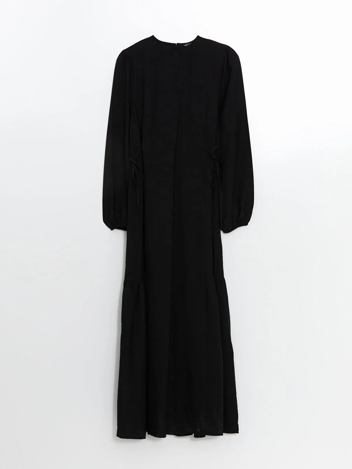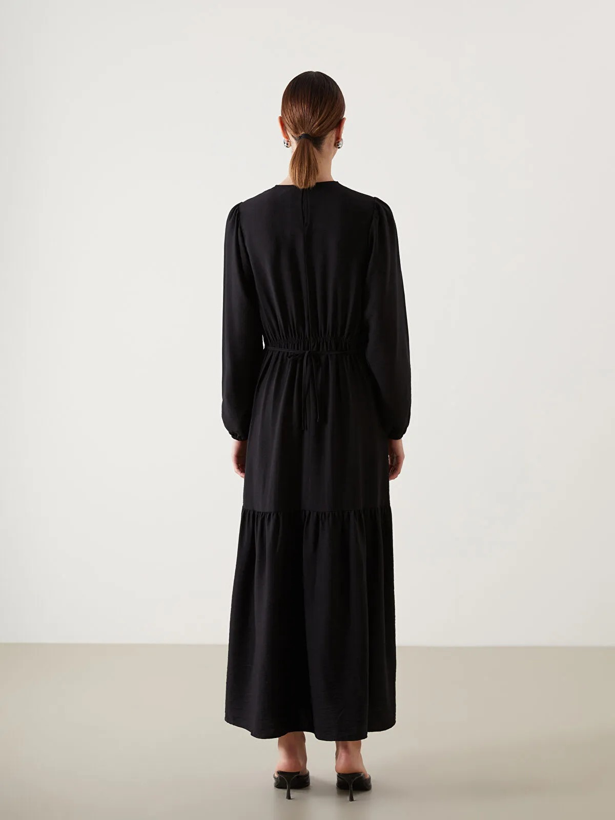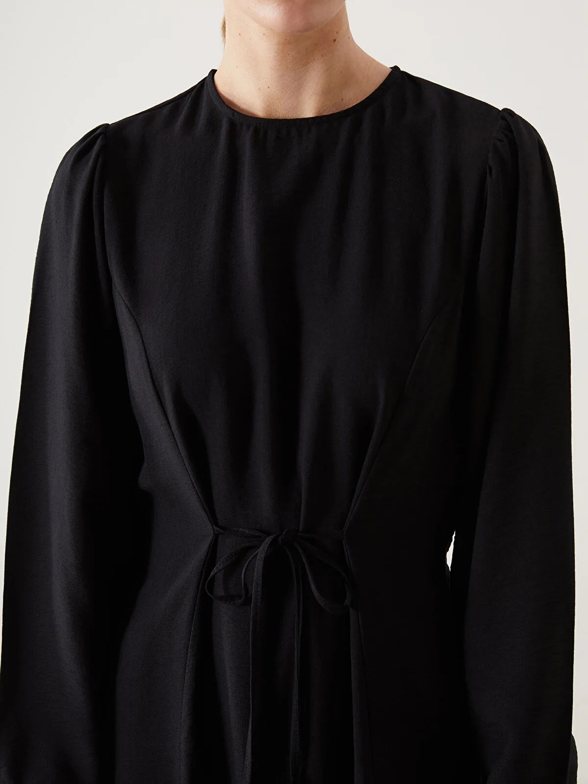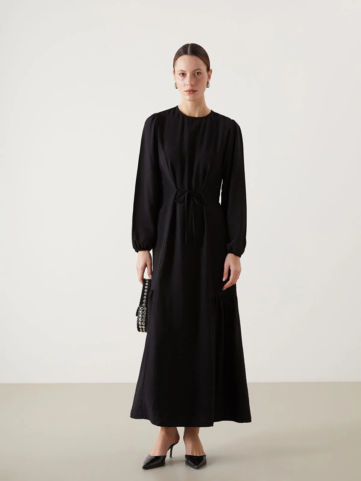 فستان أسود بياقة دائرية (Bisiklet Yaka) وأكمام طويلة، بتصميم عملي يُبرز تفاصيل الرباط جانبًا وتنورة بطبقات أنيقة، ملائم للمظهر اليومي الأنيق المريح.