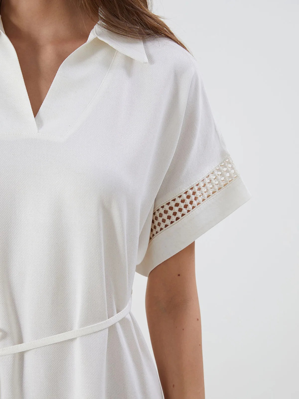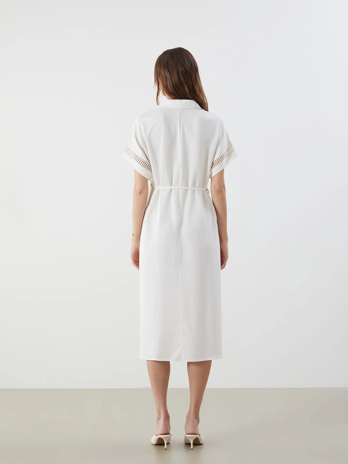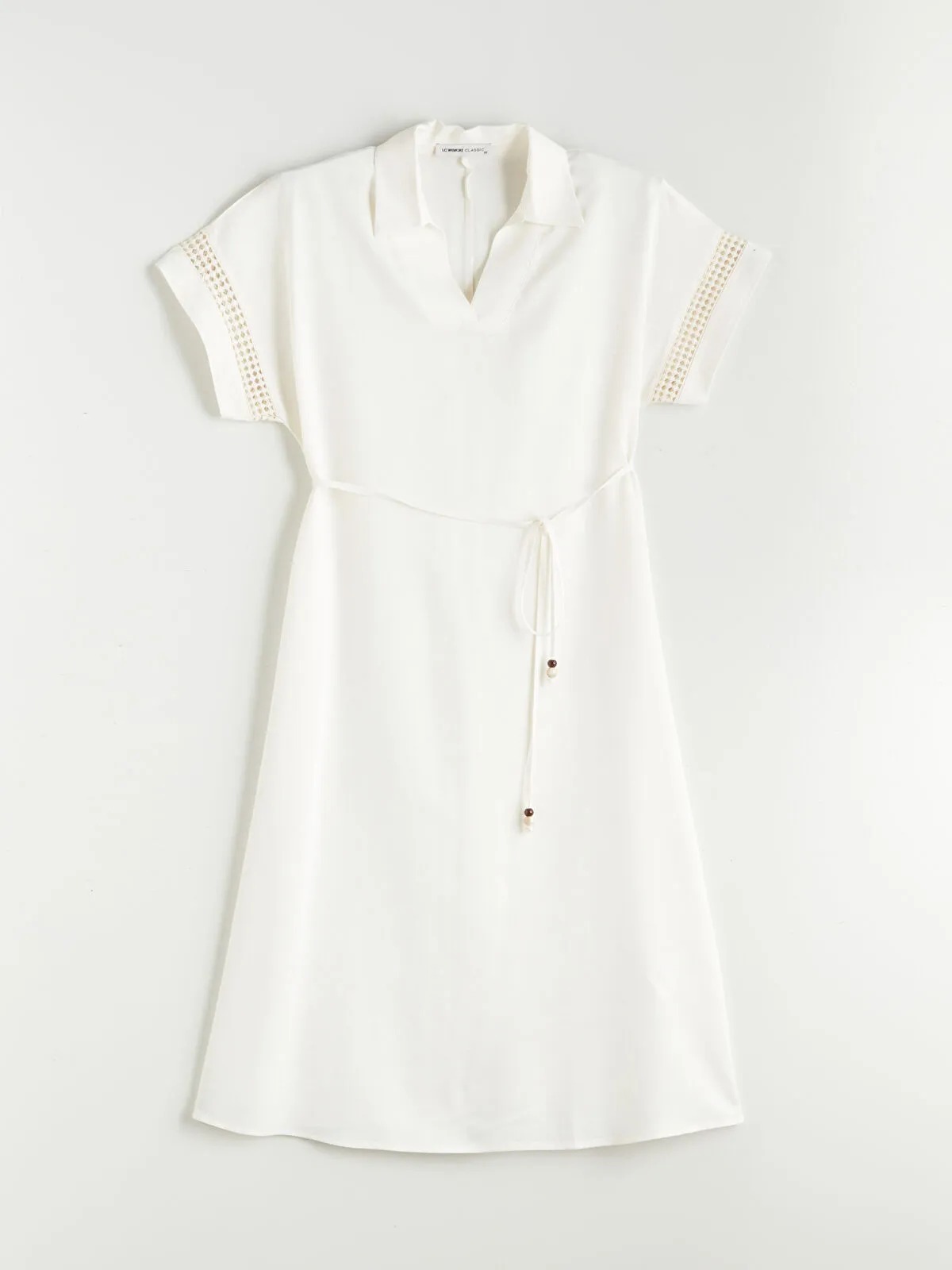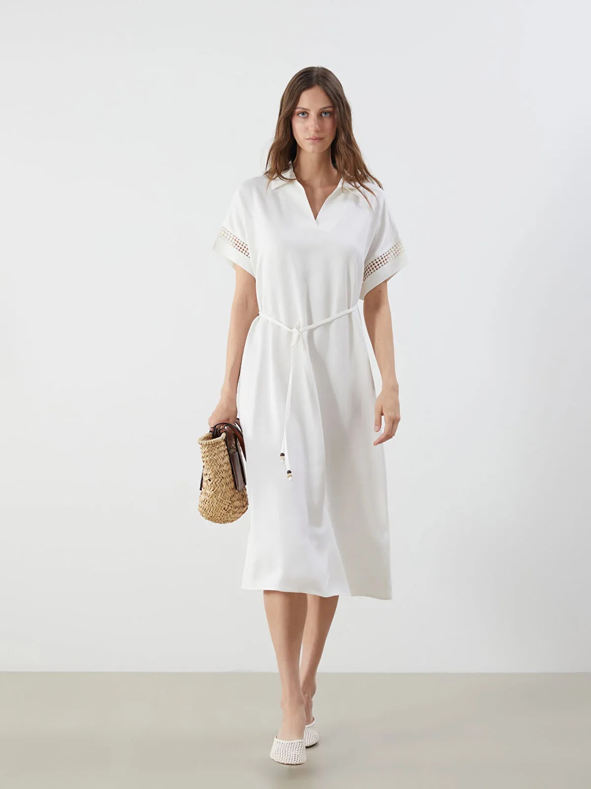قصة مريحة (Loose & Bol / Regular Fit)، خالٍ من بطانة، بطول Midi تقريبًا، ياقة قميص، أكمام قصيرة مع تطريز كرّوشيه عند الأطراف، وخصر حزام قابل للتعديل لتحديد الشكل حسب الرغبة