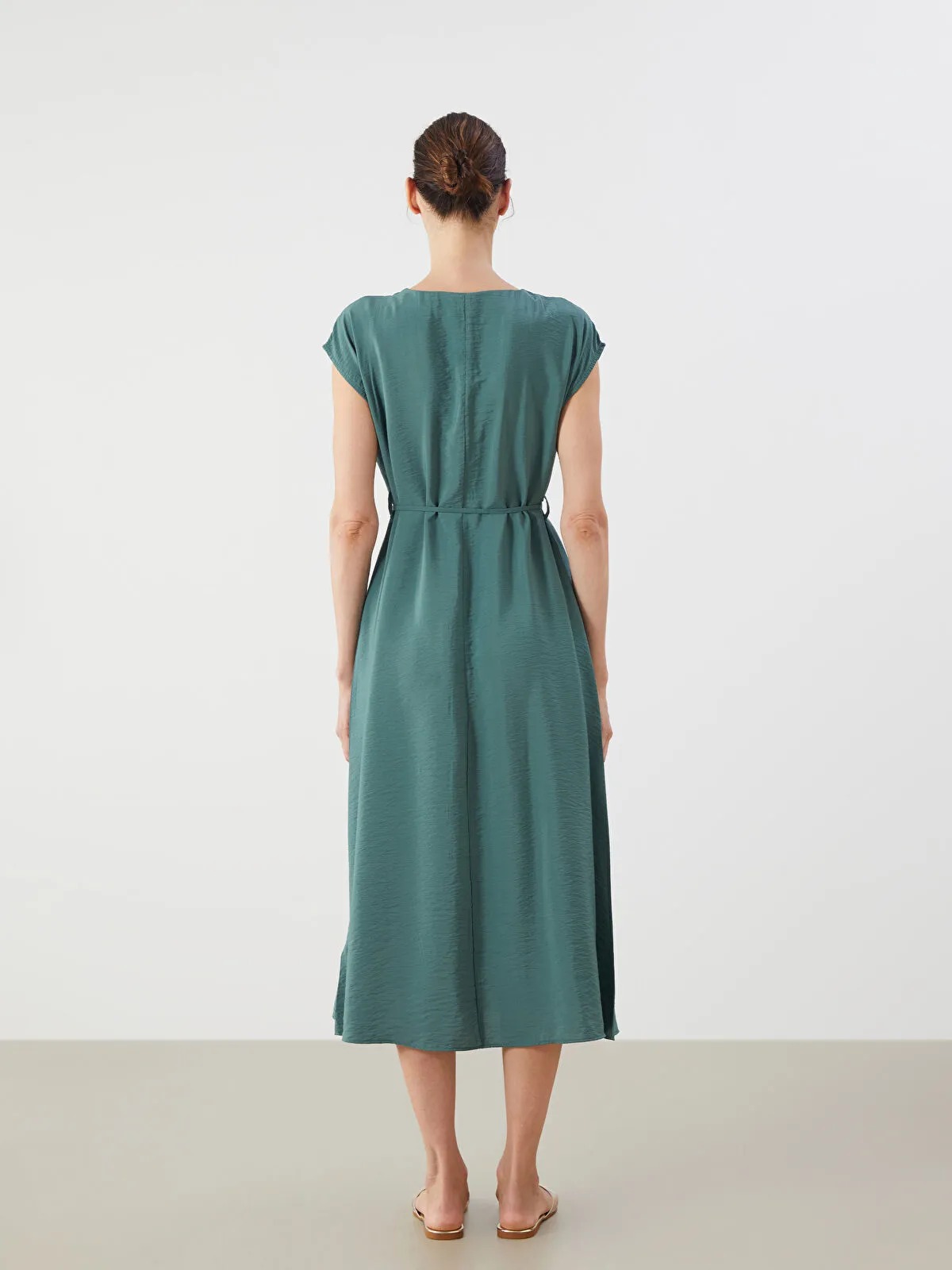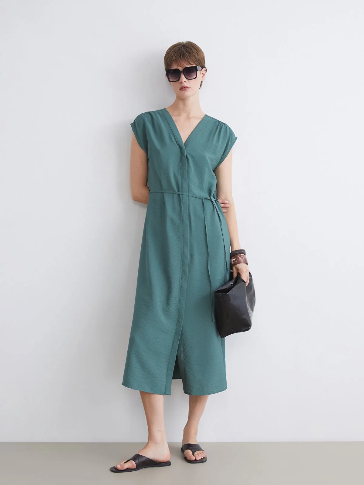 فستان بلون أخضر هادئ وتصميم بياقة V أنيق، يُثبت عند الخصر بشريط قابل للربط، يمنح مظهرًا عمليًا وأنيقًا في آن واحد. القصة مريحة والقصّة Midi تضمن سهولة الحركة ومظهر متناسق.