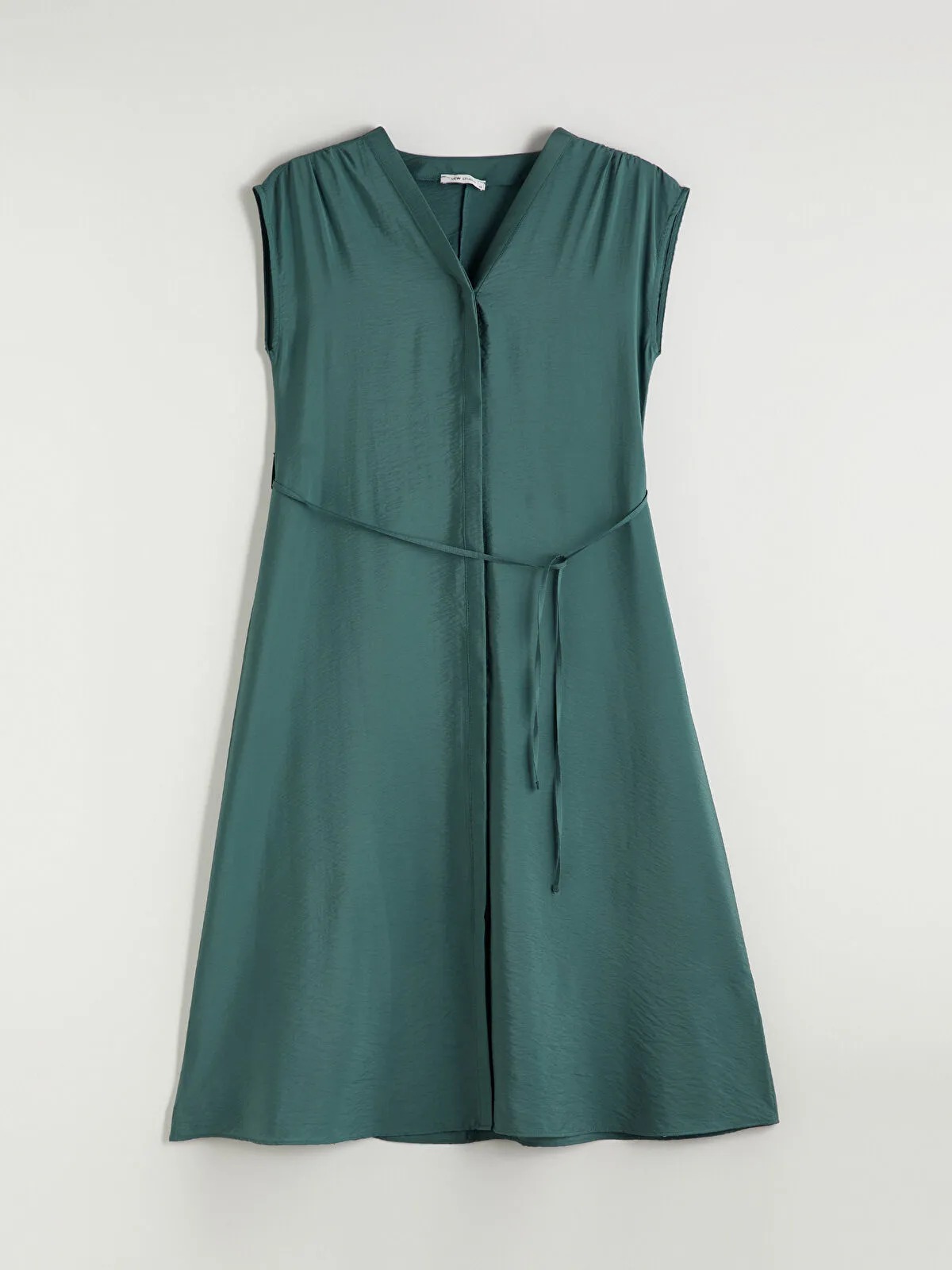 قصة عادية (Regular Fit)، بطول Midi تقريبًا، بدون بطانة، بياقة V، بدون أكمام، مزوّد برباط خصر (بالي) لتعديل الشكل حسب الرغبة، وتصميم عملي دون تعقيد