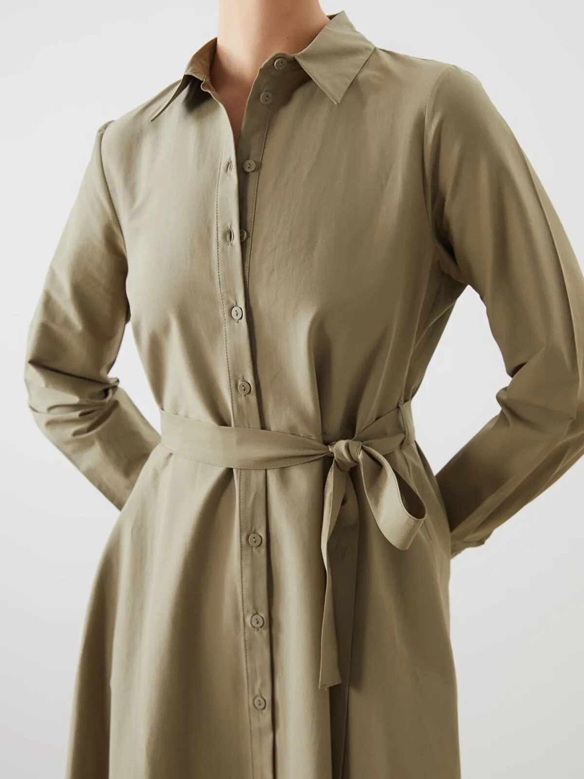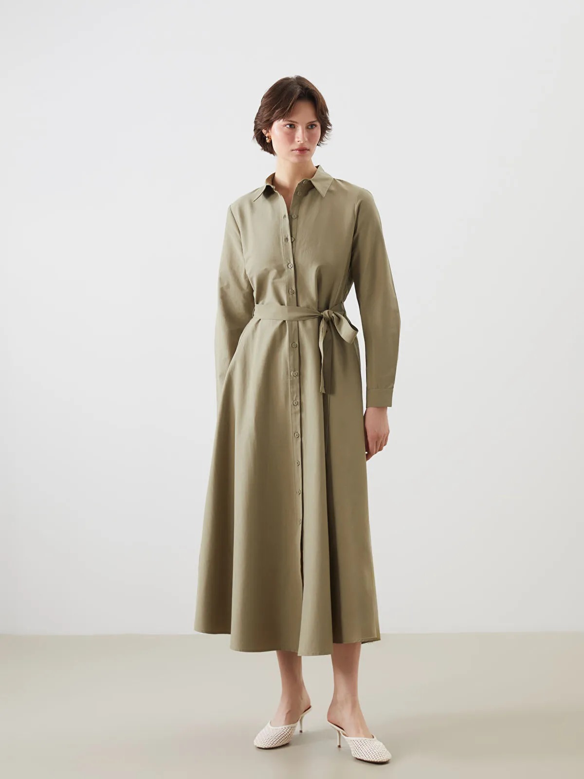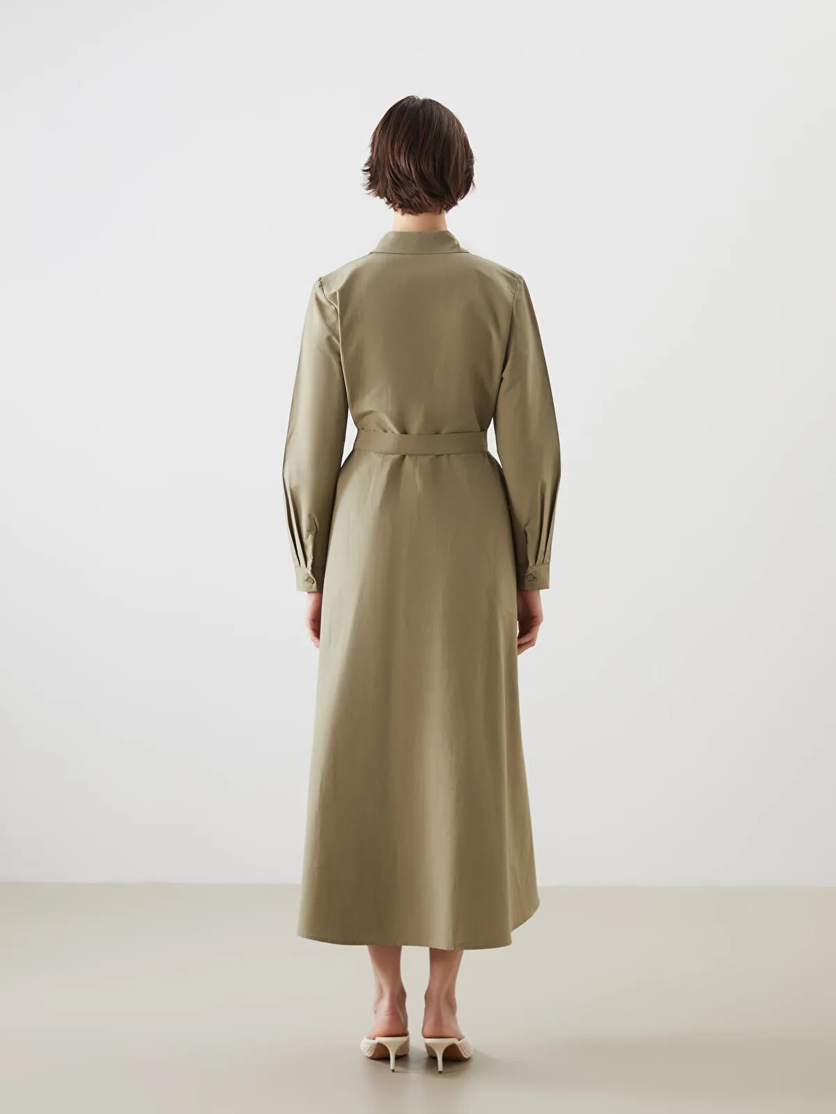 فستان قميصي بلون أخضر داكن بتصميم ناعم Poplin، يتميز بياقة قميص قلب (Collared Neck) وأكمام طويلة، مزود بحزام عند الخصر، يعكس توازنًا بين الراحة والأناقة.