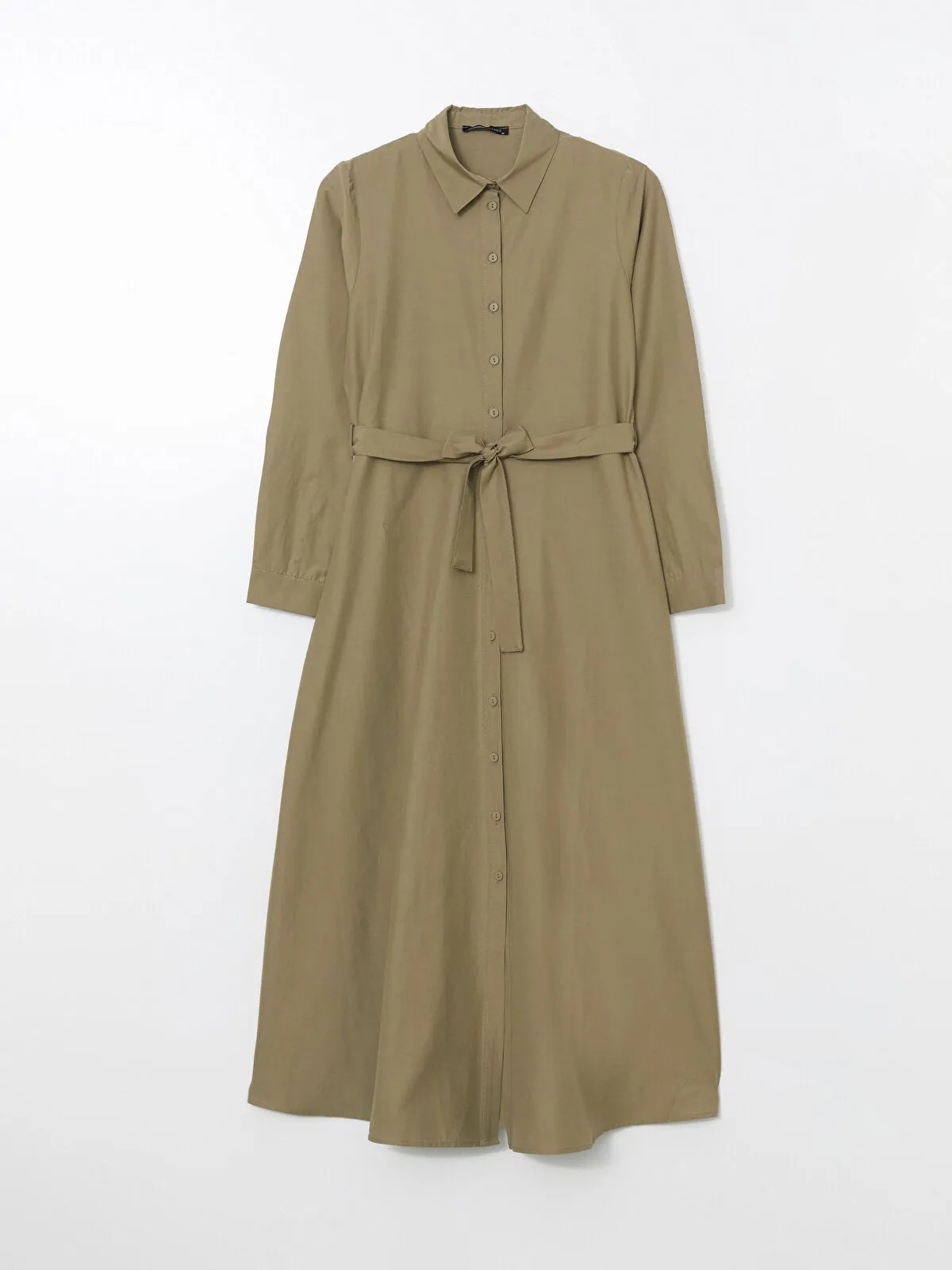 قصة عادية (Regular Fit)، بطول Midi تقريبًا، بياقة قميص، أكمام طويلة مع أساور زر، بدون بطانة، مزوّد بحزام قماشي لتحديد الخصر بشكل أنيق وعملي