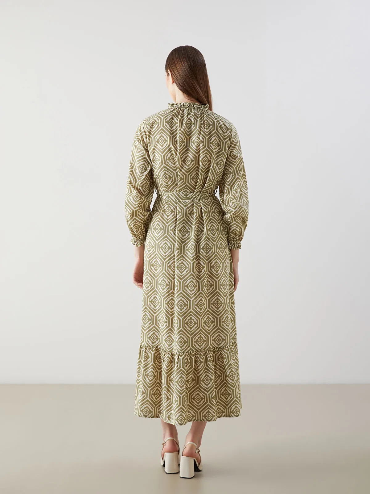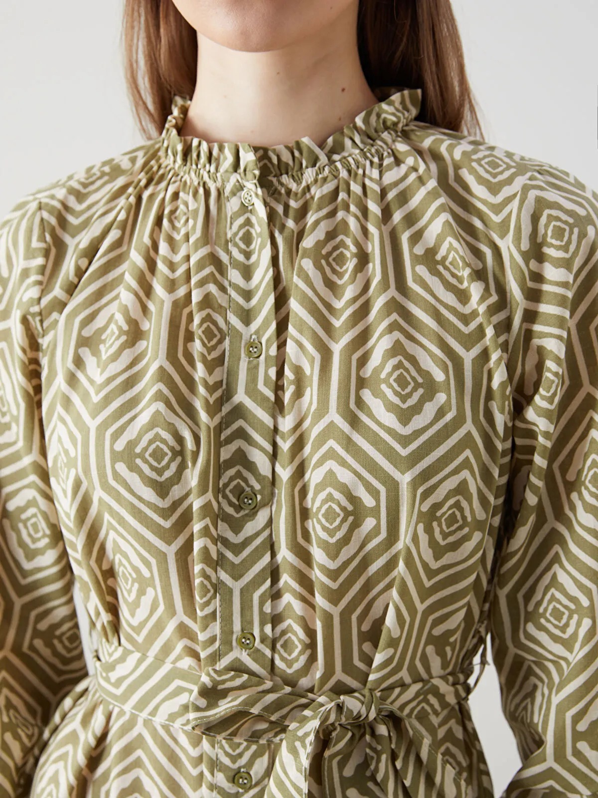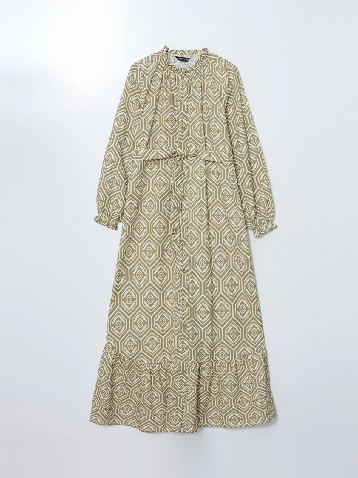فستان قميصي مخصر بنقوش زهرية ولمسة كشكش حول الرقبة (Funnel Neck)، بأكمام طويلة وخامة خفيفة تحيط بكِ بأناقة دون عناء. التصميم يمنحك مظهرًا كلاسيكيًا أنيقًا ومريحًا للاستخدام اليومي أو الإطلالات الرسمية الرقيقة.