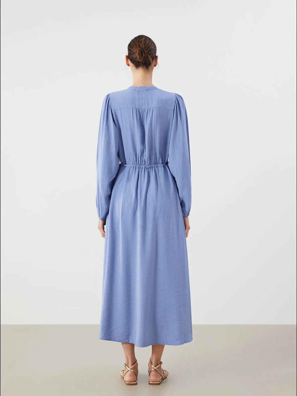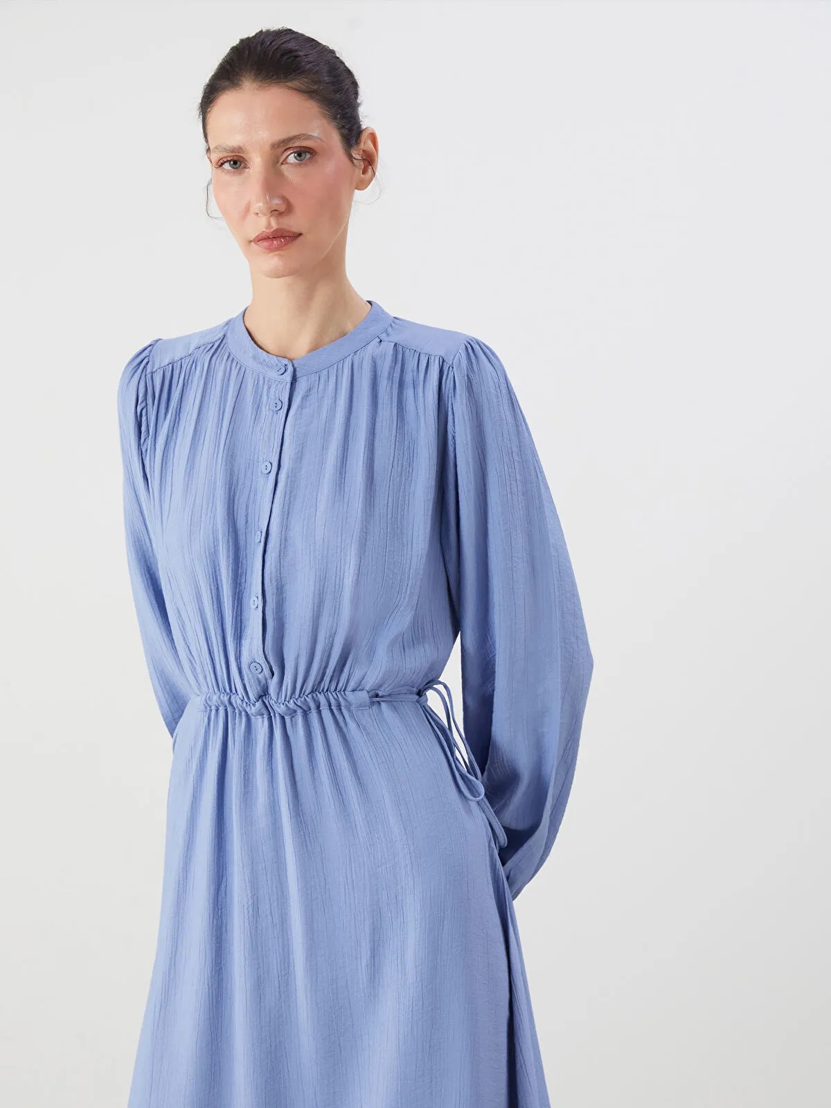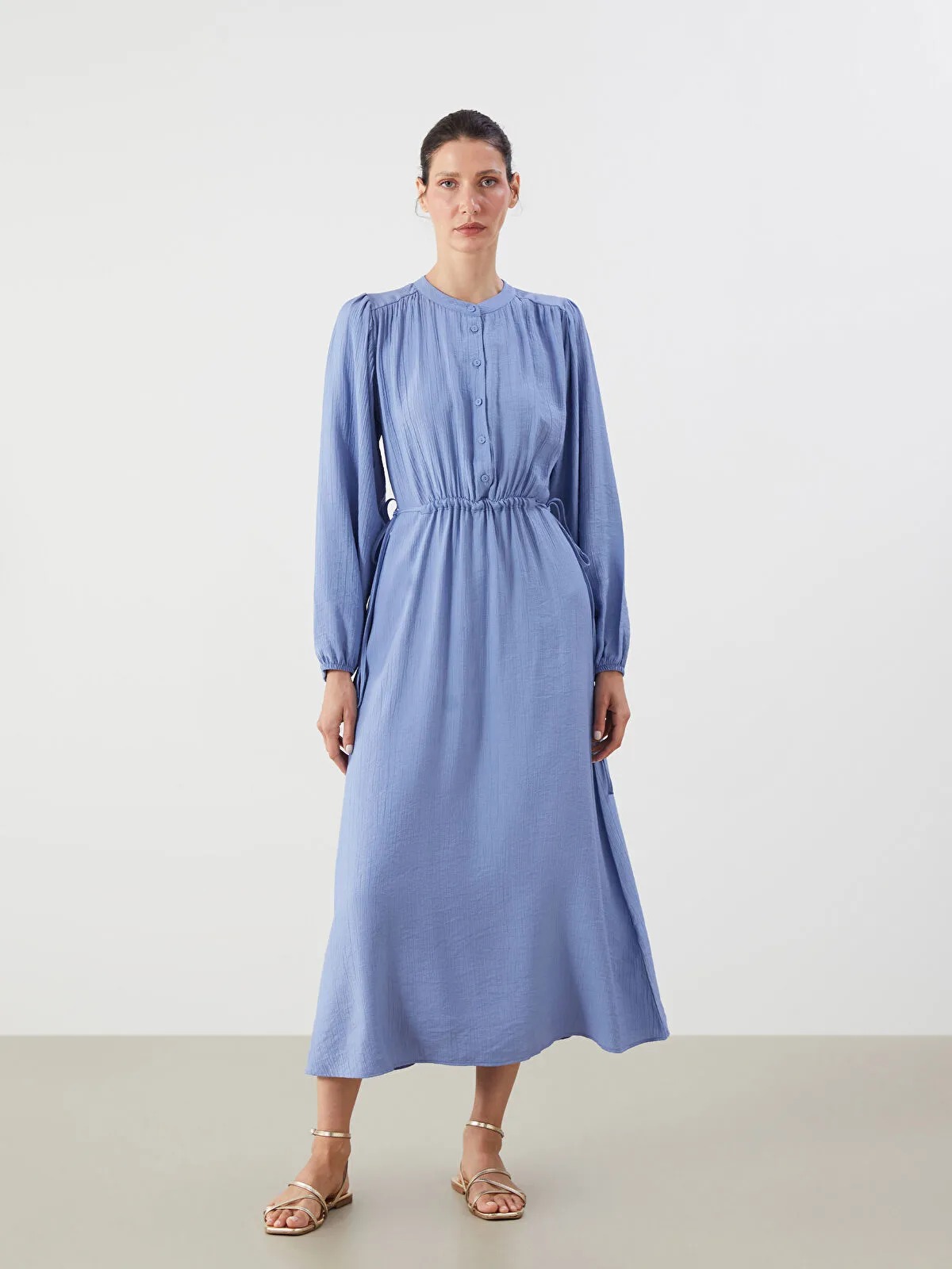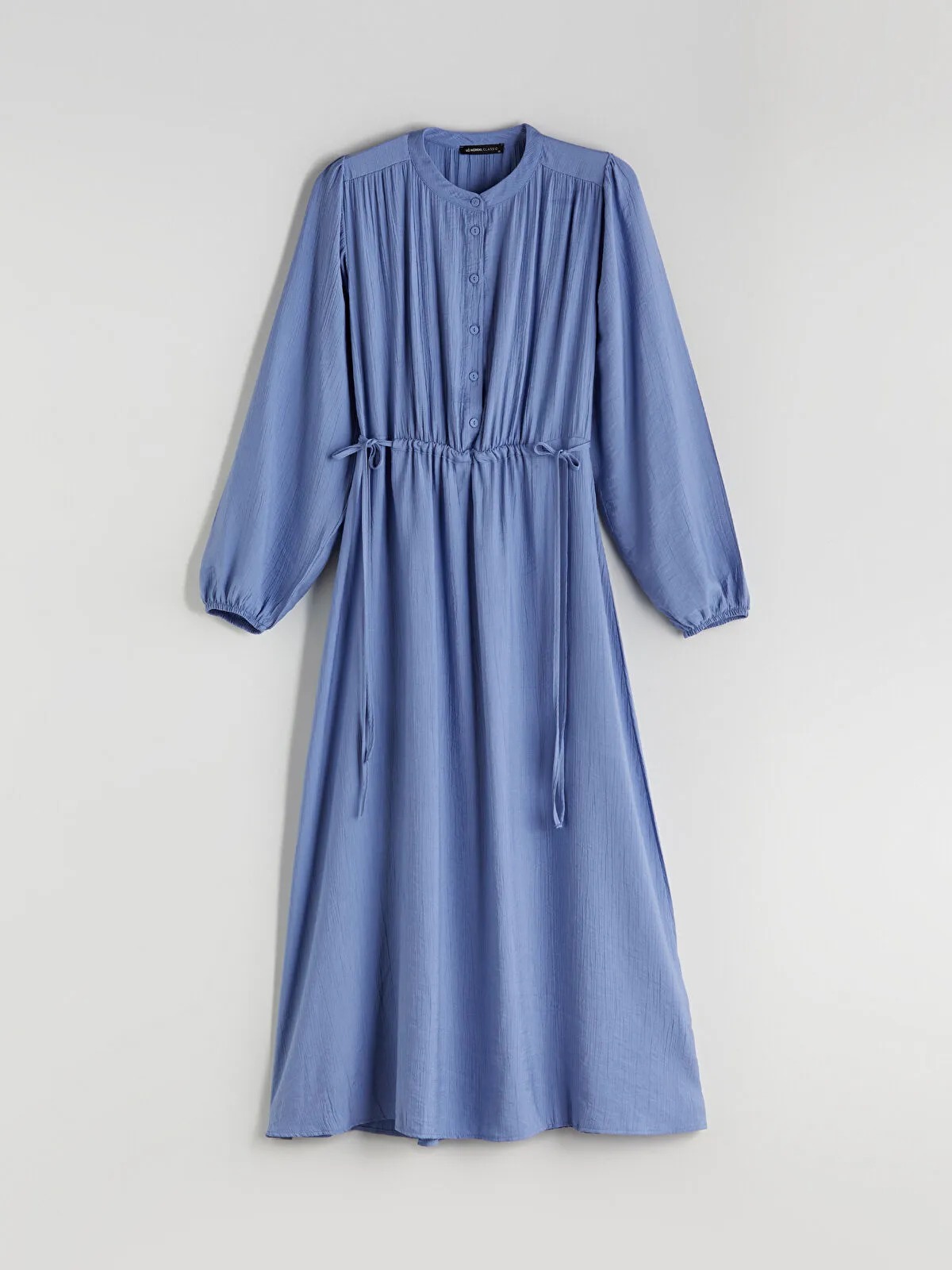 فستان طويل أنيق بياقة دائرية (Bisiklet Yaka) وأكمام طويلة، بخامة مميزة بتفاصيل محبوكة تُضفي لمسة مرحة وعصرية، مع خصر يسهل ضبطه حسب الرغبة. التصميم عملي ومريح ويمنحك أناقة يومية بسيطة.