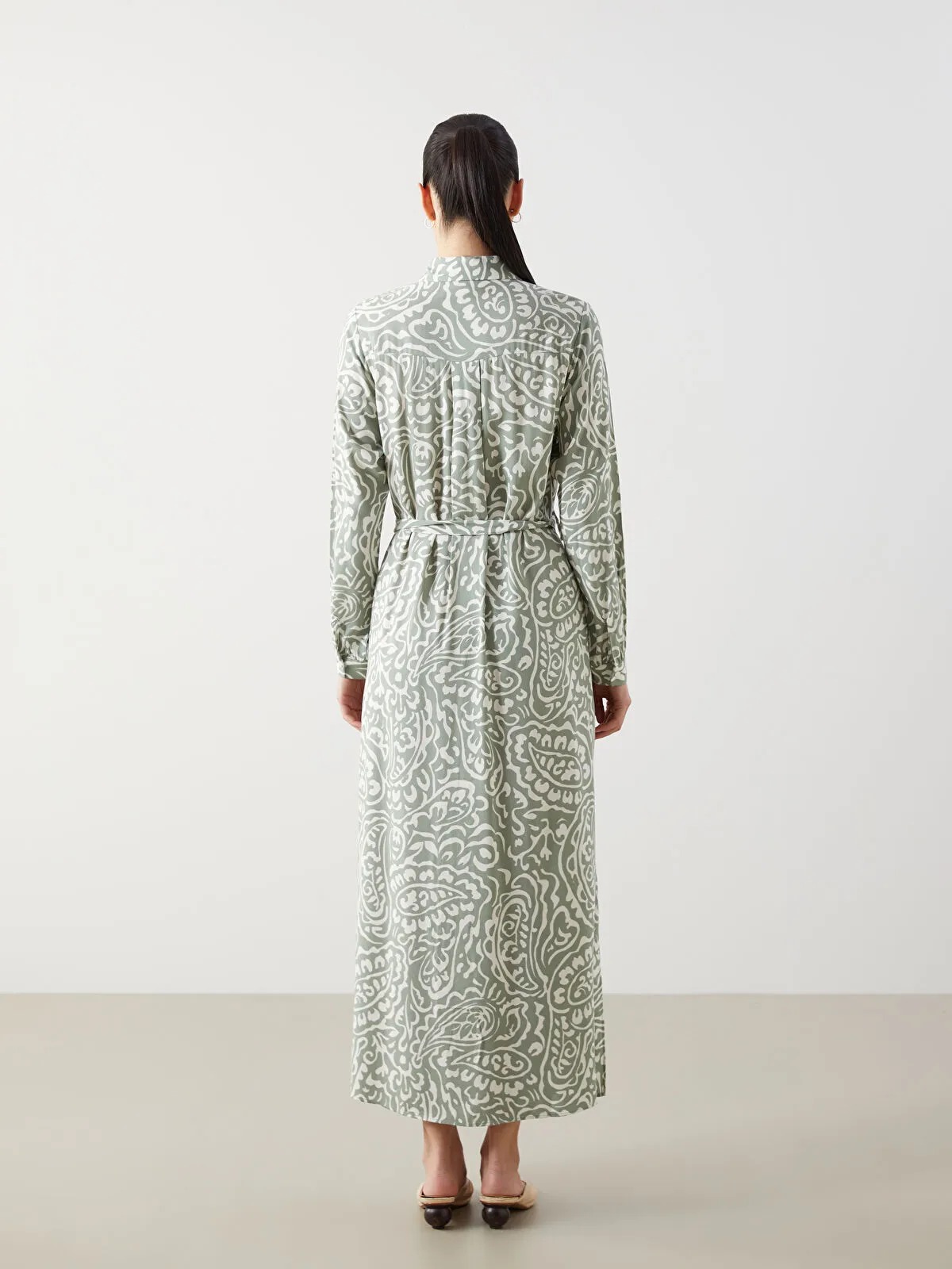 قصة واسعة (Loose & Bol) — تصميم بطول طويل بدون بطانة، بياقة قميص، أكمام طويلة، مزوّد برباط خصر لتعديل الطول وتحديد خفيف للخصر، تصميم عملي ومريح بالكامل