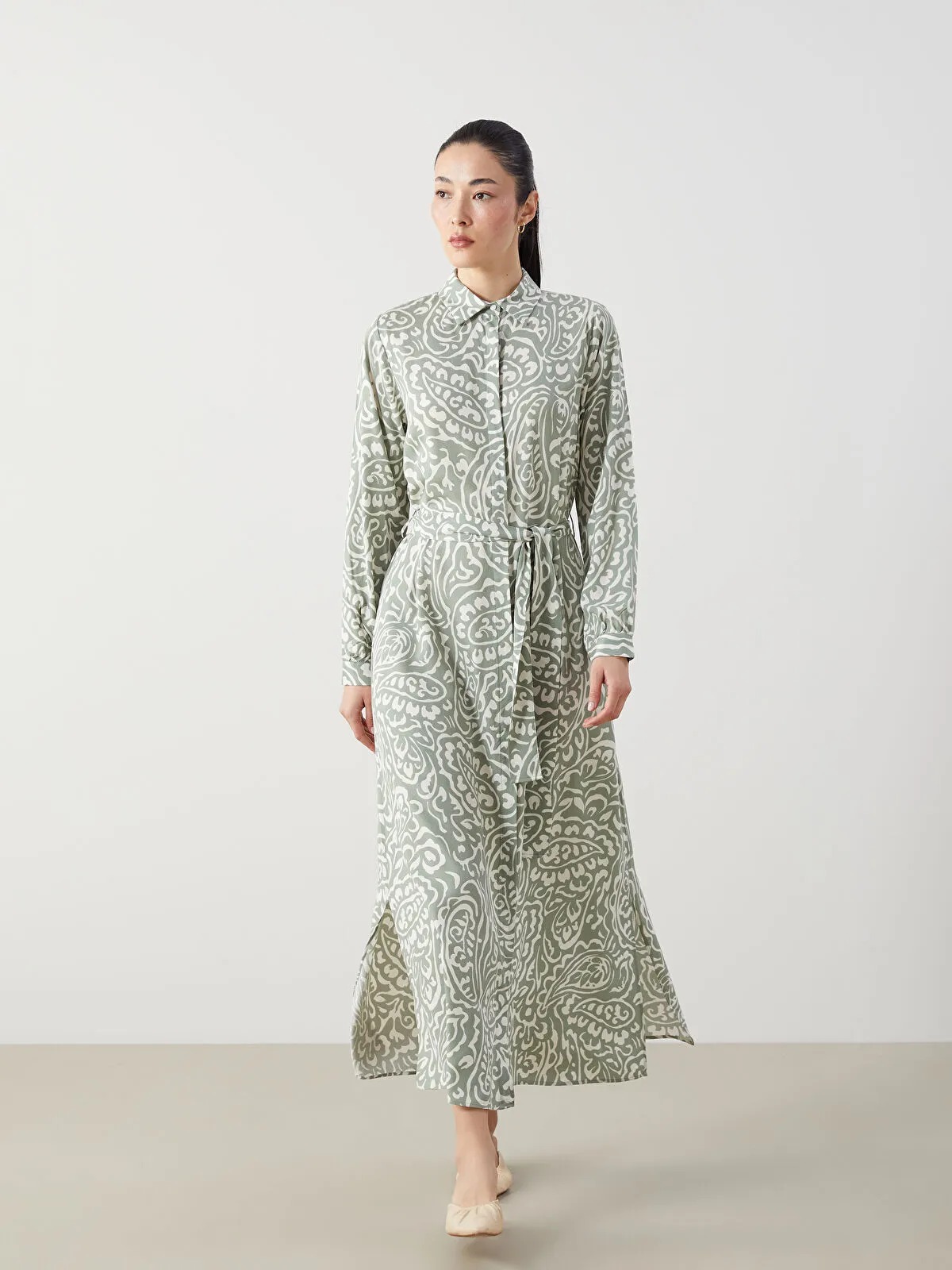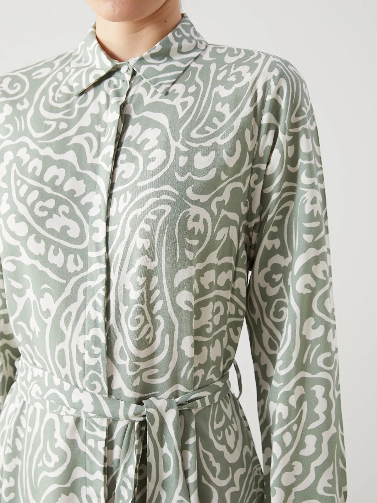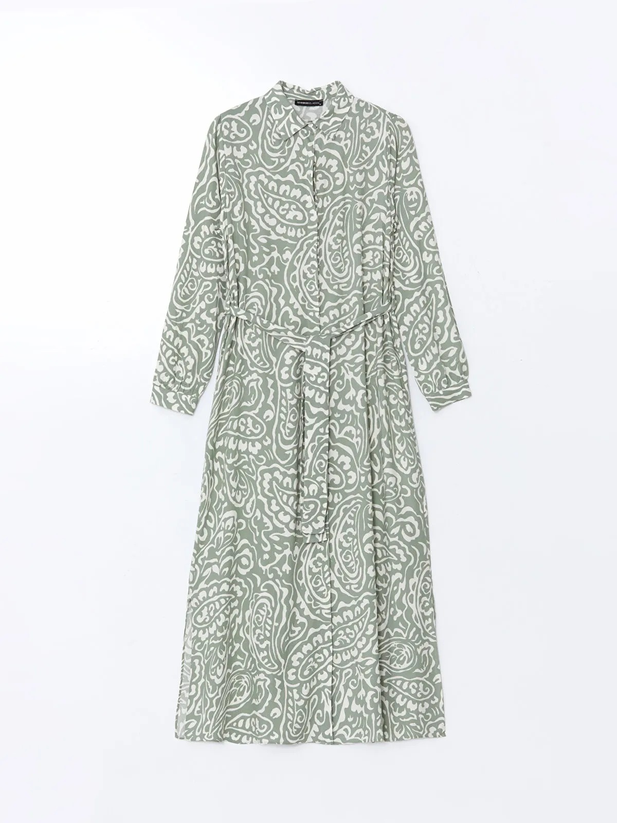 فستان نسائي بطبعة زهرية على خلفية خضراء، بتصميم قميص مريح بياقة قميص وأكمام طويلة، مزوّد بحزام عند الخصر لتحديد بسيط ومظهر أنيق ومرن يناسب الإطلالات اليومية والمناسبات الخفيفة.