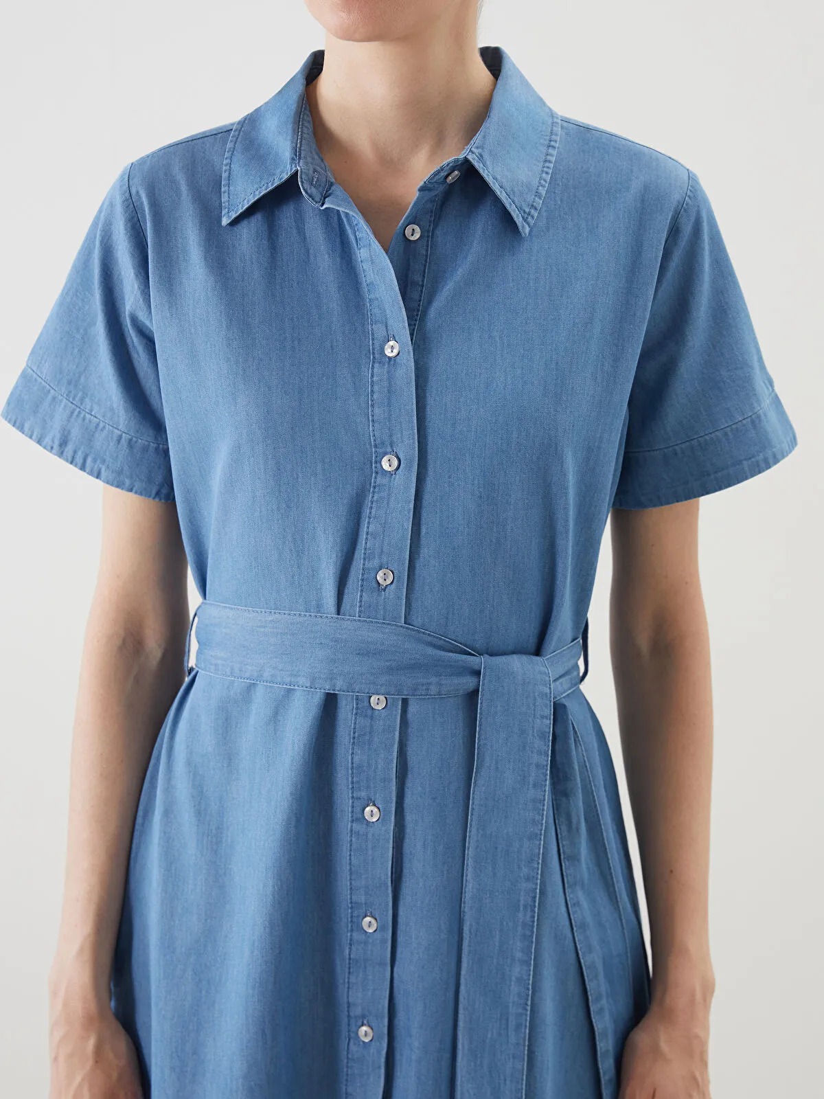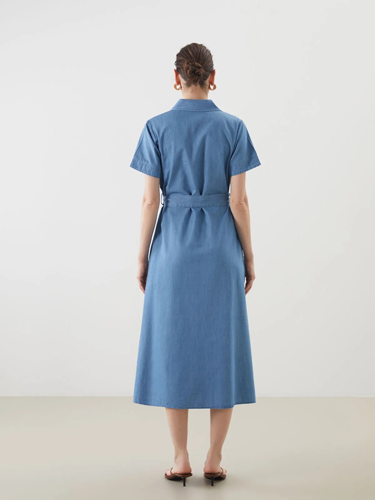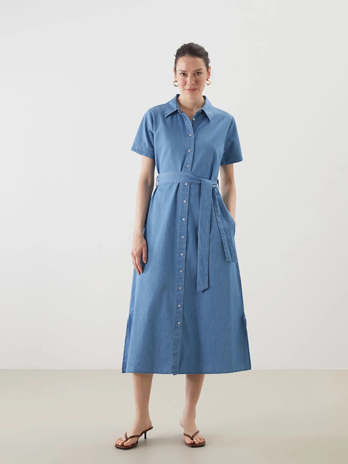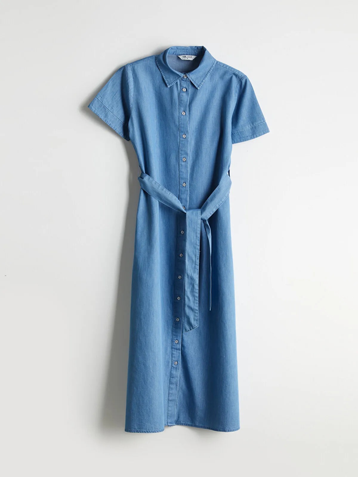 فستان دنيم بلون نيلي متوسط بطول Midi وتصميم قميص (Shirt Collar) أنيق بأكمام قصيرة. يتميز بمظهر كاجوال عملي يمكن تنسيقه بسهولة لإطلالة صيفية يومية أنيقة.