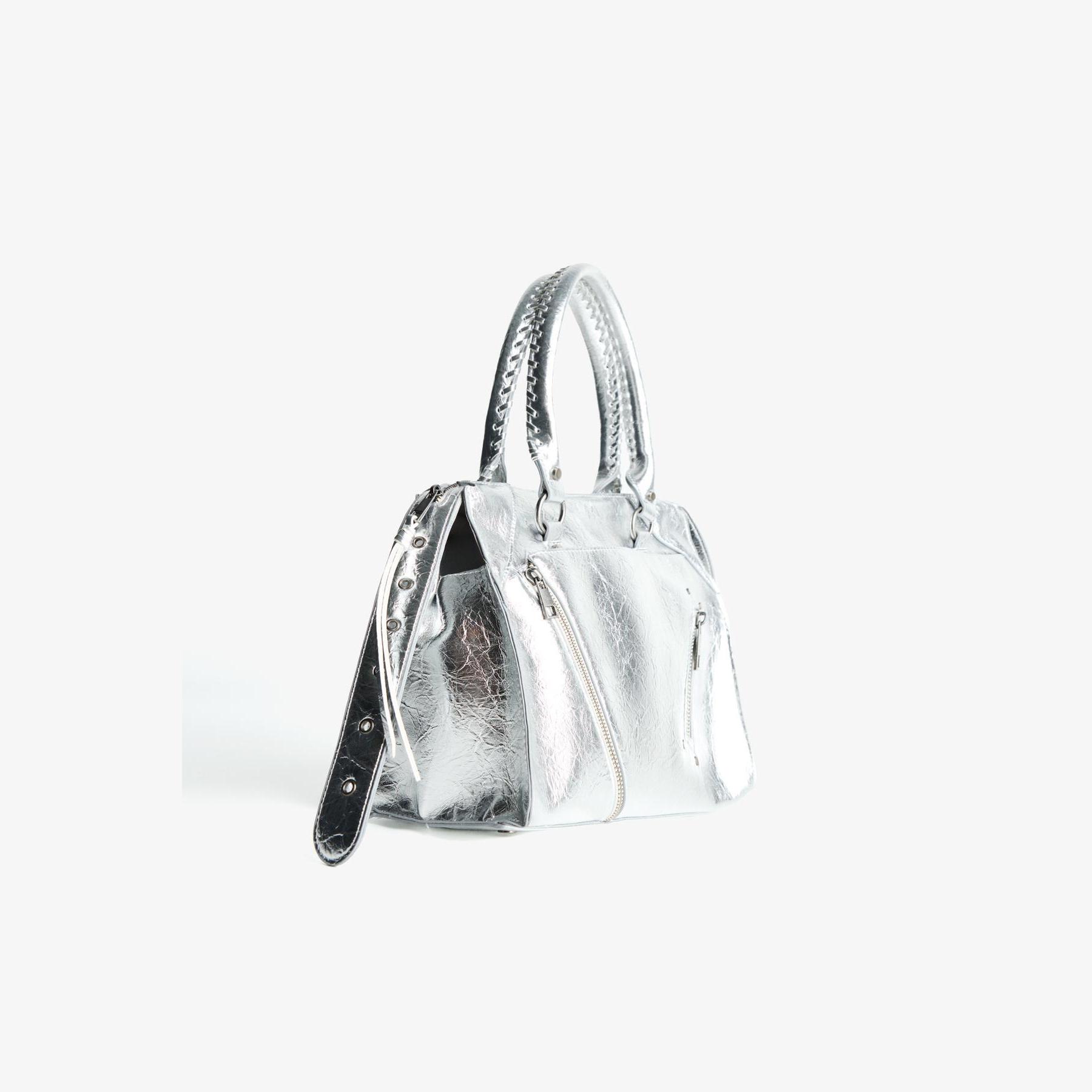 أضيفي لمسة براقة وعصرية إلى إطلالتك مع هذه الشنطة المتوسطة من Bershka. تصميمها بنقشة جلد صناعي مختلطة يمنحك مظهرًا مميزًا، بينما يضفي اللون الفضي إشراقة جريئة تناسب الإطلالات النهارية والمسائية.