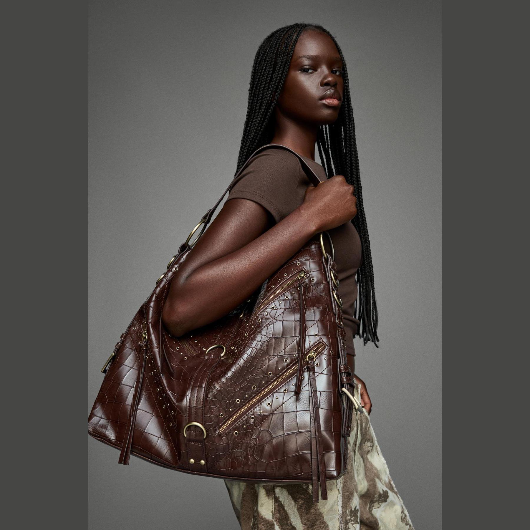 تميّزي بإطلالة قوية وعصرية مع هذه الشنطة الكبيرة من Bershka. تصميمها الجريء بنقشة جلد صناعي مستوحاة من طبعات الحيوانات، مزين بمسامير معدنية تضيف طابعًا مميزًا، بينما يمنحك اللون البني دفئًا حياديًا يناسب الإطلالات اليومية والمناسبات الخاصة.