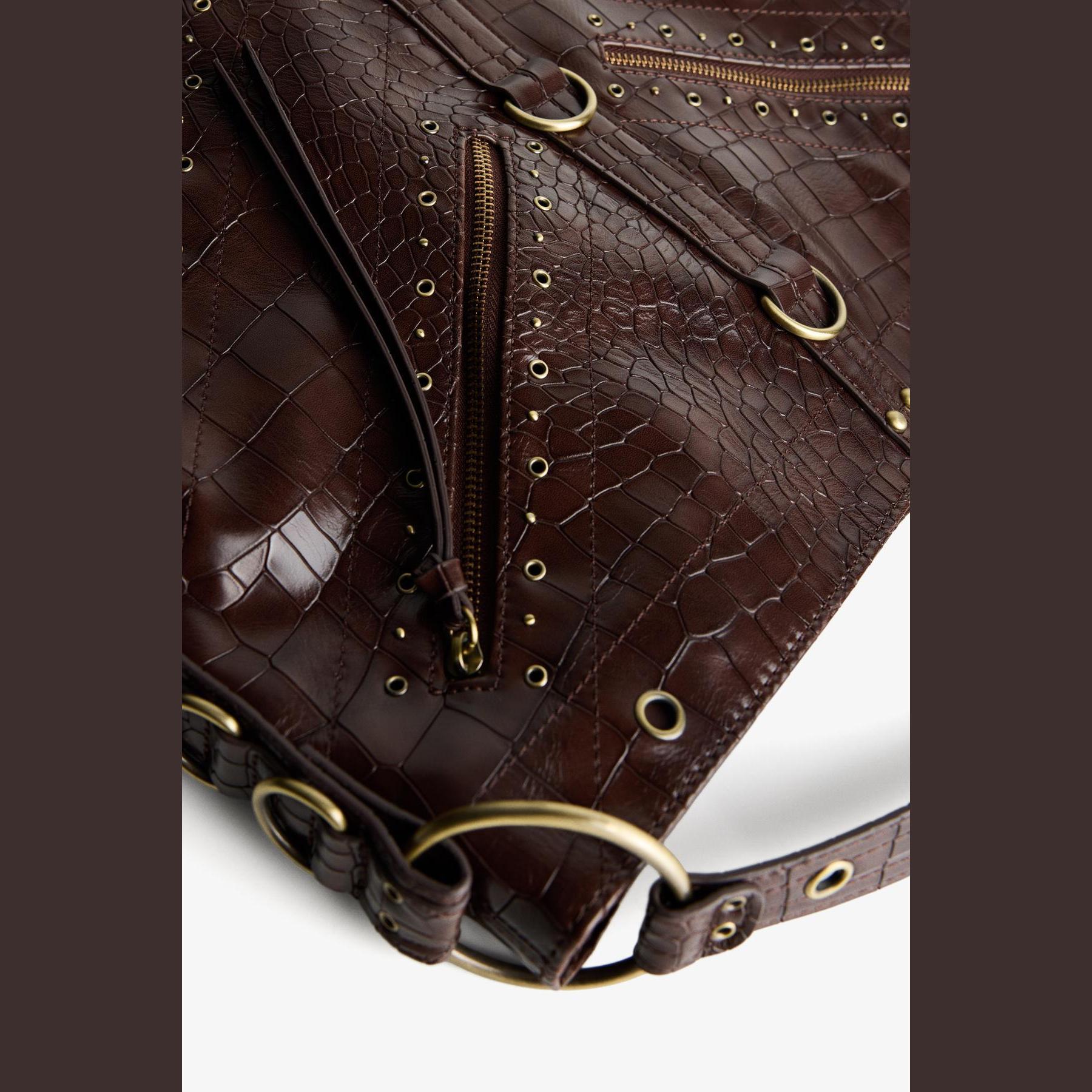 Bershka – شنطة ماكسي مزينة بالمسامير بنقشة جلد صناعي Animal بلون بني