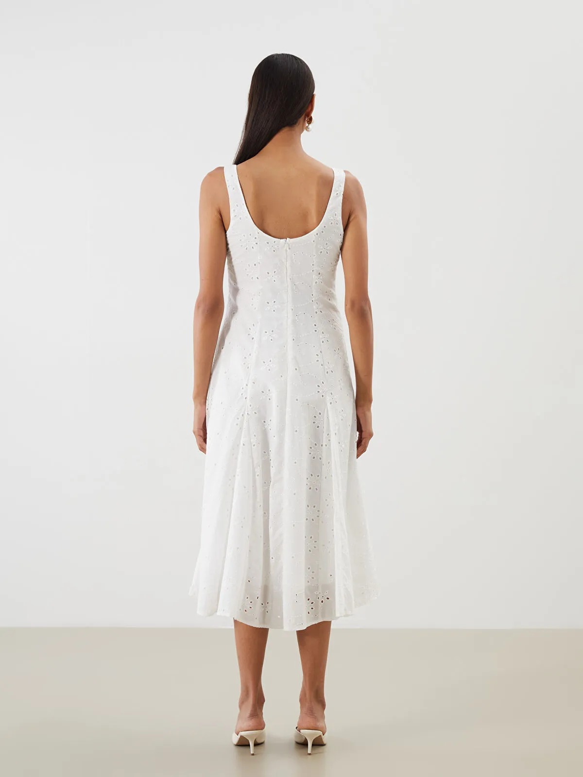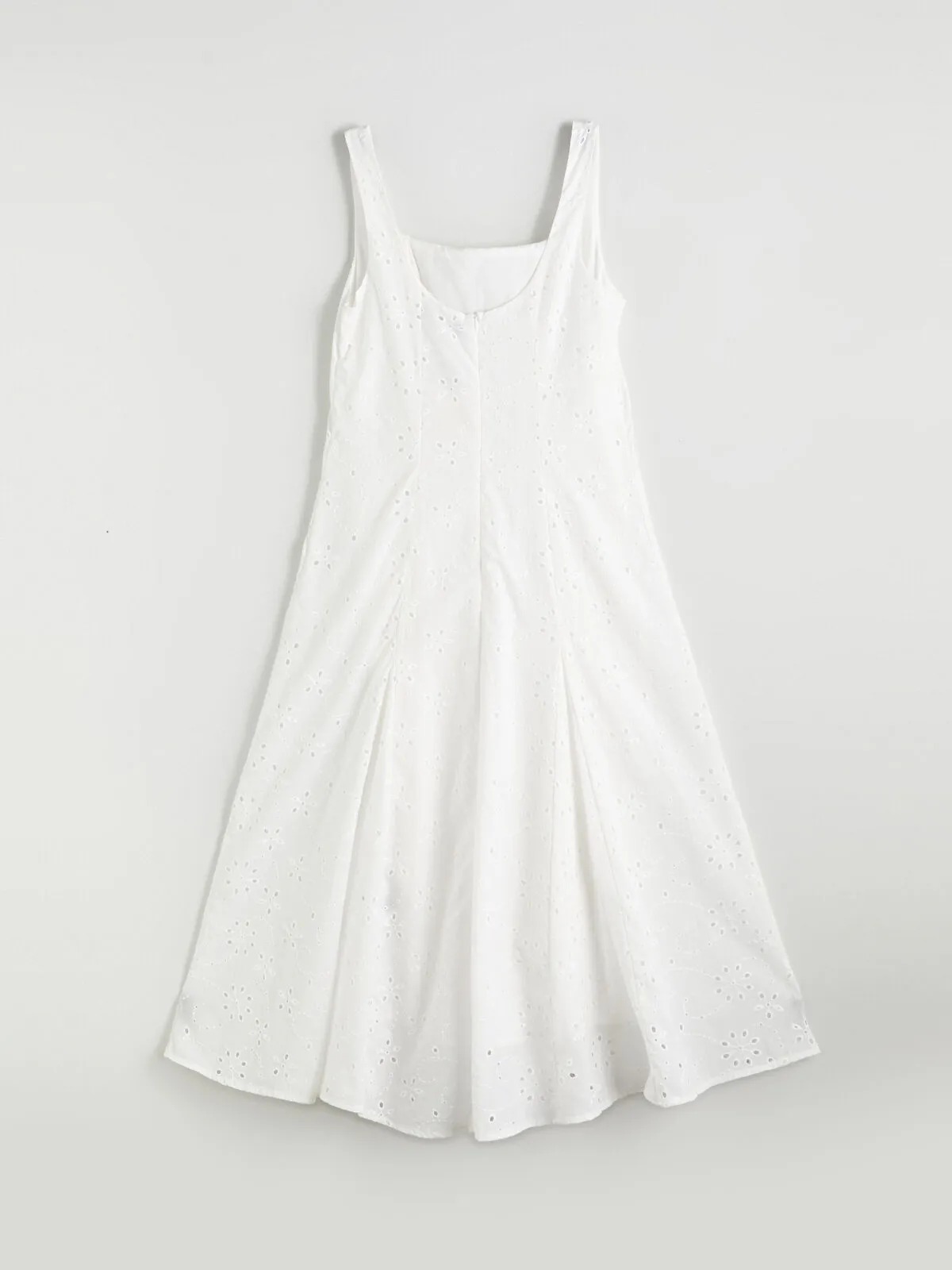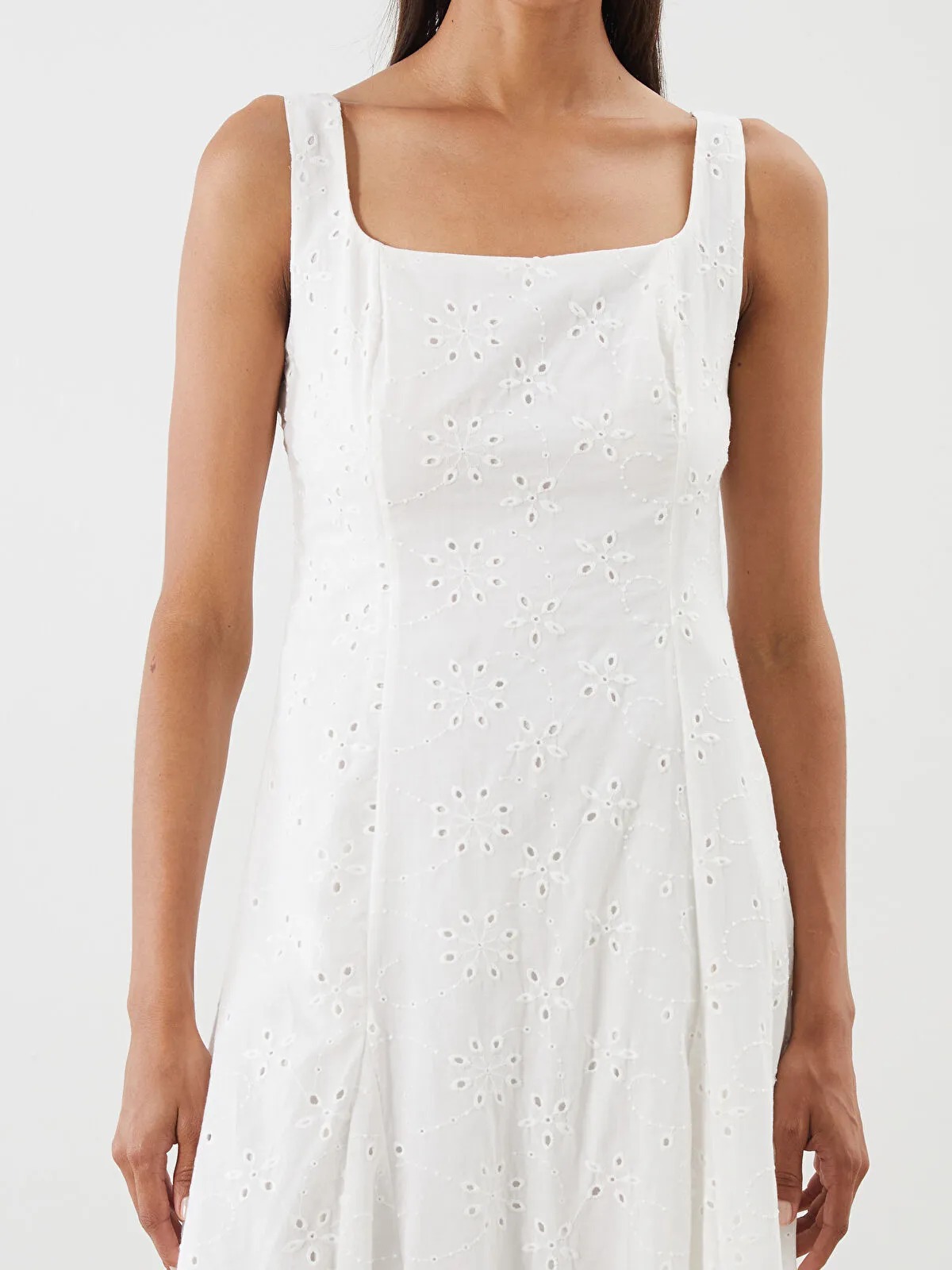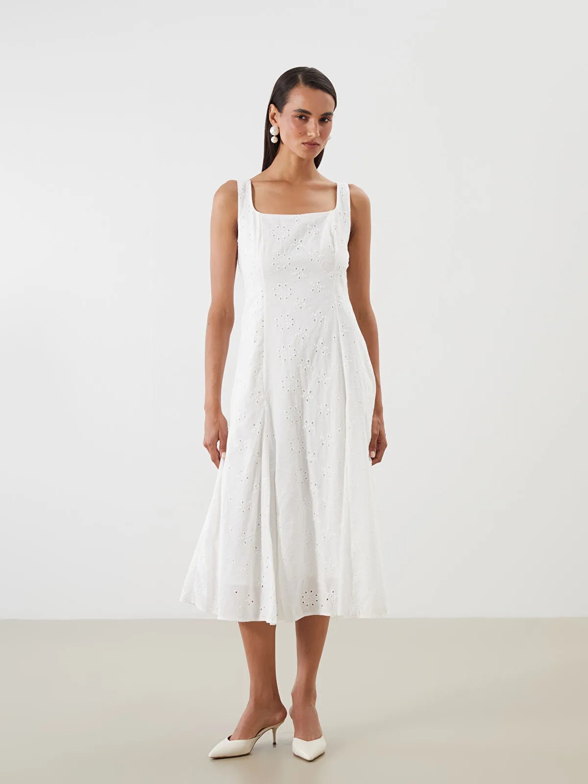 فستان أبيض أنثوي بياقة مربعة (Square Neck)، مصنوع من قماش Brode/Vual بنقشة نقوش محبوكة (Ajurlu)، مع خصر محدد لإضفاء توازن أنيق ومظهر مريح وجذاب.