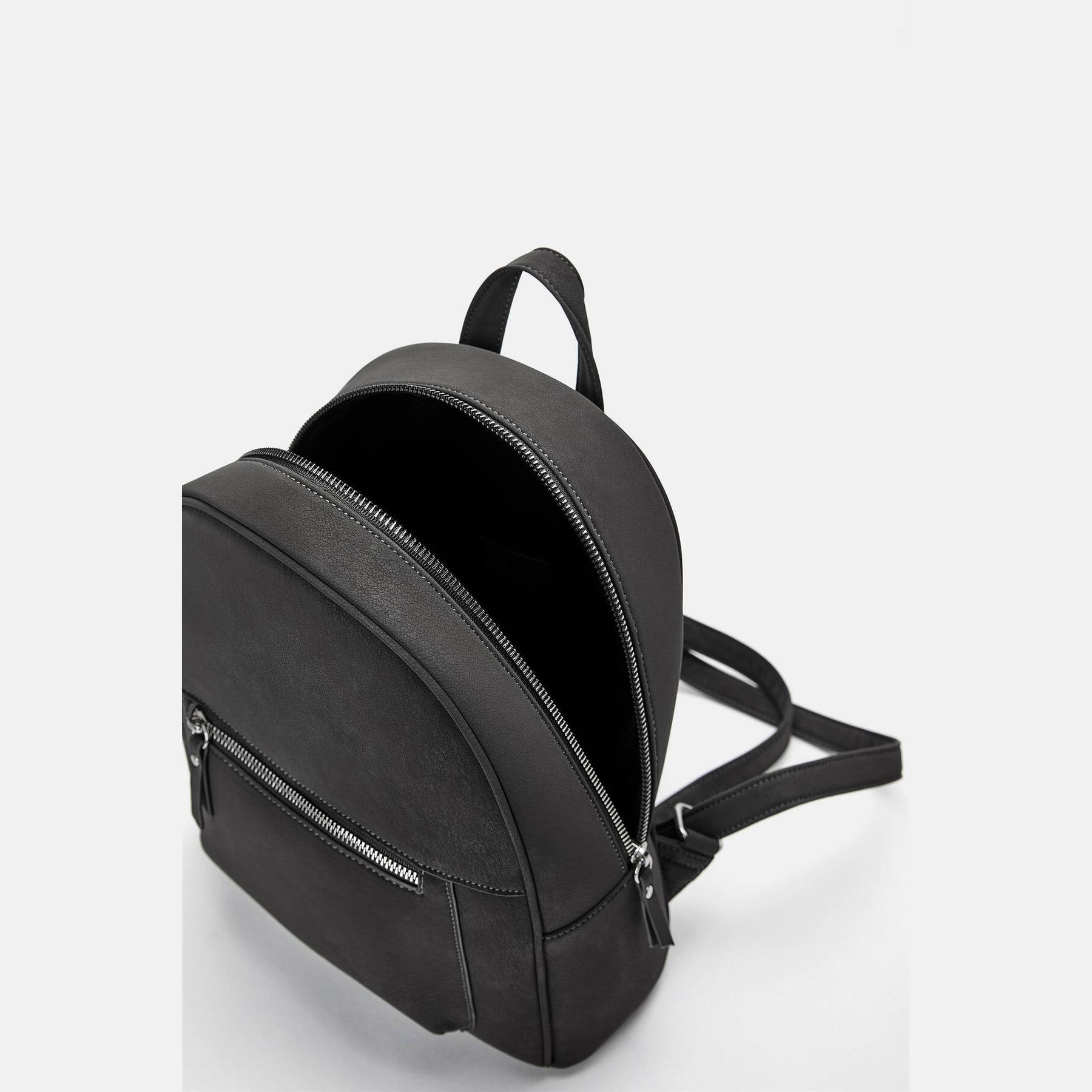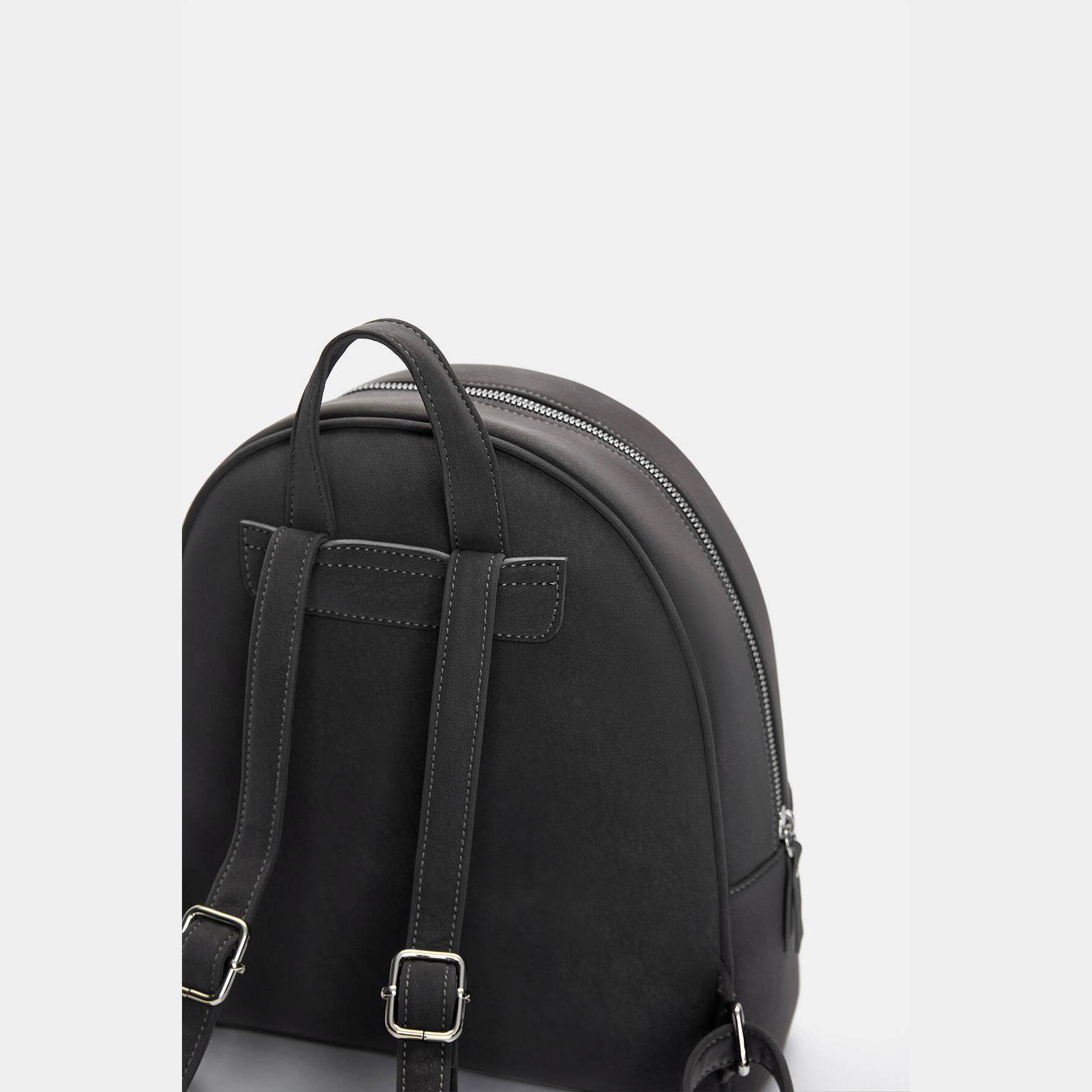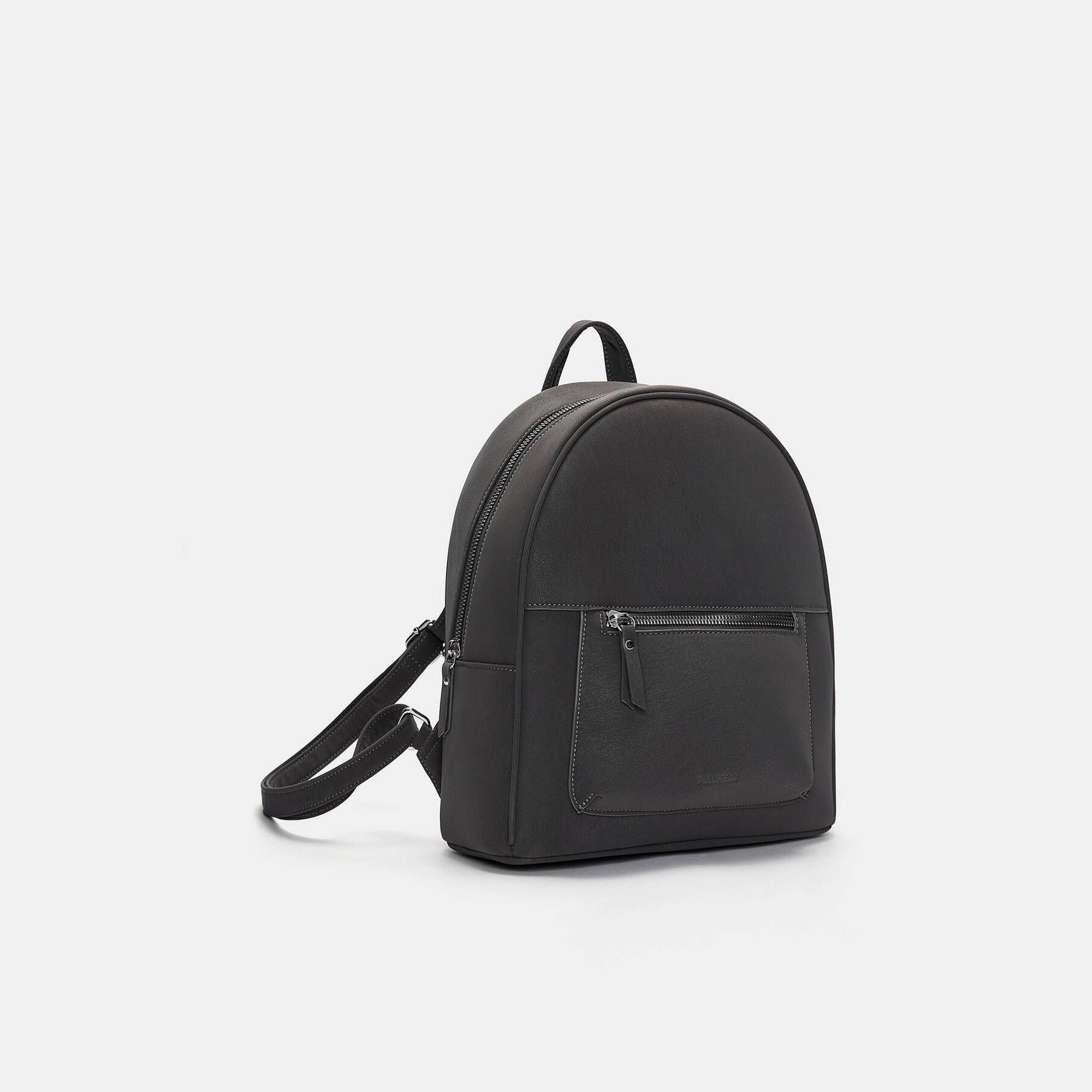 شنطة ظهر صغيرة من Pull & Bear مصنوعة من خامة بولي يوريثان بملمس مشمّع أنيق، بتصميم كلاسيكي يحتوي على جيب خارجي، مقابض متعددة، وسعة مثالية لحمل الأساسيات اليومية.