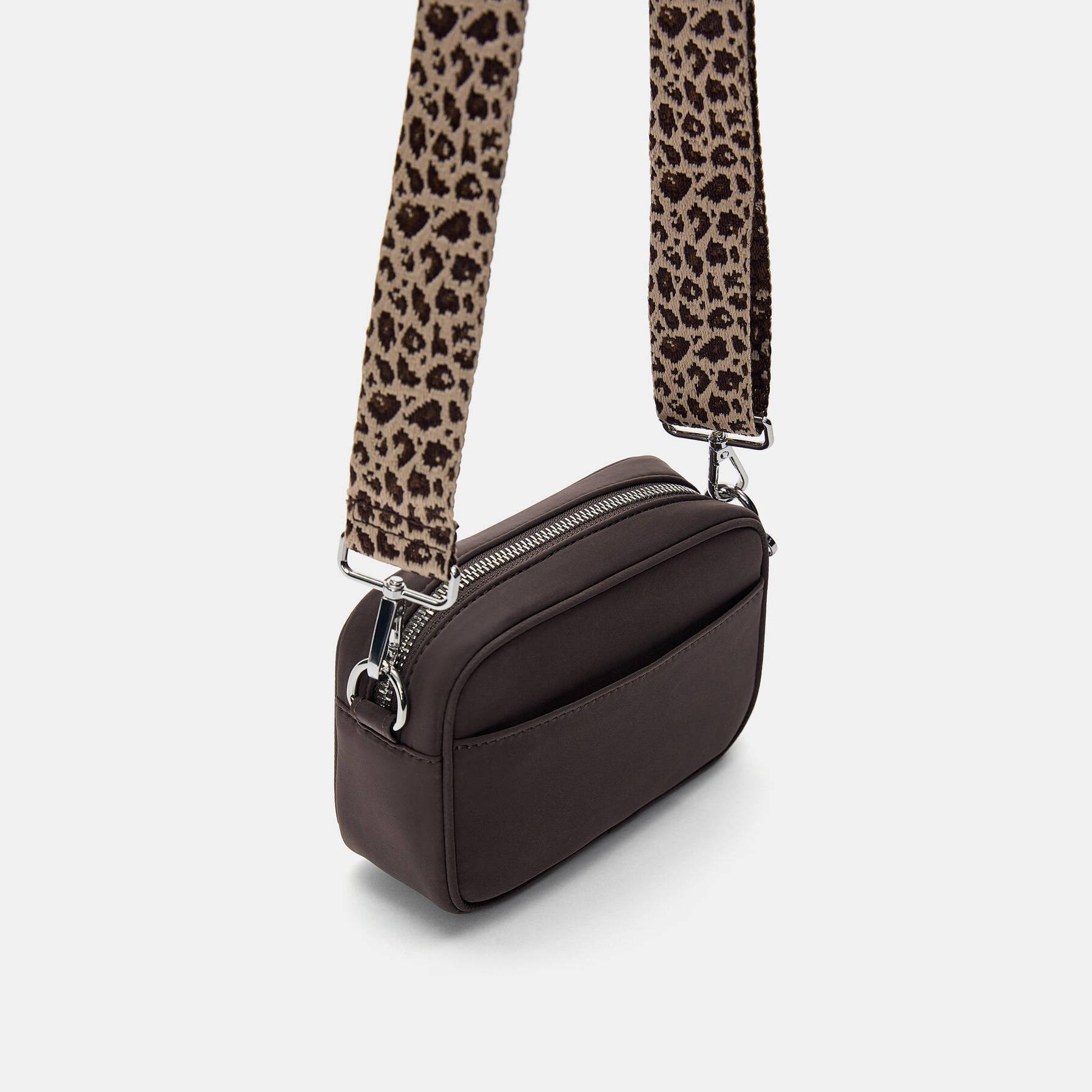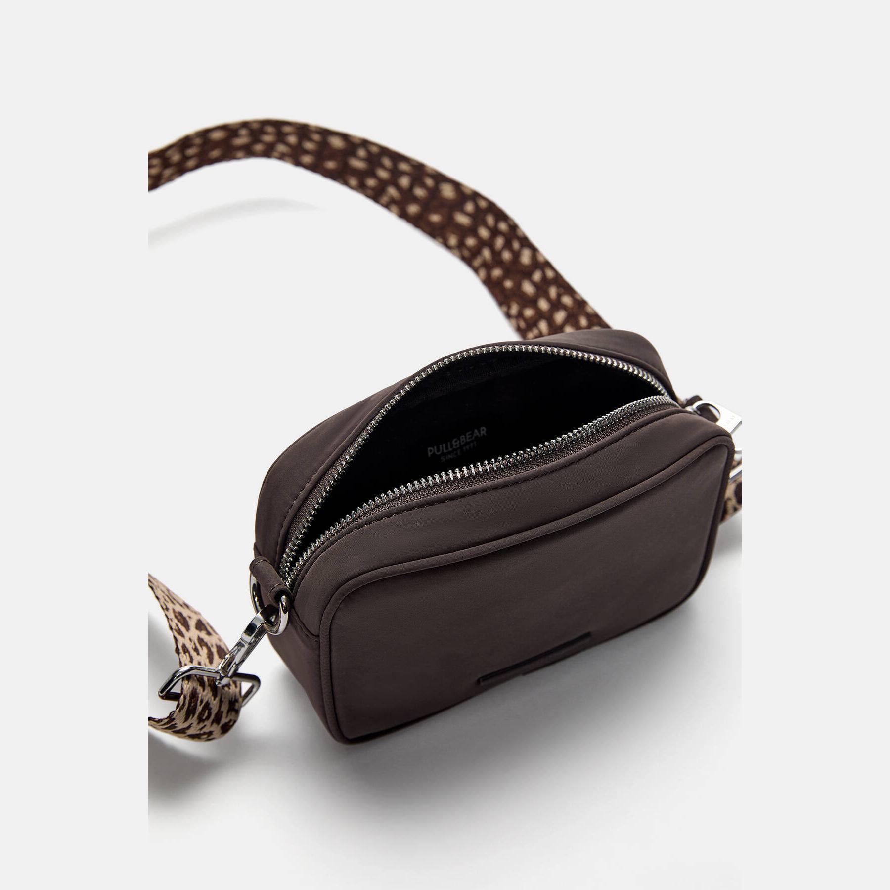 شنطة كروس صغيرة من Pull & Bear مصنوعة من خامة بوليستر بملمس مطاطي، بتصميم عملي يحتوي على جيب خارجي، حمالة قابلة للتعديل والإزالة بنقشة ليوبارد، وسحاب علوي لحفظ الأساسيات بأمان.
