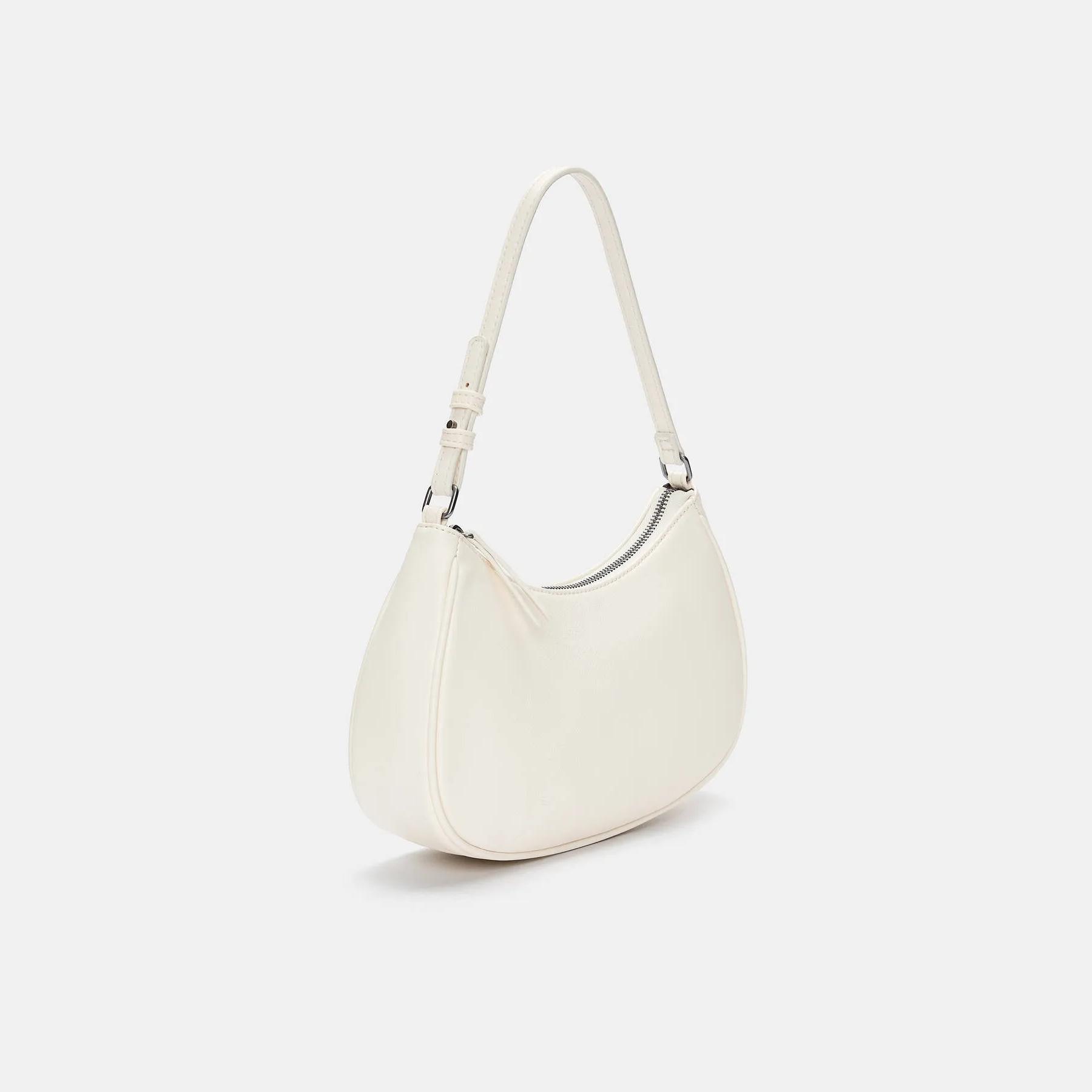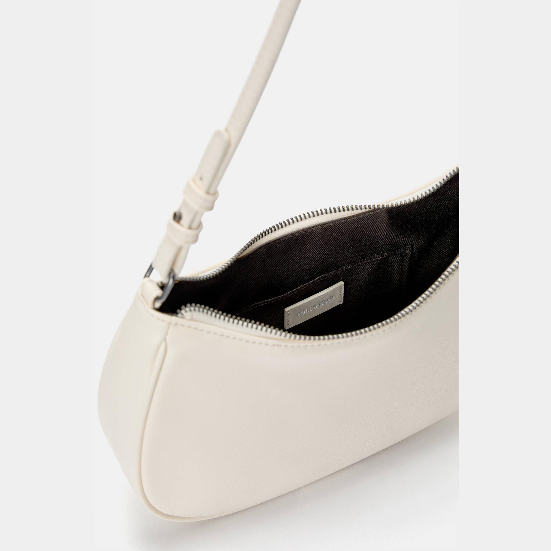 شنطة كتف أنيقة من Pull & Bear مصنوعة من خامة بولي يوريثان بملمس ناعم، بتصميم منحني بشكل هلال يحتوي على سحاب علوي، حمالة قصيرة قابلة للتعديل، ولمسة حيادية تناسب الإطلالات اليومية.