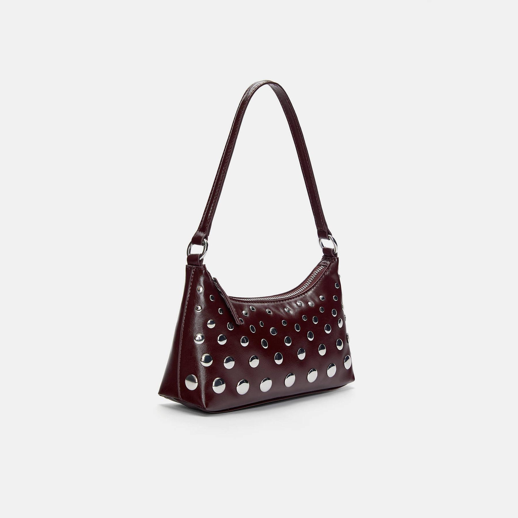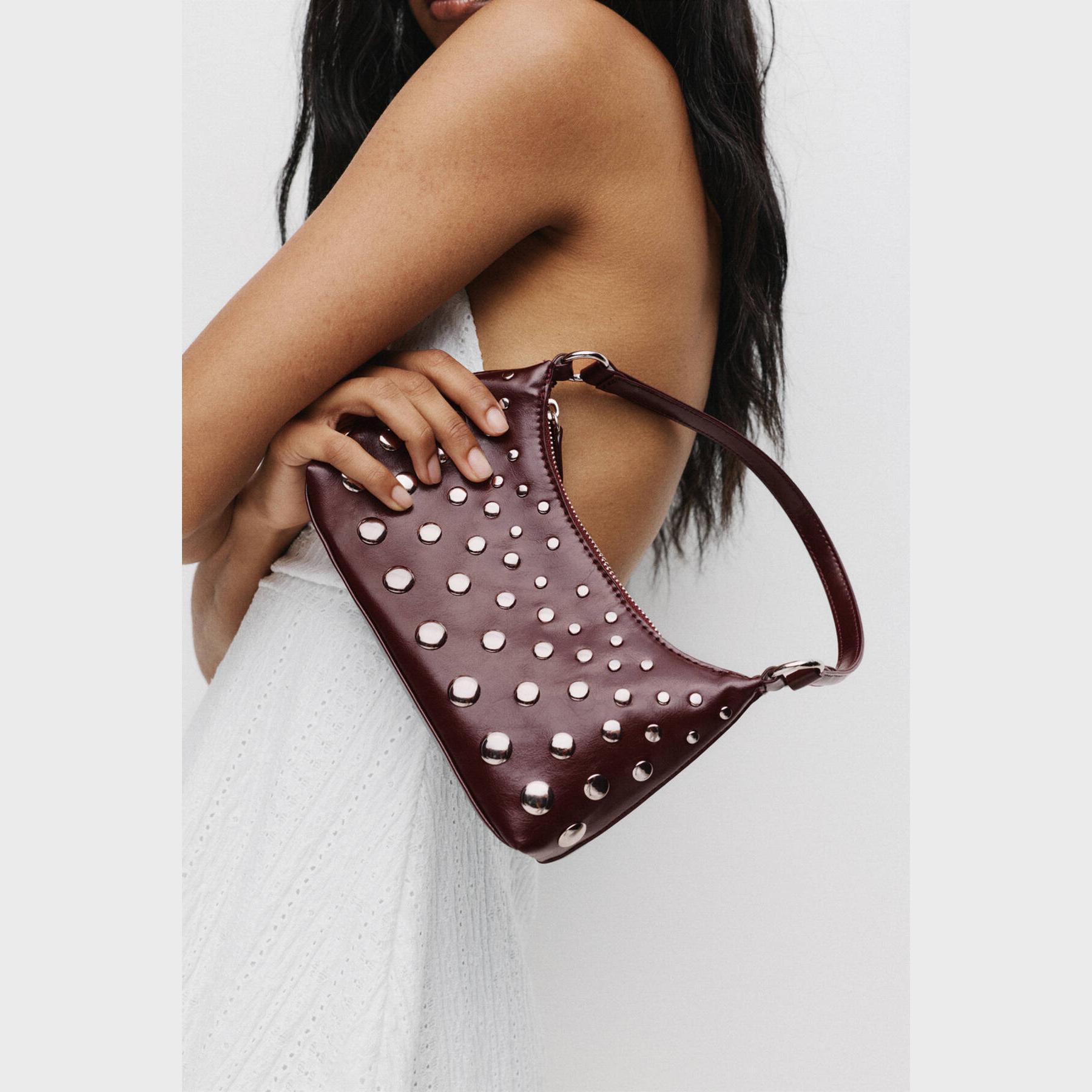 شنطة كتف صغيرة من Pull & Bear مصنوعة من خامة بولي يوريثان بملمس ناعم، بتصميم أنيق يحتوي على سحاب علوي، شرائط زخرفية بمسامير، وحمالة كتف قصيرة تضيف لمسة جريئة للإطلالة.