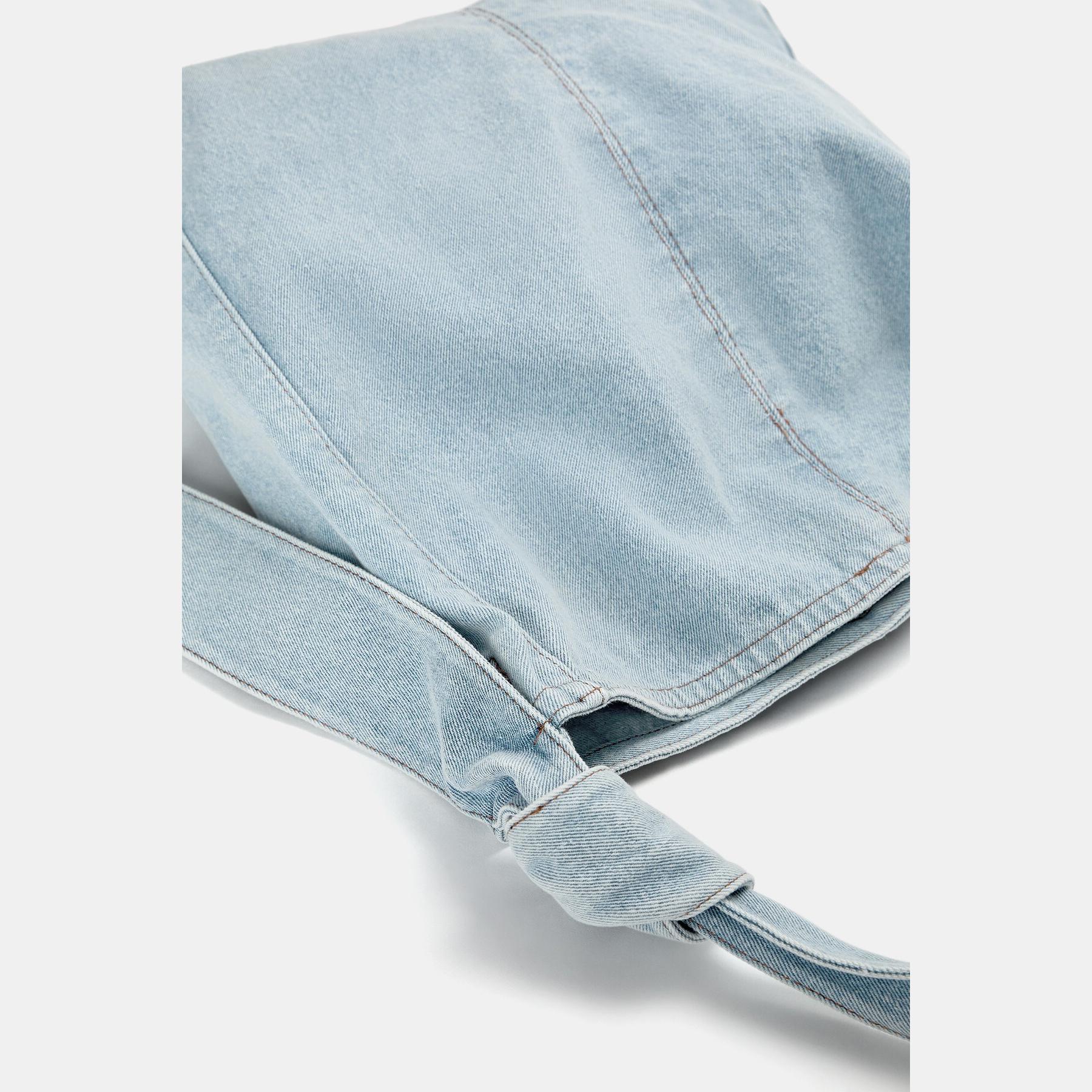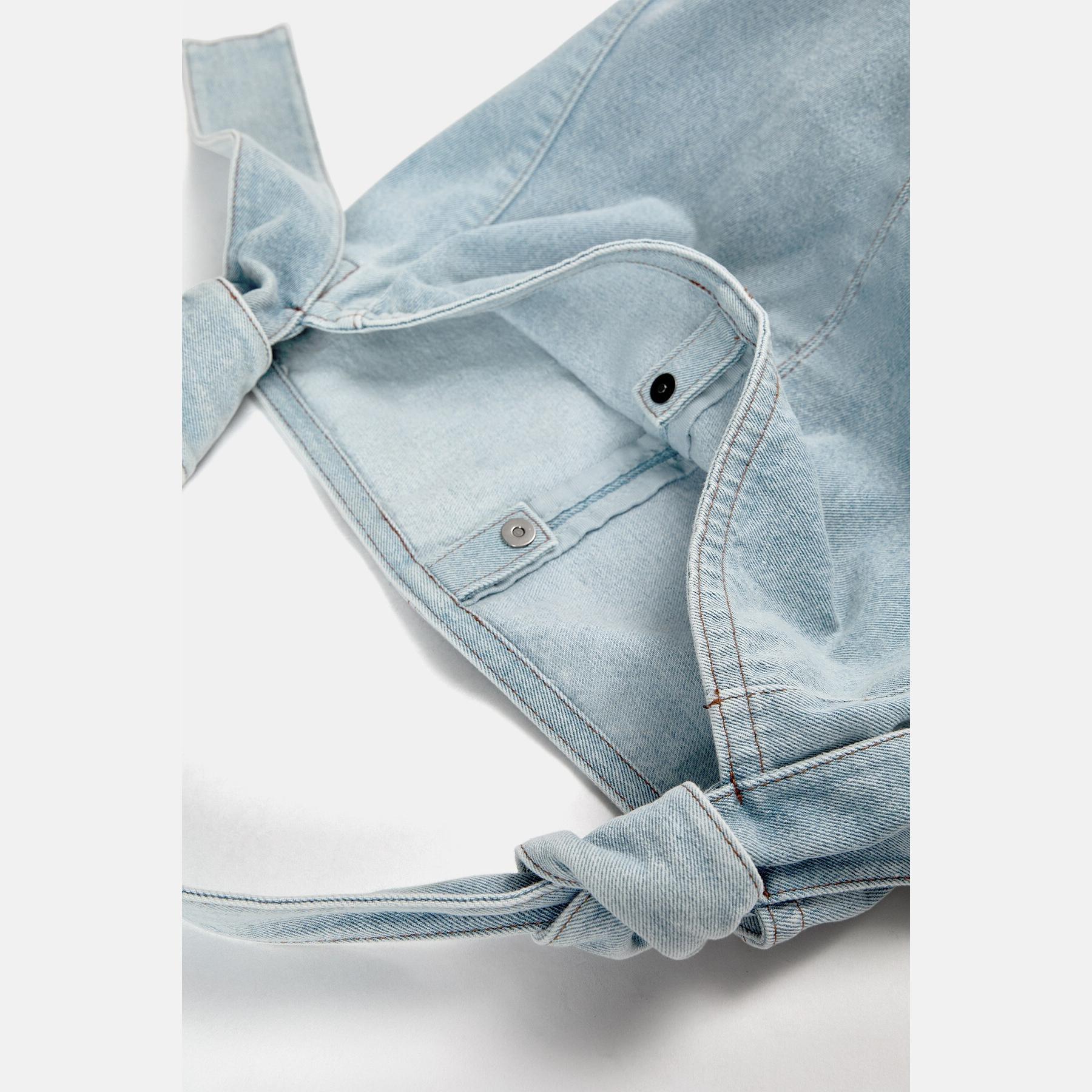 شنطة Tote واسعة من Pull & Bear مصنوعة من خامة دنيم قطنية، بتصميم عملي يحتوي على سحاب علوي، مقابض طويلة مريحة، وتفاصيل عقدة في الحمالة تضيف لمسة عصرية.