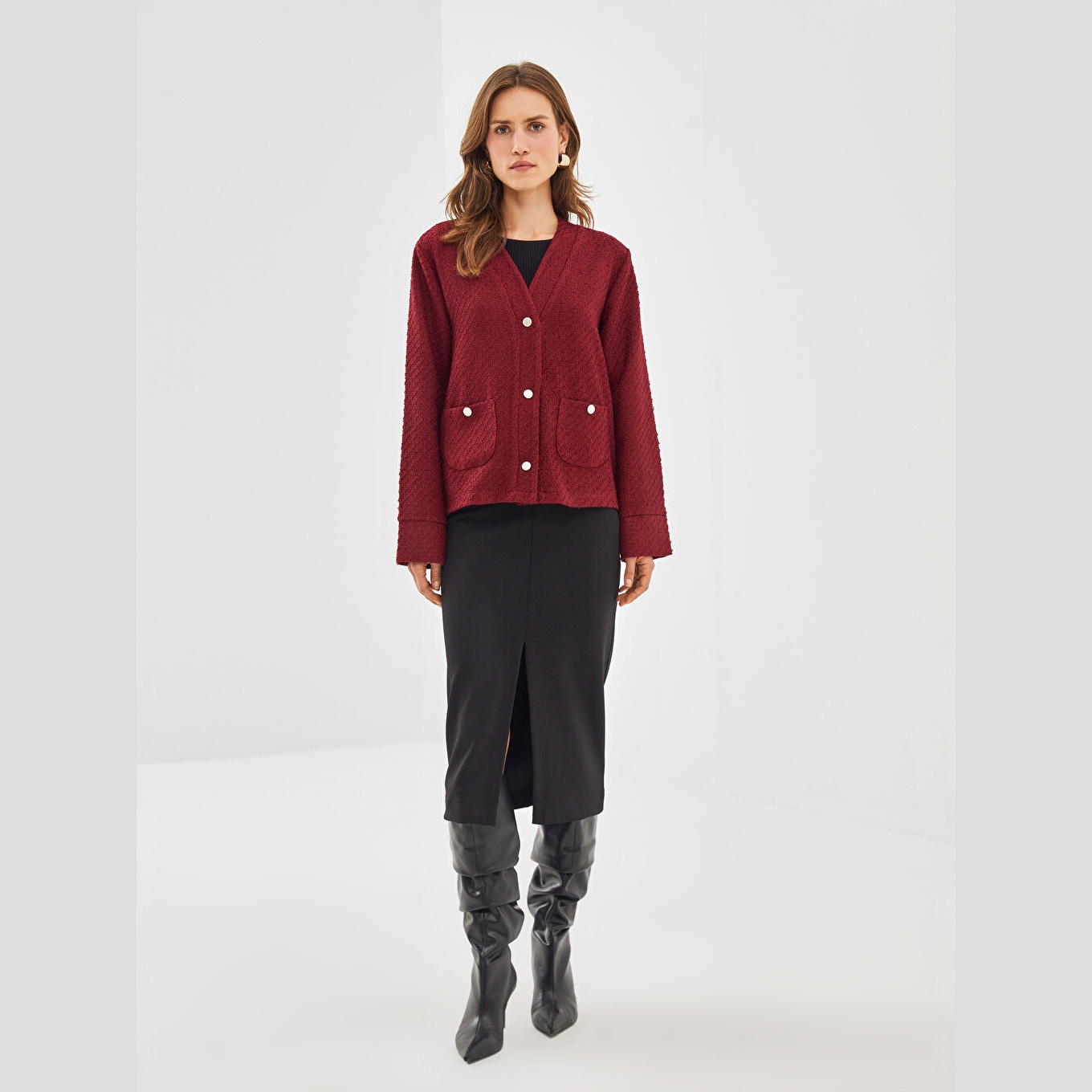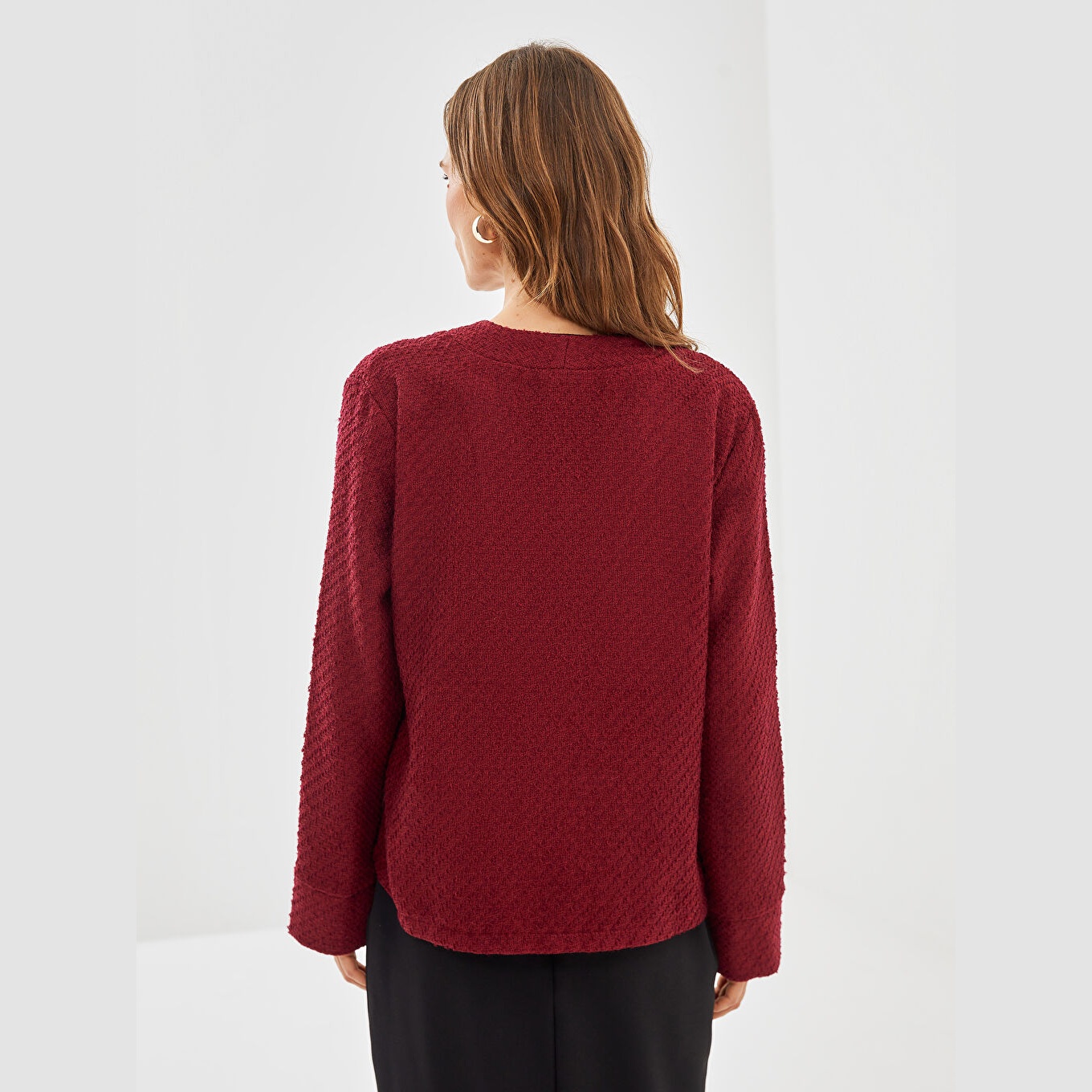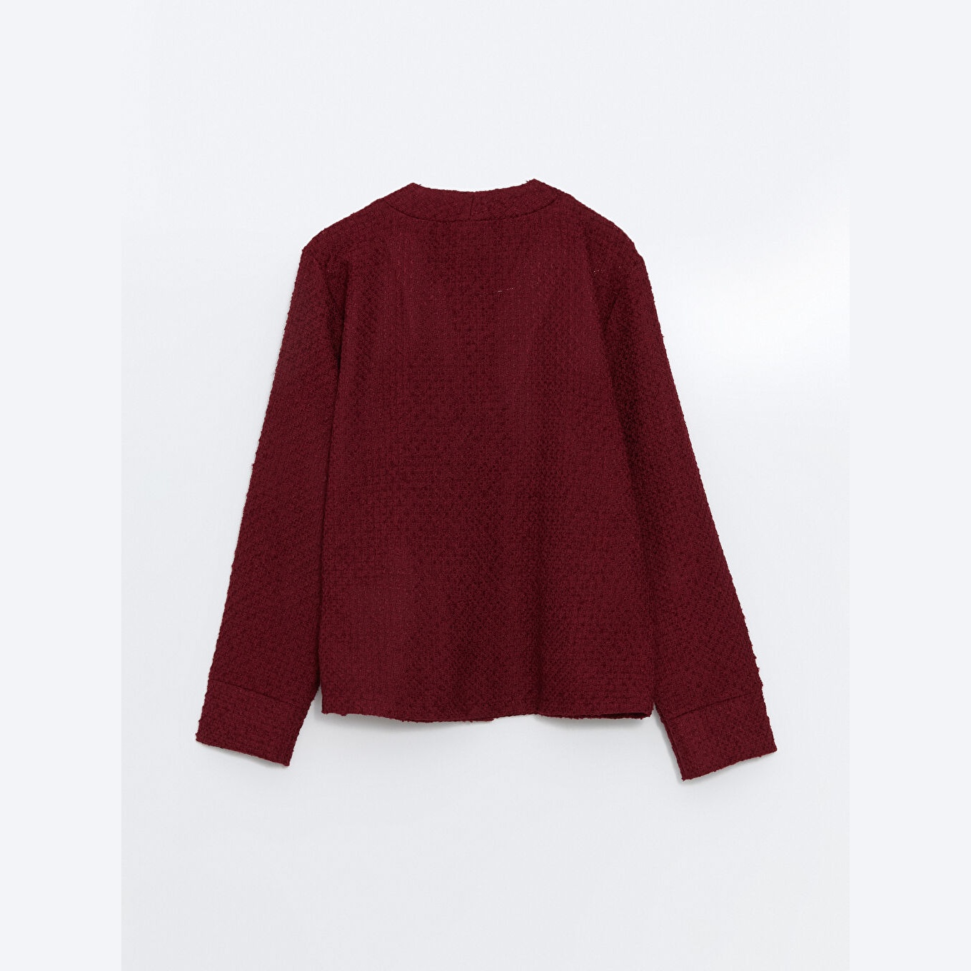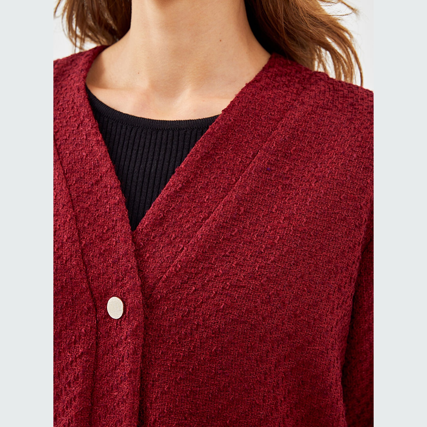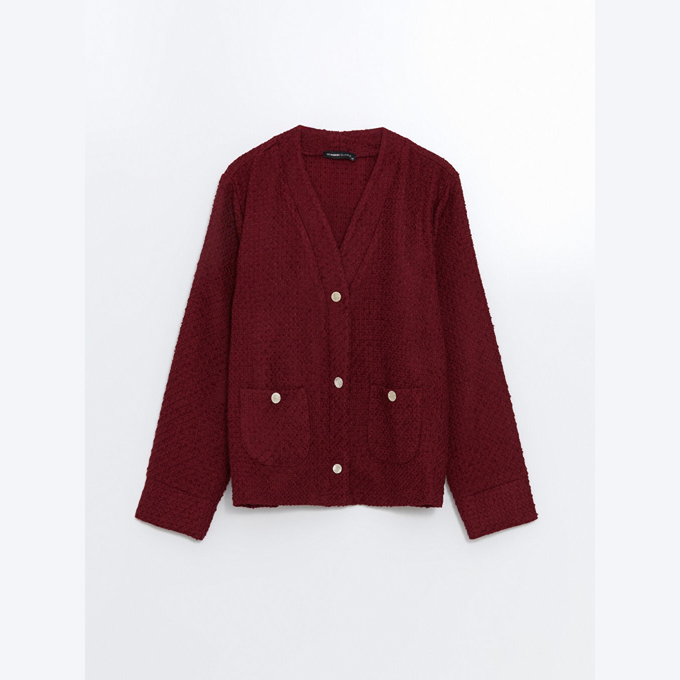 كارديغان نسائي بياقة V من LCW Classic – بوردو (قصة واسعة، خامة تويد متوسطة السماكة، تصميم سادة أنيق)