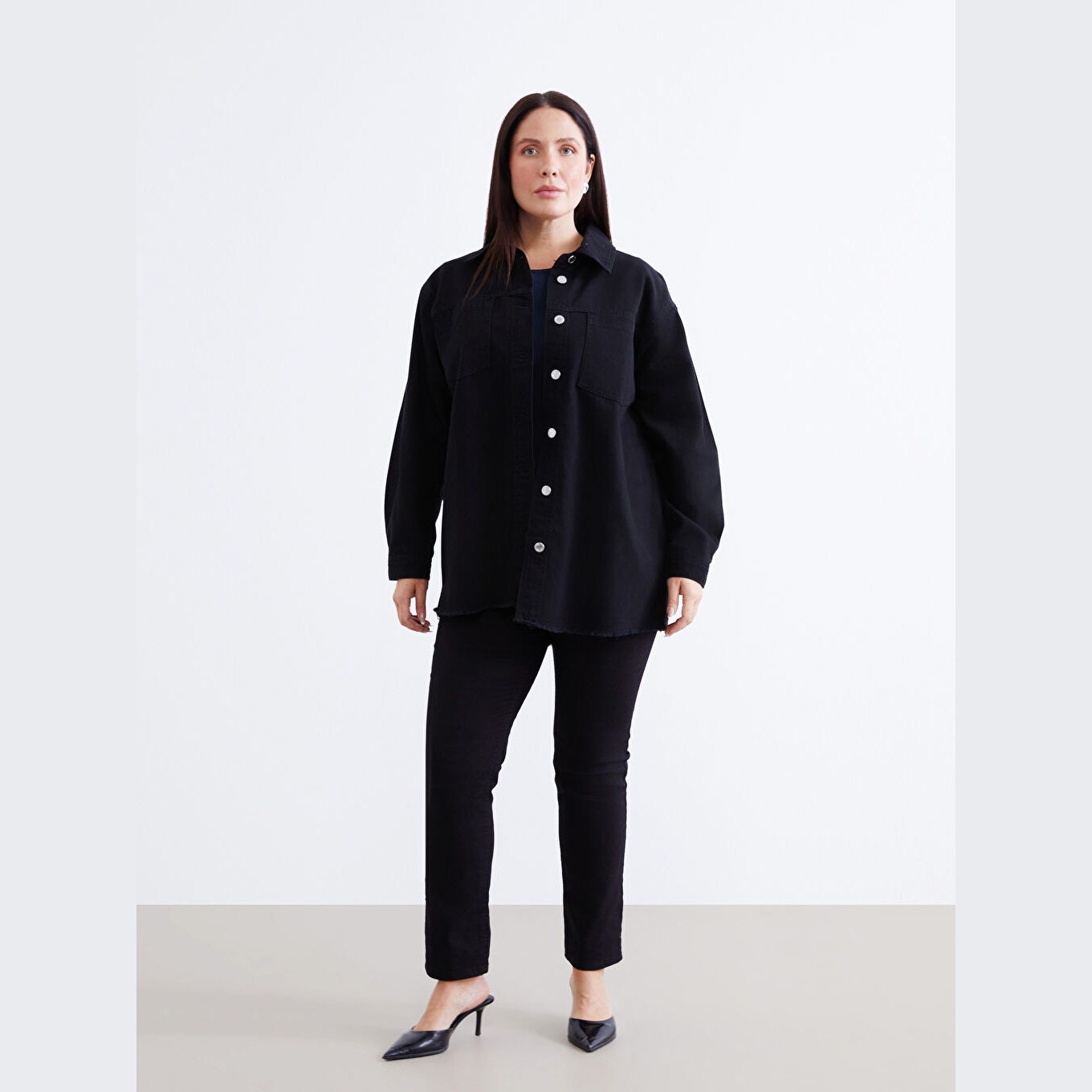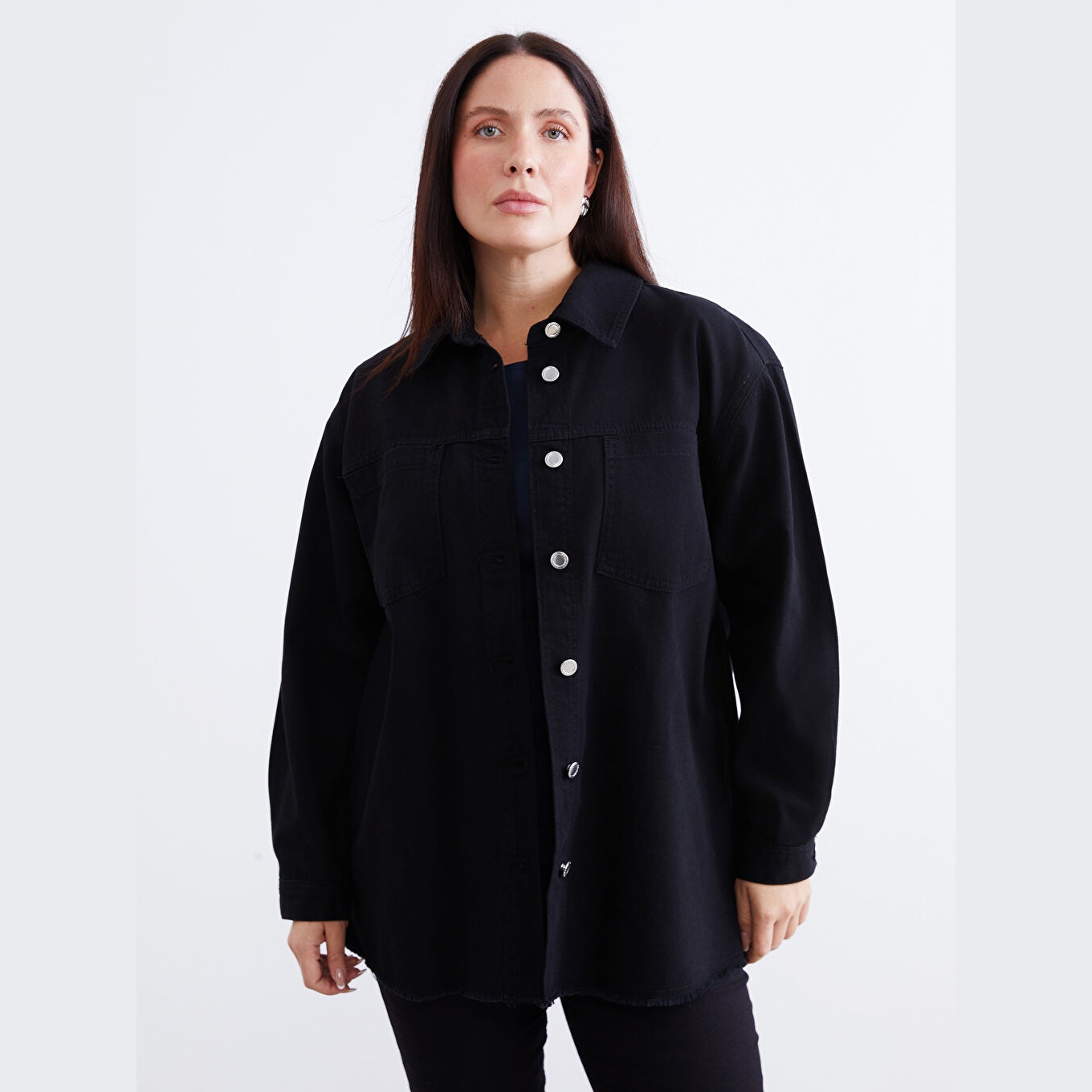 جاكيت جينز نسائي بقصة واسعة من LCW Classic – أسود (قصة أوفرسايز، خامة دنيم قطنية، تصميم سادة بأزرار، ضمن مجموعة المقاسات الكبيرة)