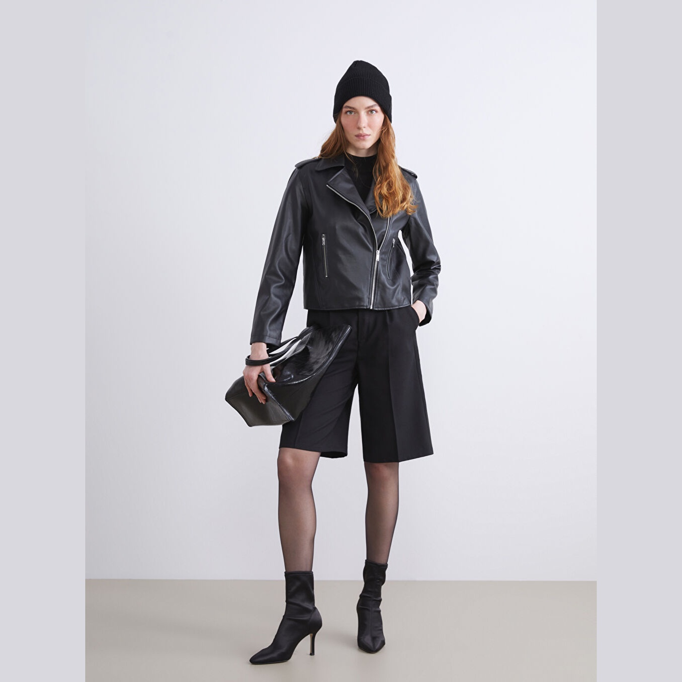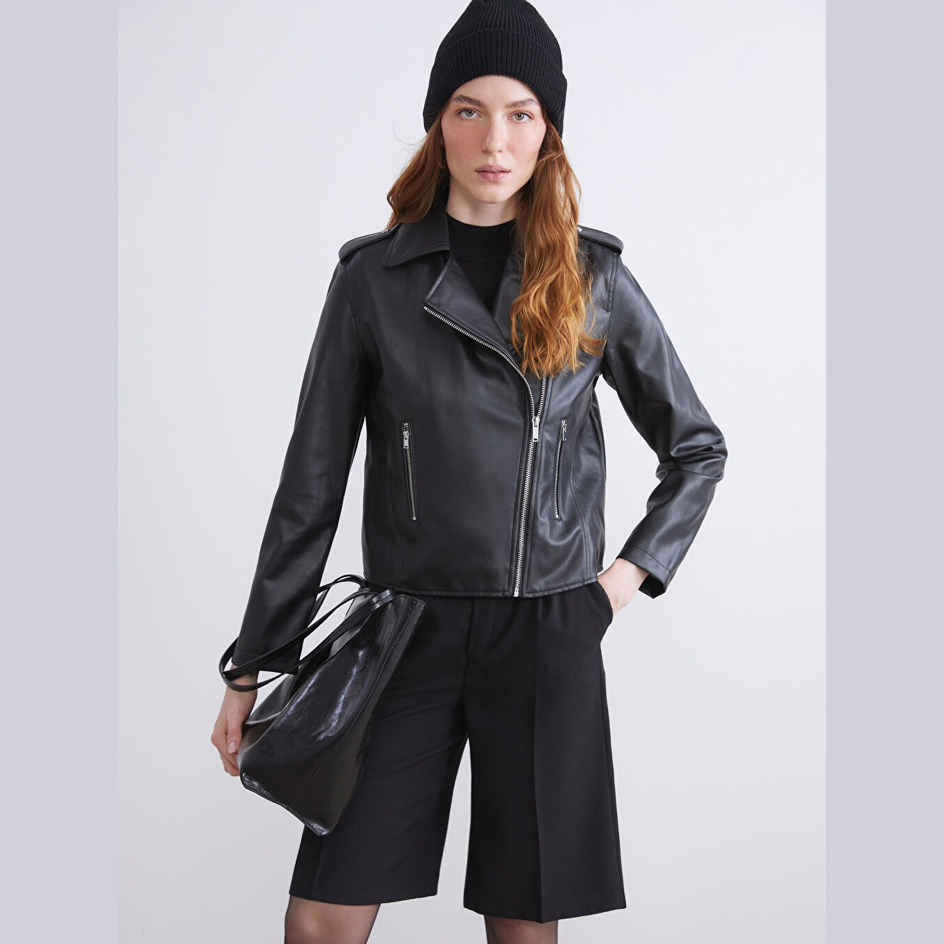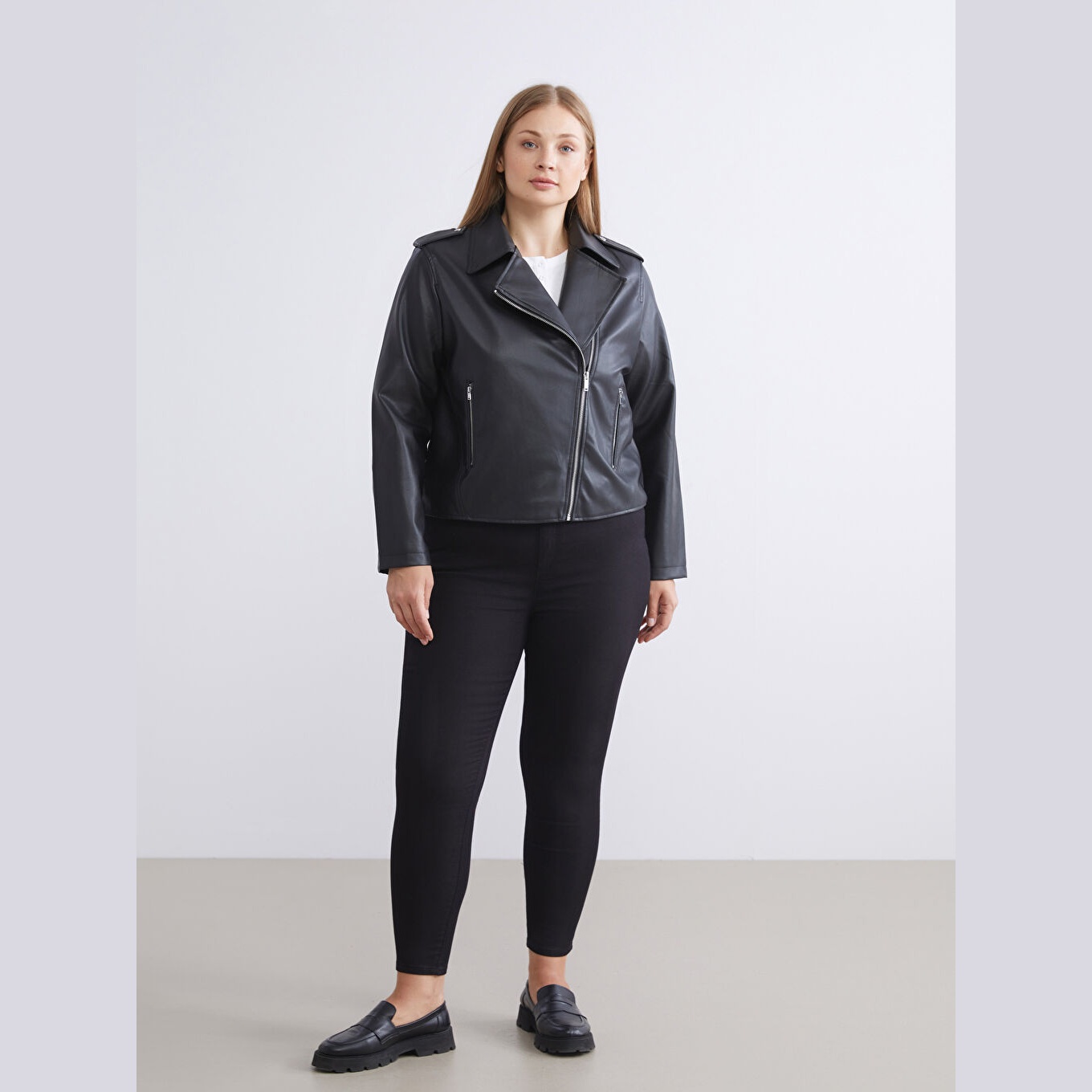 جاكيت نسائي جلد صناعي بياقة بايكر من LCWAIKIKI Classic – أسود (قصة قياسية، تصميم قصير، مبطّن بالكامل، مثالي للمقاسات الكبيرة)
