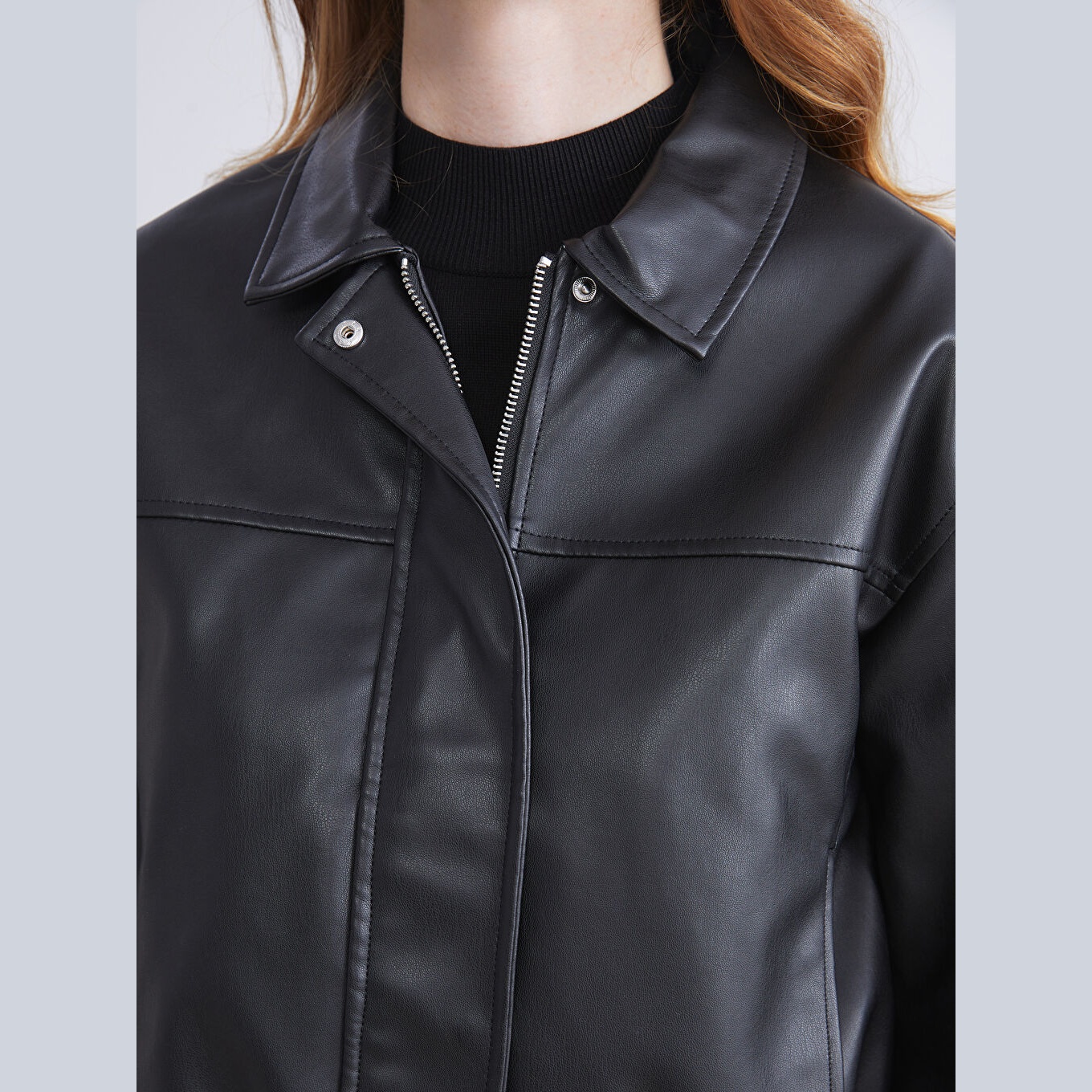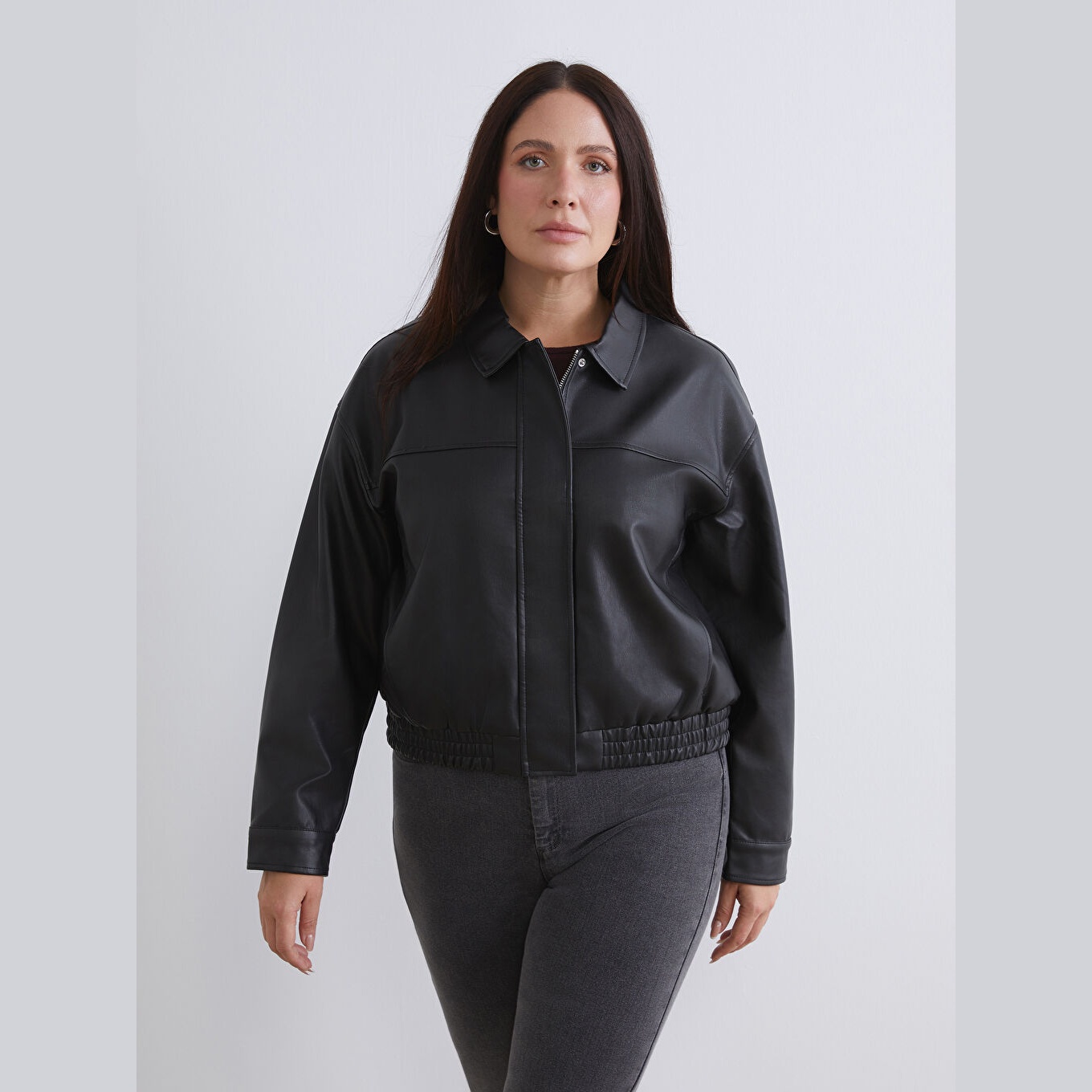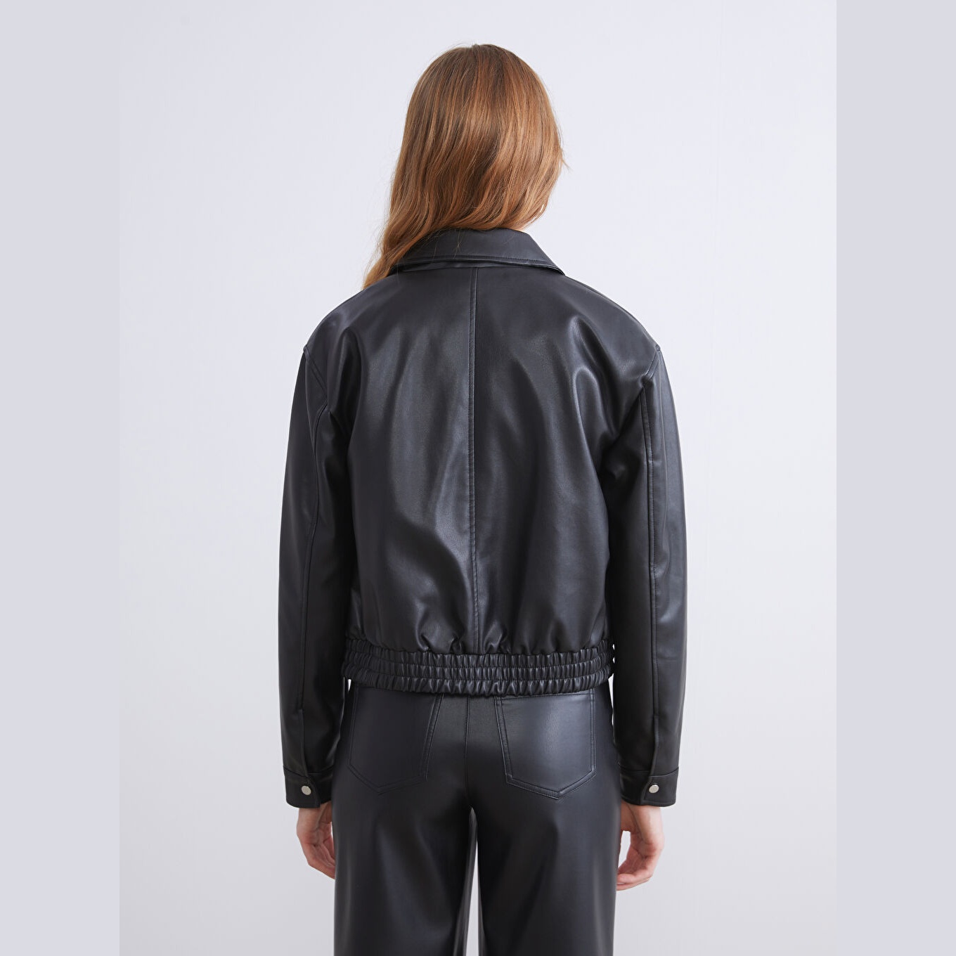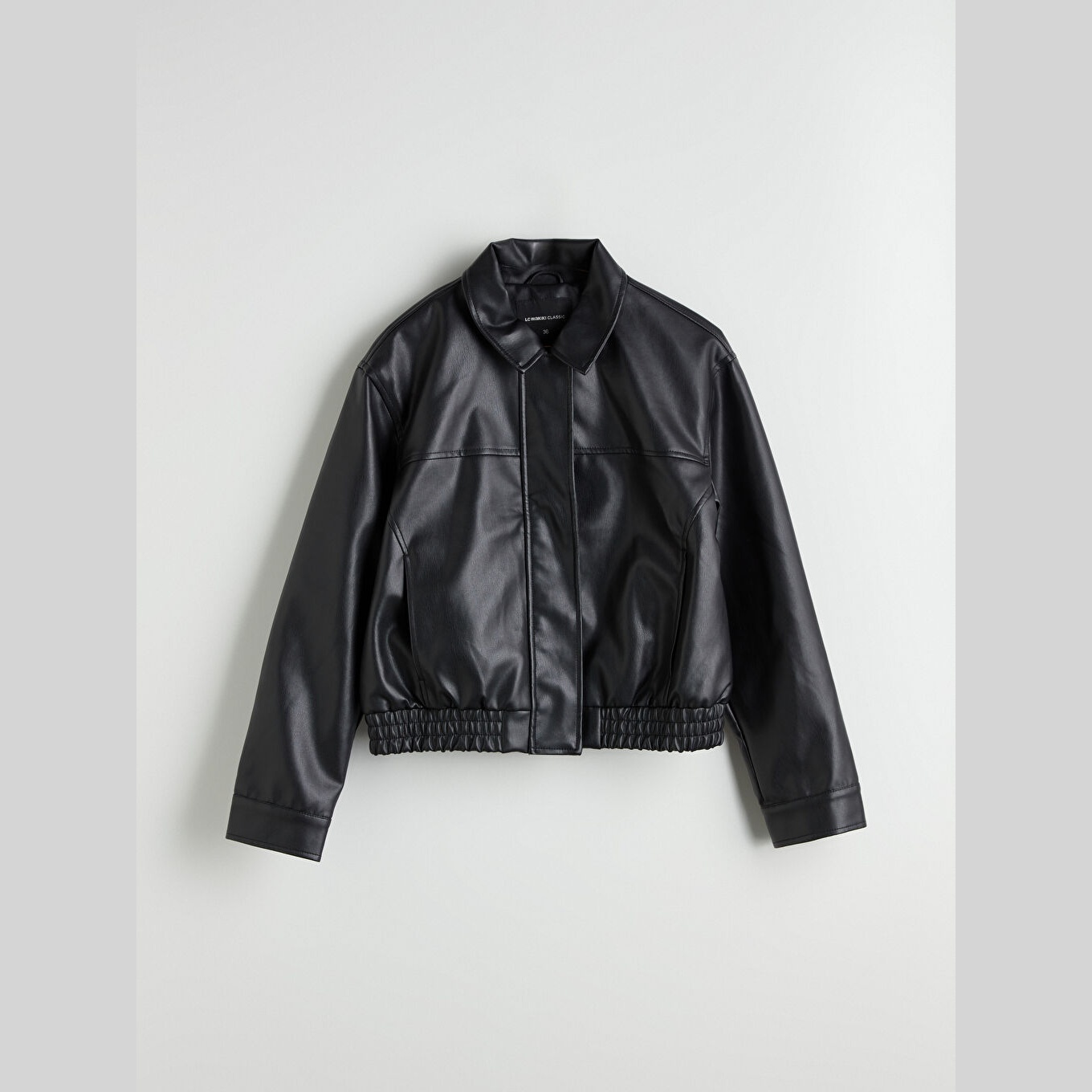 جاكيت نسائي جلد صناعي بياقة قميص من LCWAIKIKI Classic – أسود (قصة قياسية، تصميم قصير، مبطّن بالكامل، مناسب للمقاسات الكبيرة)