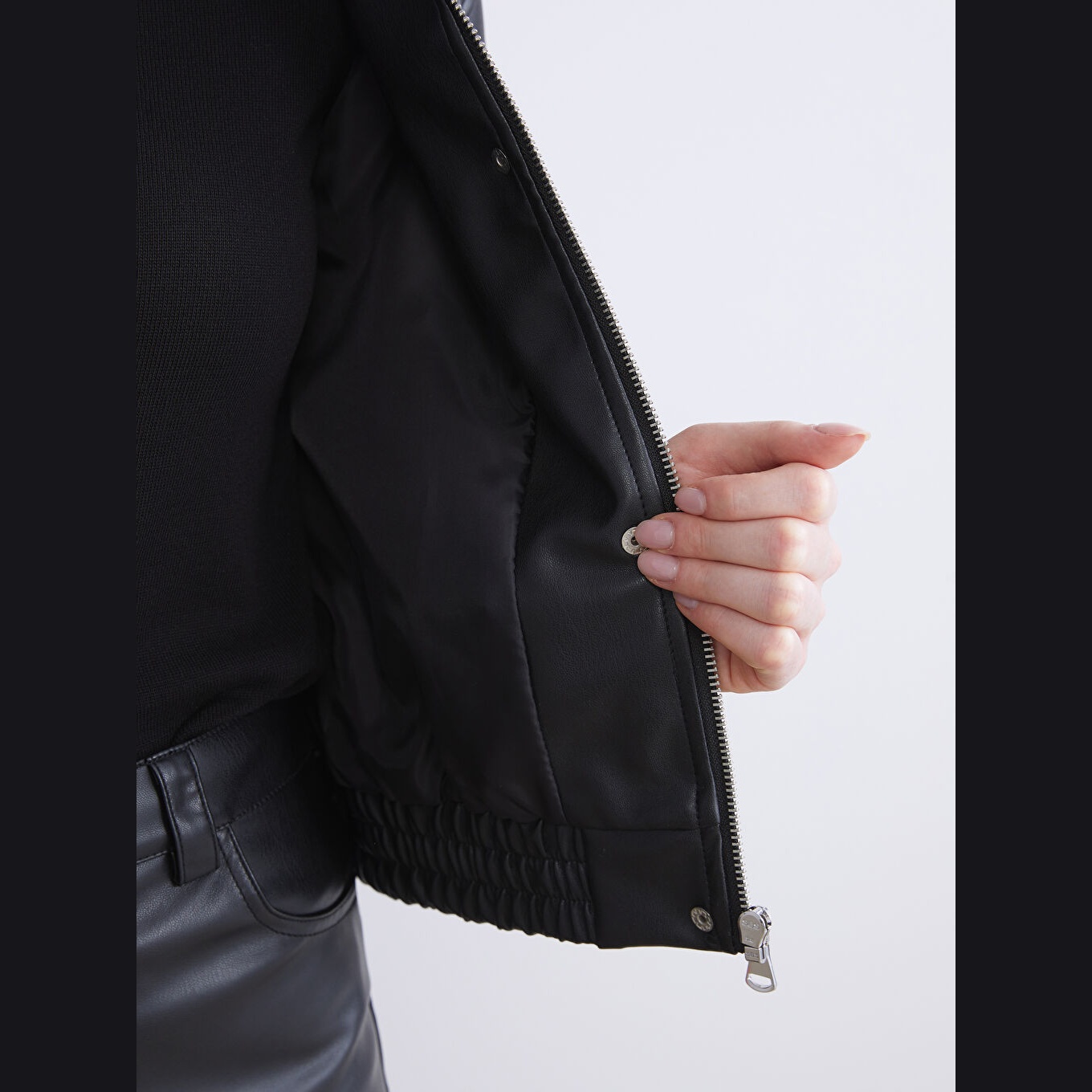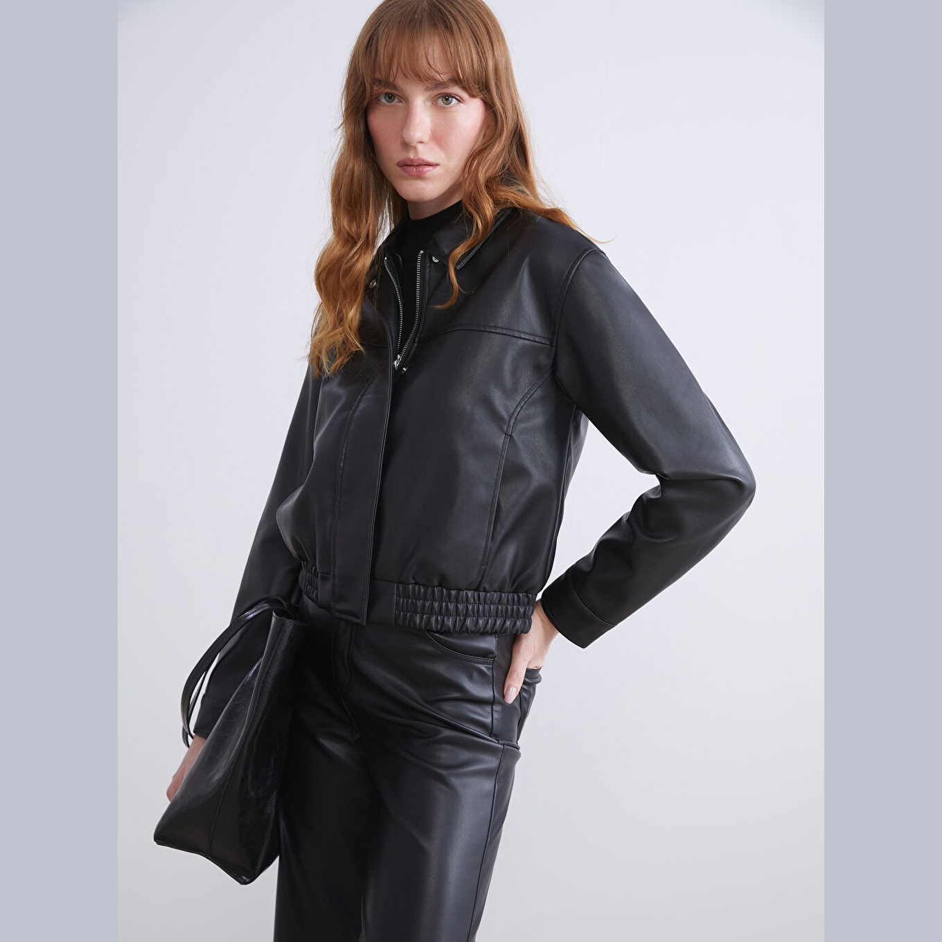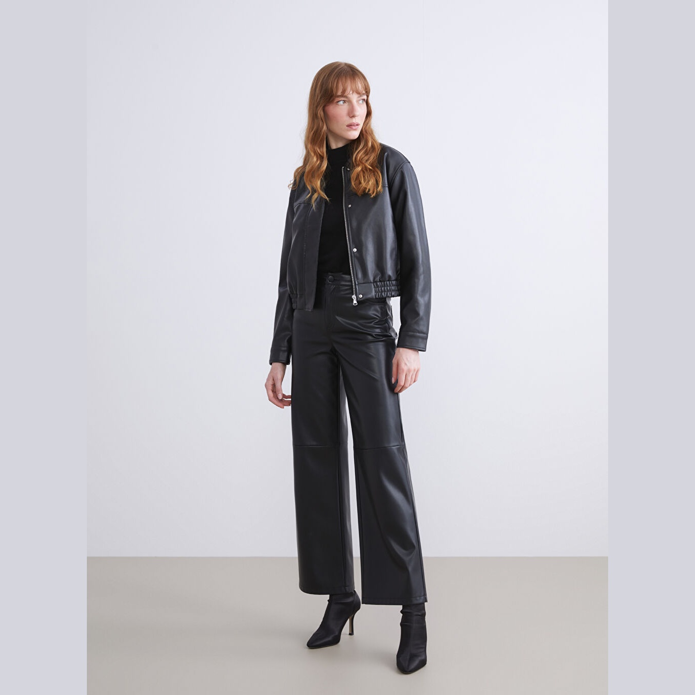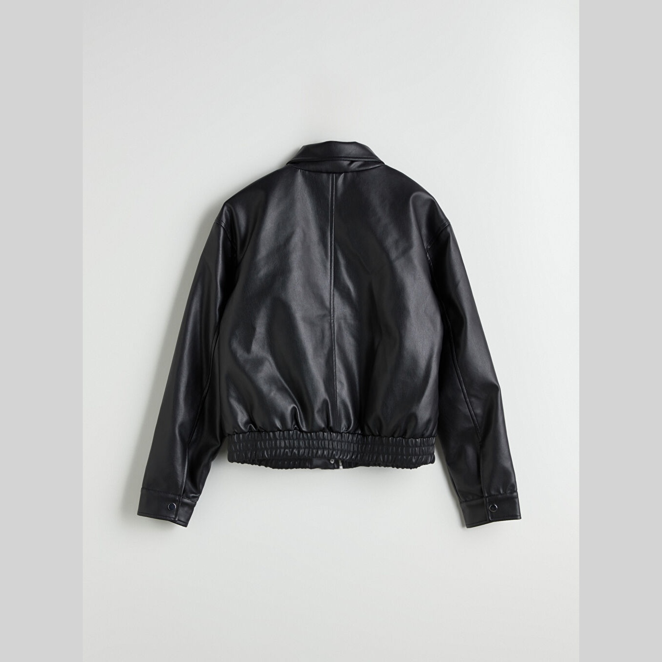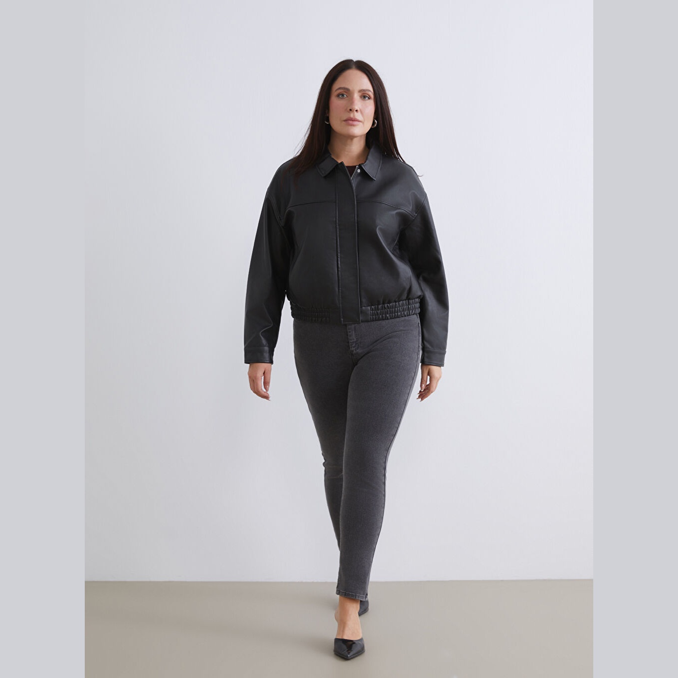 جاكيت نسائي جلد صناعي بياقة قميص من LCWAIKIKI Classic – أسود (قصة قياسية، تصميم قصير، مبطّن بالكامل، مناسب للمقاسات الكبيرة)