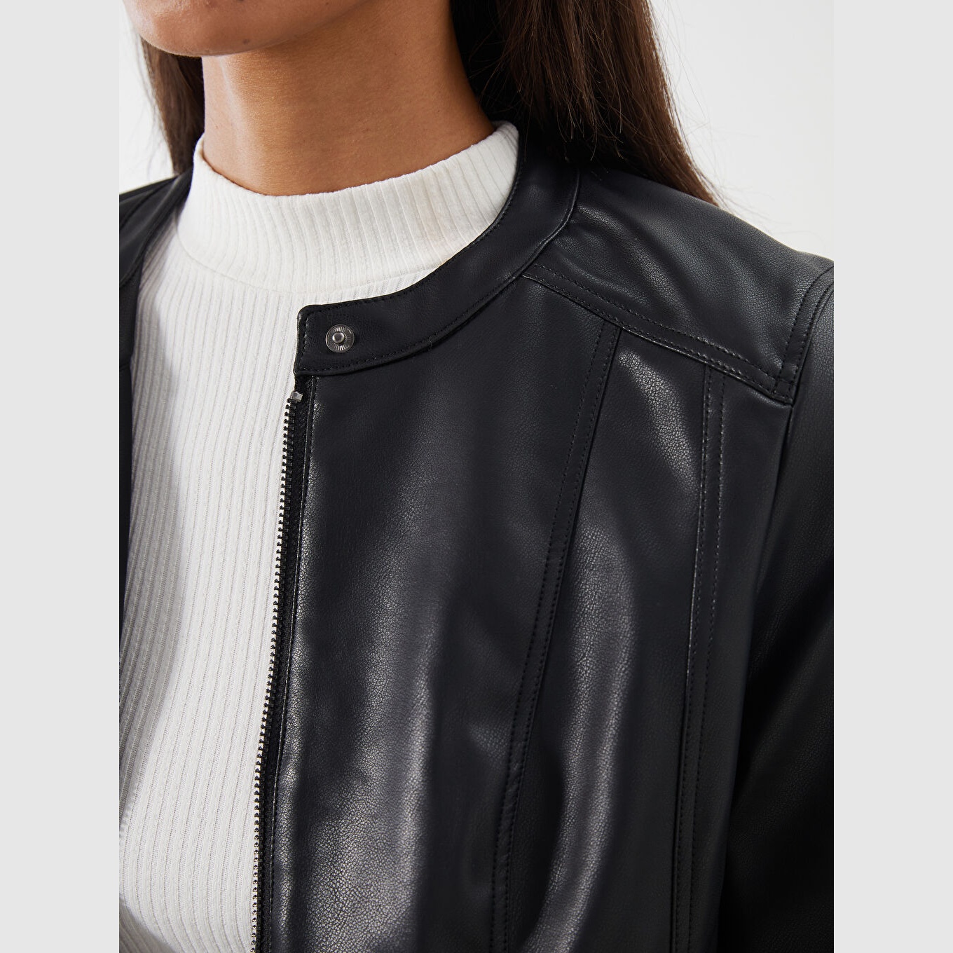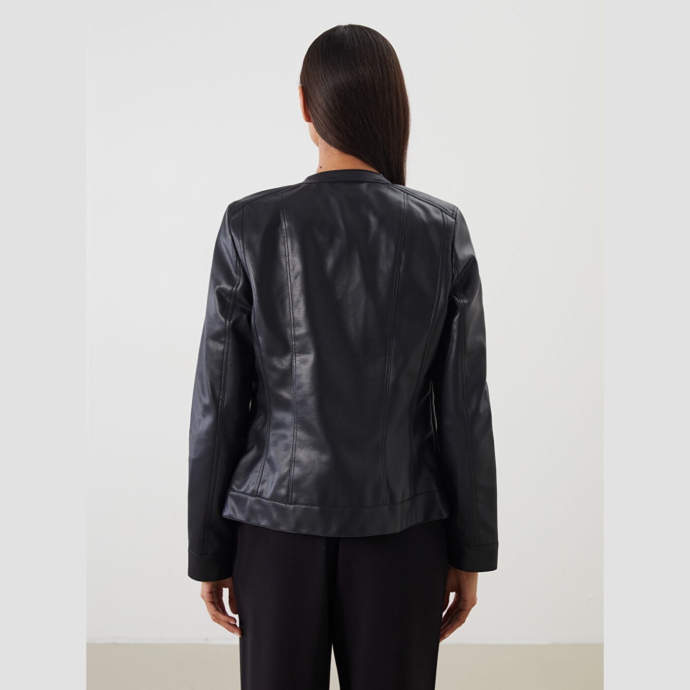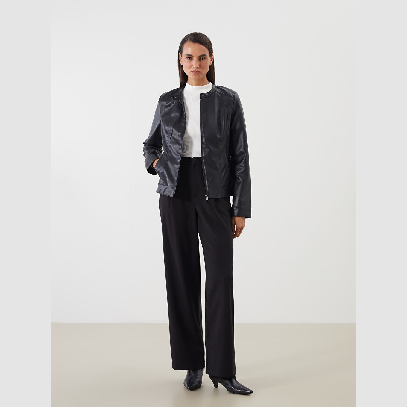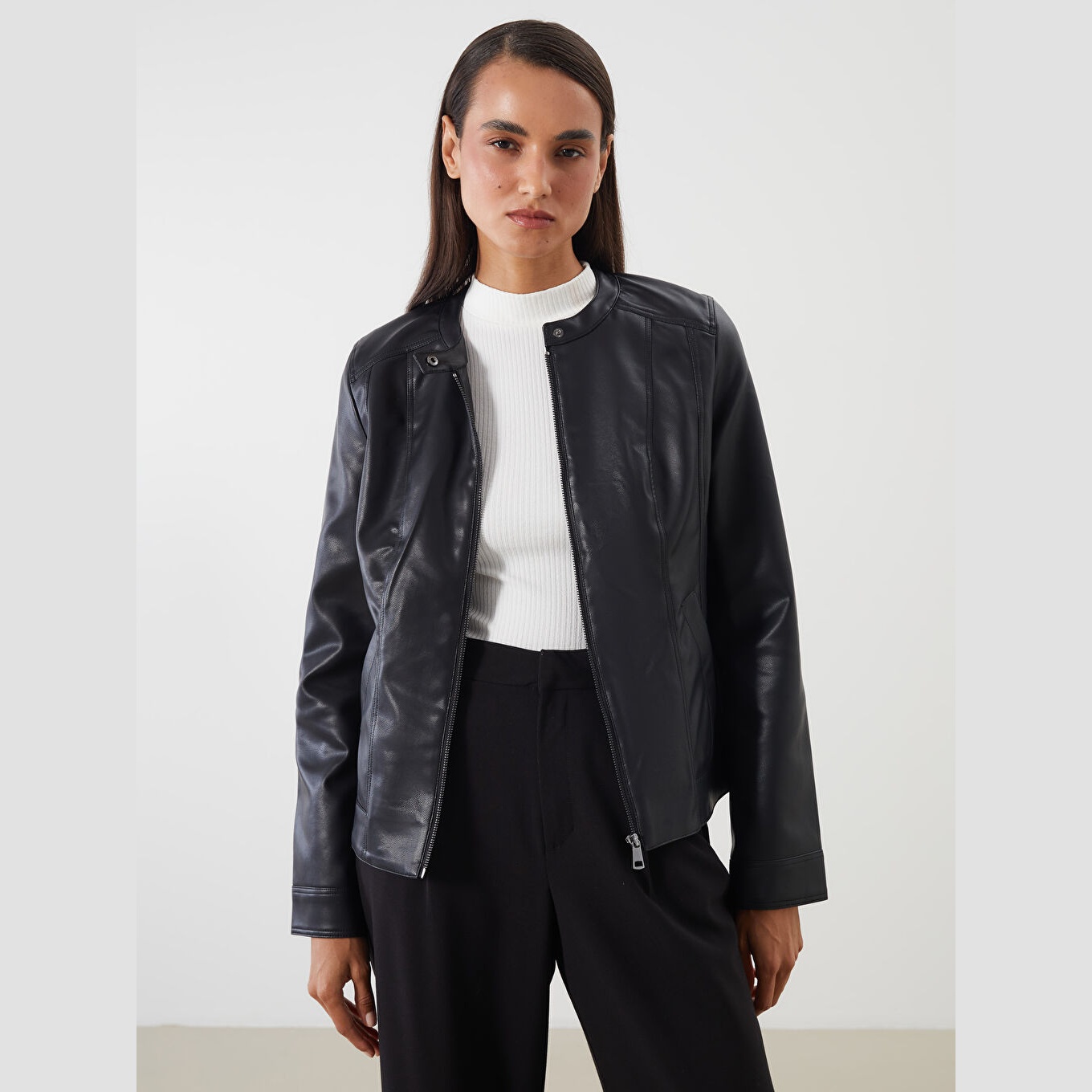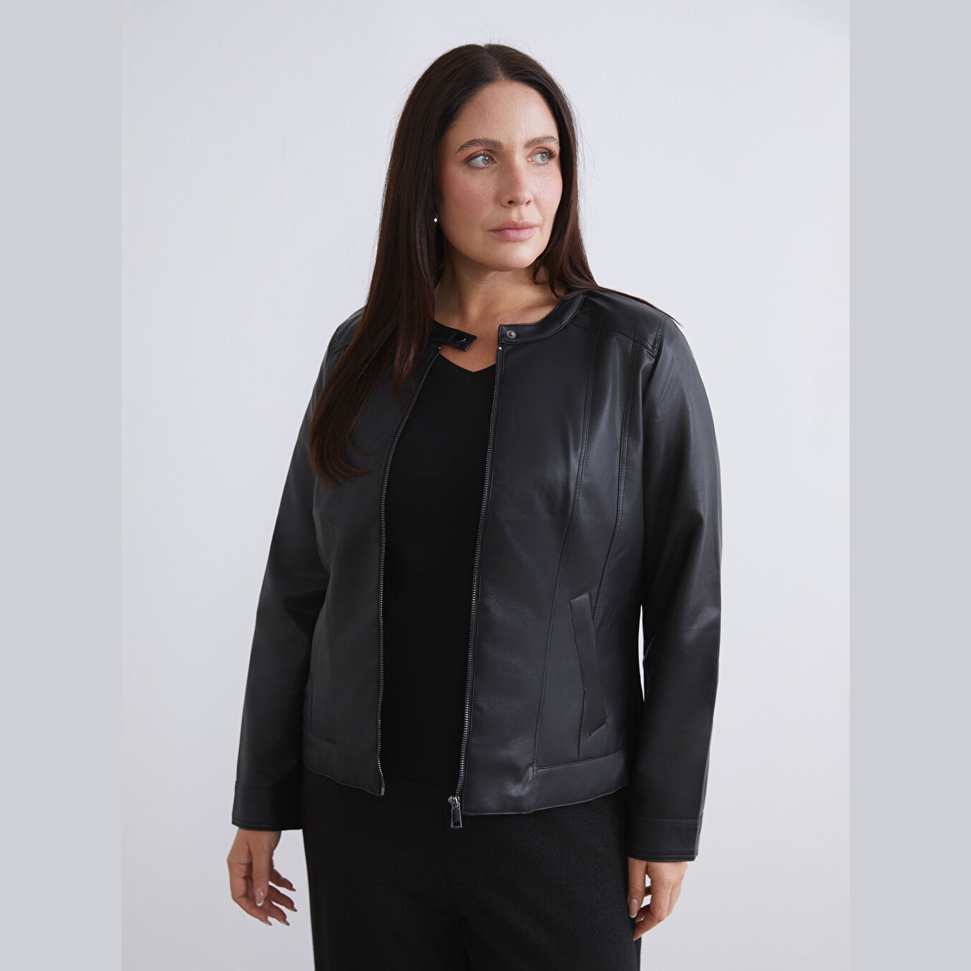 جاكيت نسائي جلد صناعي بياقة دائرية من LCWAIKIKI Classic – أسود (قصة قياسية، تصميم قصير، مبطّن بالكامل، مناسب للمقاسات الكبيرة)