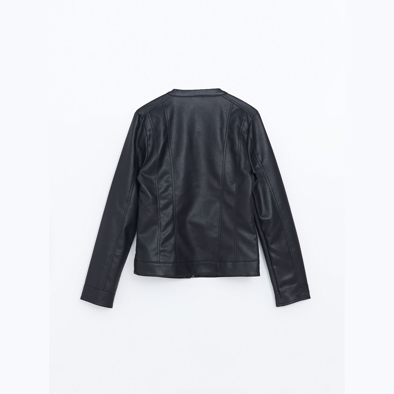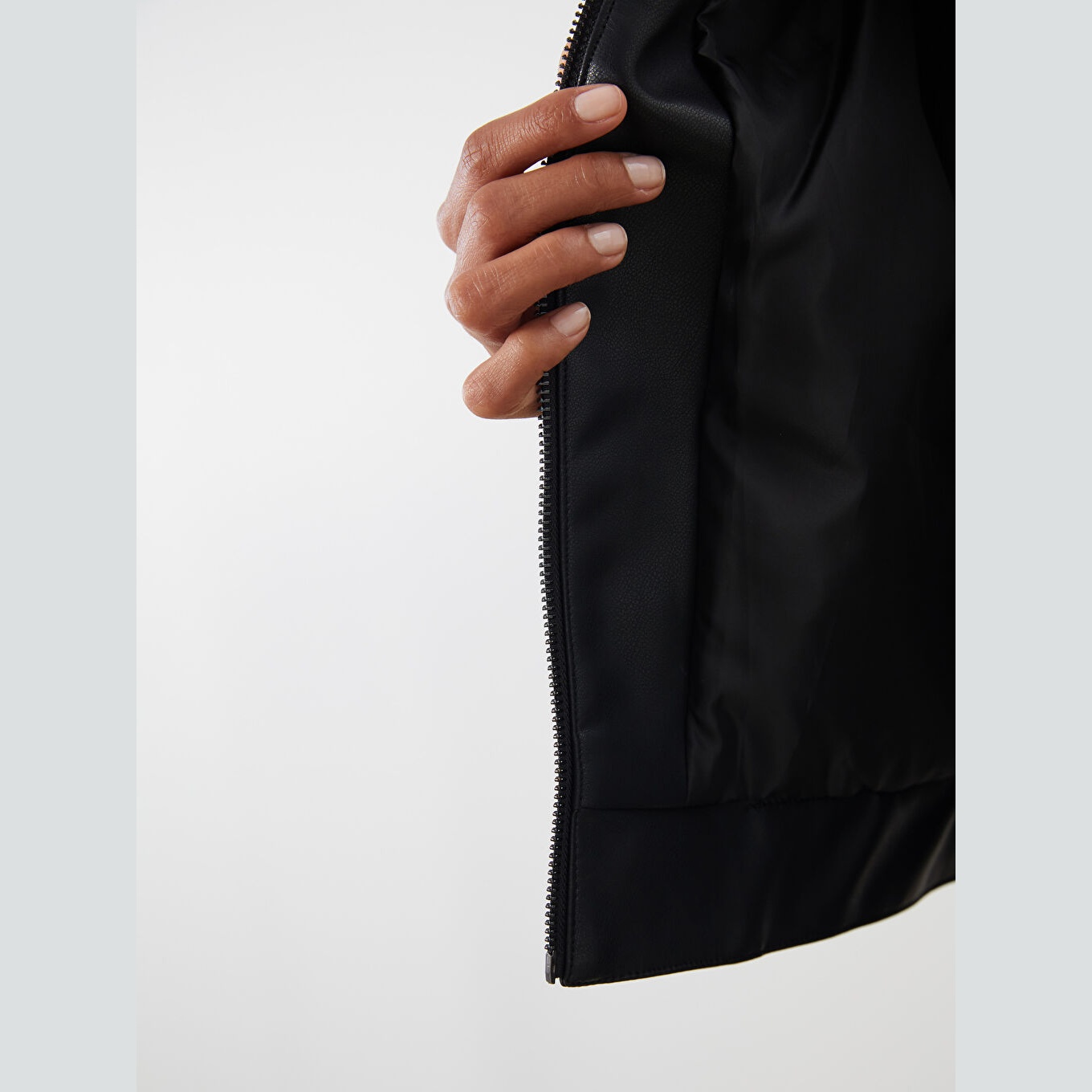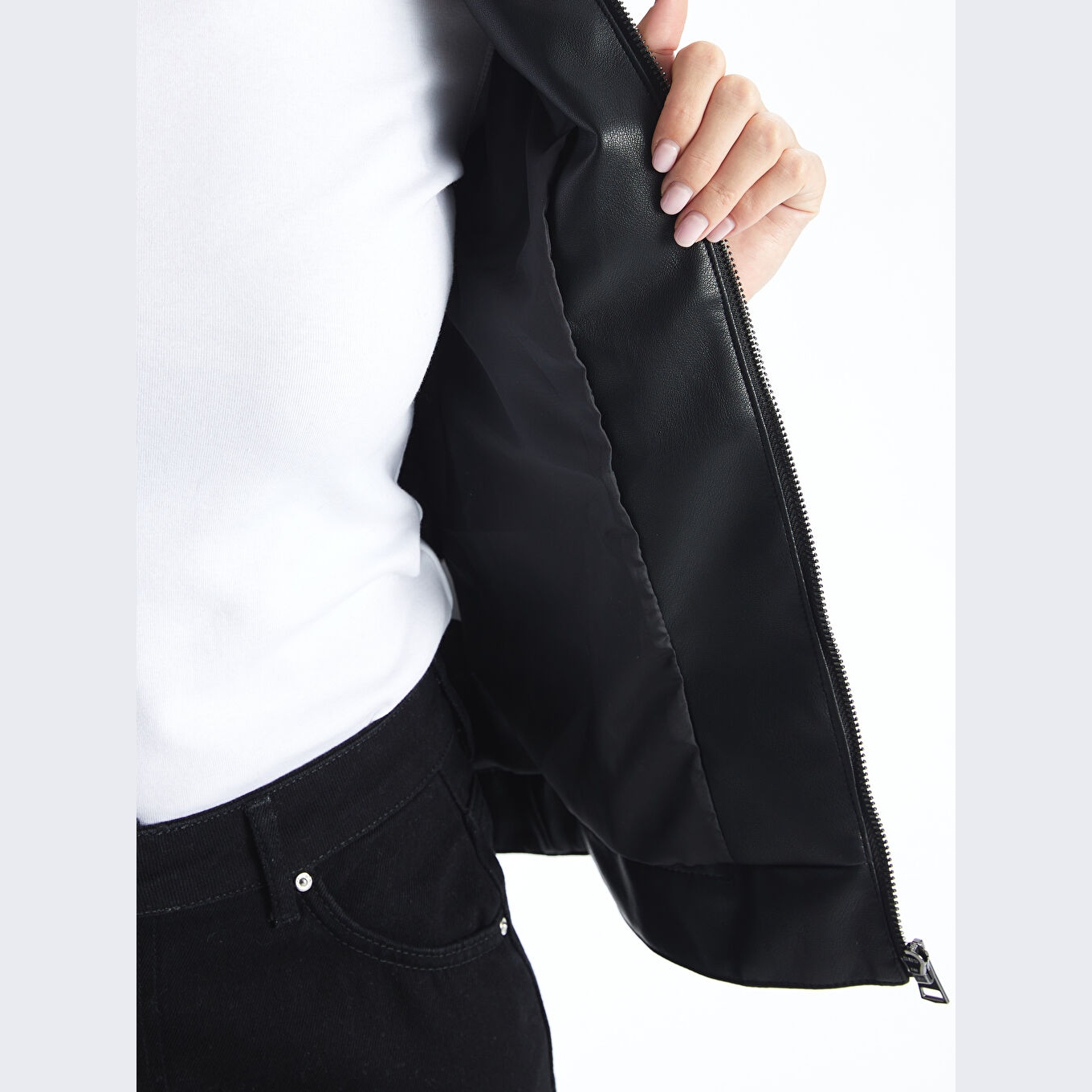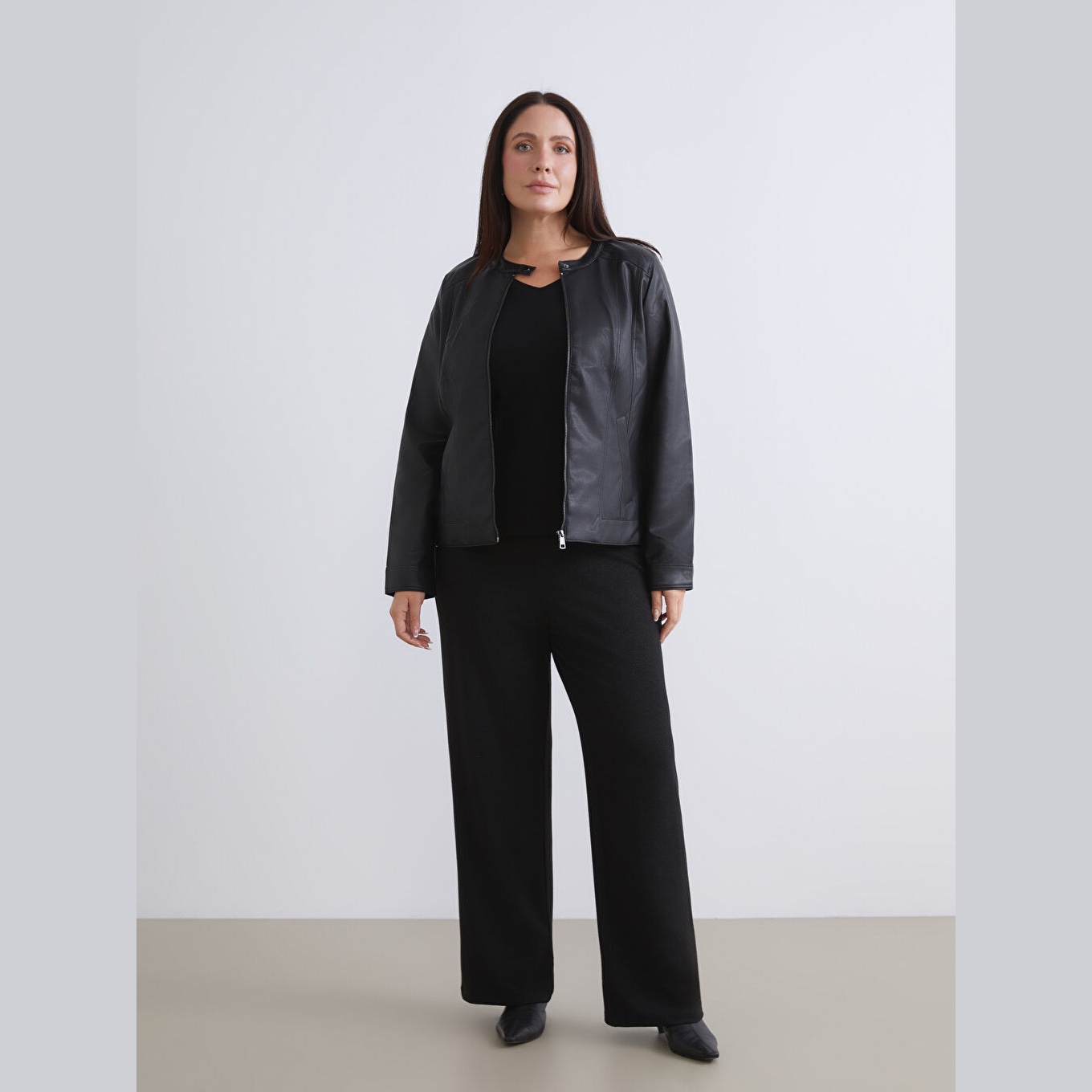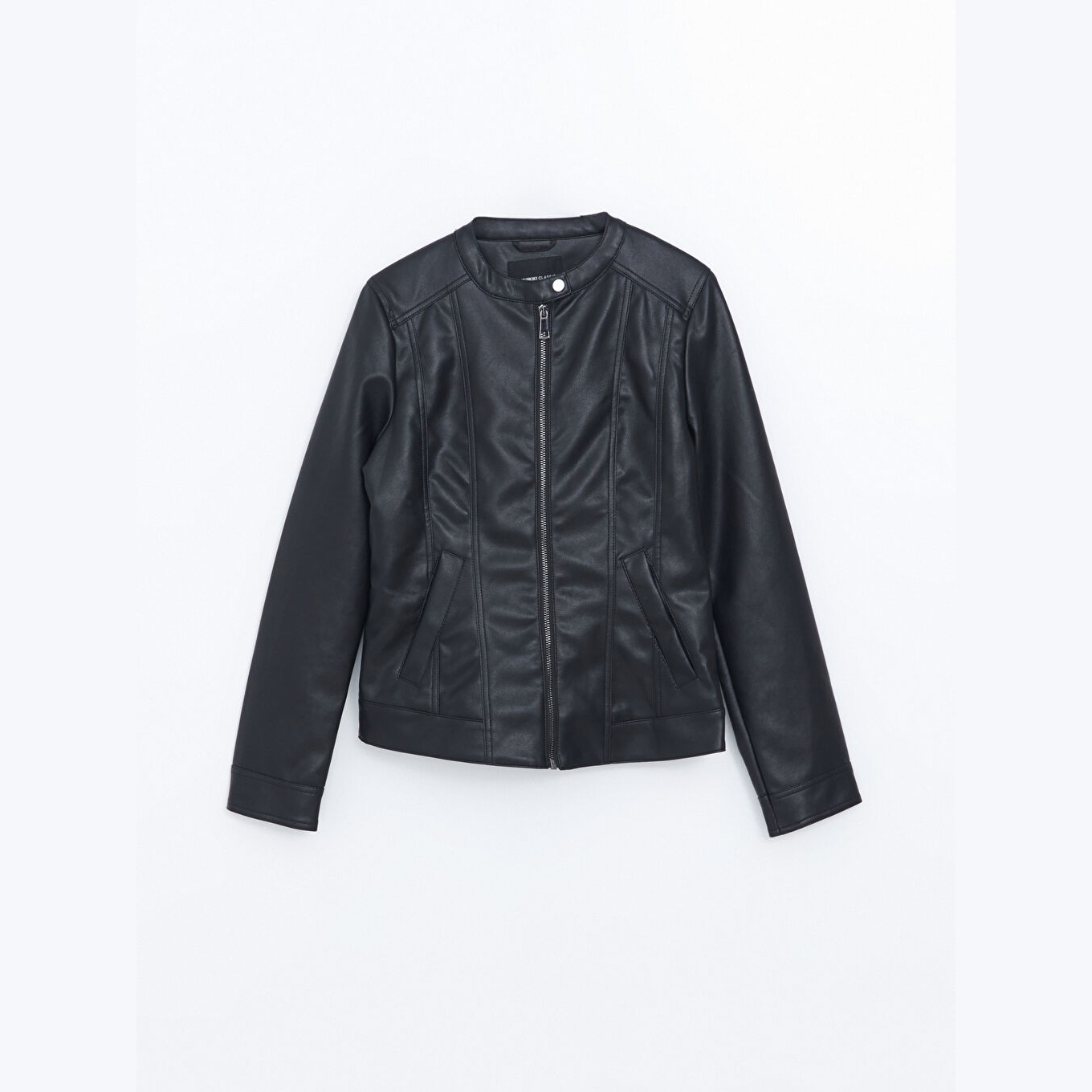 جاكيت نسائي جلد صناعي بياقة دائرية من LCWAIKIKI Classic – أسود (قصة قياسية، تصميم قصير، مبطّن بالكامل، مناسب للمقاسات الكبيرة)