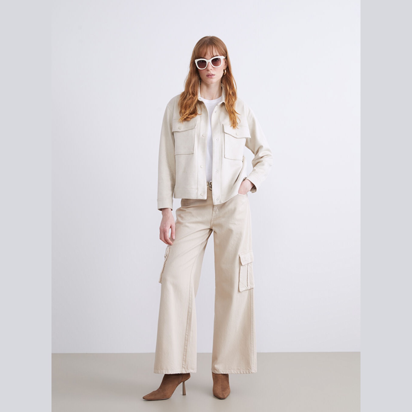 جاكيت أنيق بلون اكرو من مجموعة LCWAIKIKI Classic – Büyük Beden، مصمم بياقة قميص كلاسيكية (Gömlek Yaka)، قصة واسعة (Loose Fit) توفر راحة وانسيابية، خامة خارجية بملمس سويدي ناعم (Süet Görünümlü) مكونة من %94 بوليستر و%6 إيلاستان، بدون بطانة داخلية، تصميم سادة بدون نقوش، بطول قصير يُقاس من الكتف، مثالي للإطلالات اليومية أو الكاجوال الأنيقة في المواسم المعتدلة.