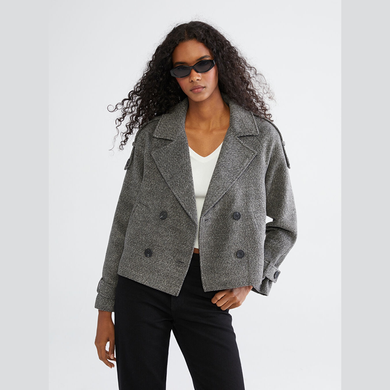 جاكيت أنيق بلون رمادي (Gri) من مجموعة LCW Vision، مصمم بياقة كروس مزدوجة (Kruvaze Yaka) تضيف لمسة كلاسيكية راقية، قصة واسعة (Loose Fit) تمنحك حرية حركة وأناقة مريحة، خامة كاشيه شتوية سميكة مكونة من مزيج غني: %80 بوليستر، %14 أكريليك، %3 بولياميد، %2 فيسكوز، %1 صوف، مبطّن بالكامل بـ%100 بوليستر، تصميم منقوش بنعومة (Desenli)، بطول قصير يُقاس من الكتف، بدون قبعة، مثالي للإطلالات الرسمية أو العملية في الأجواء الباردة.