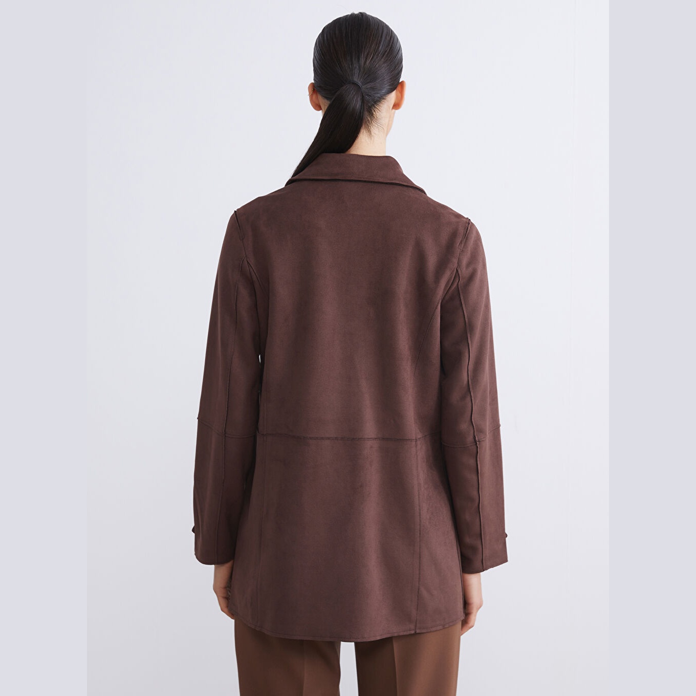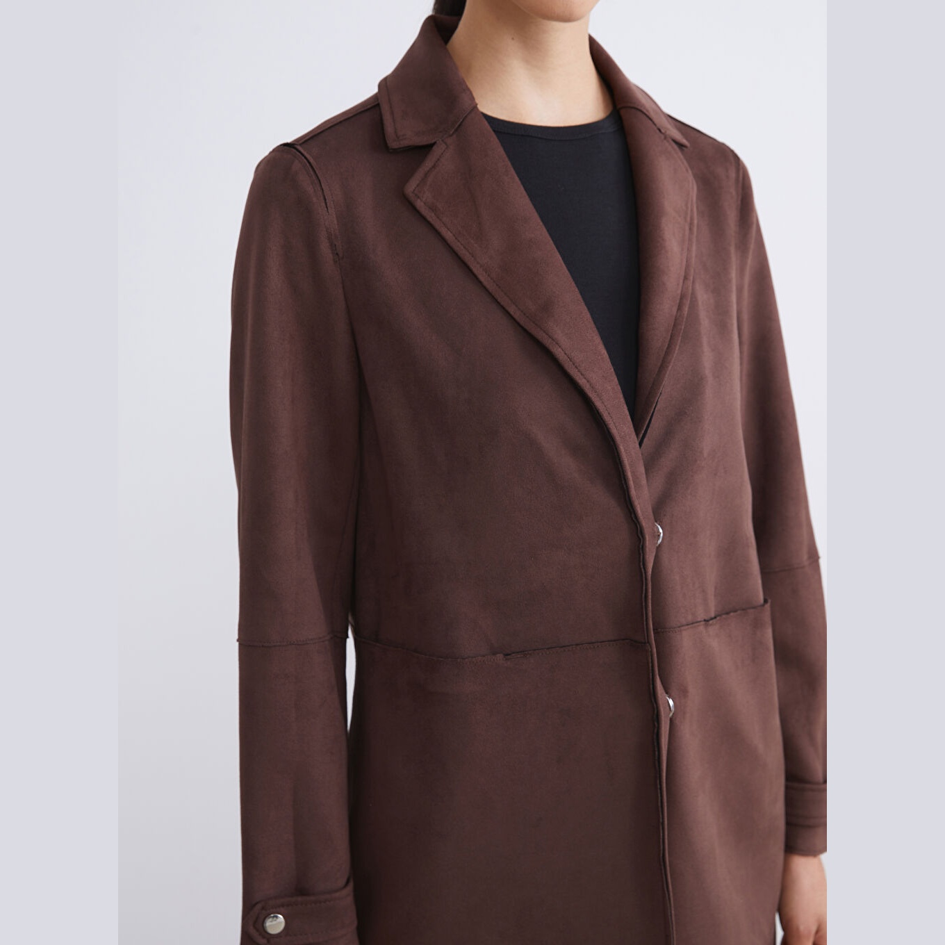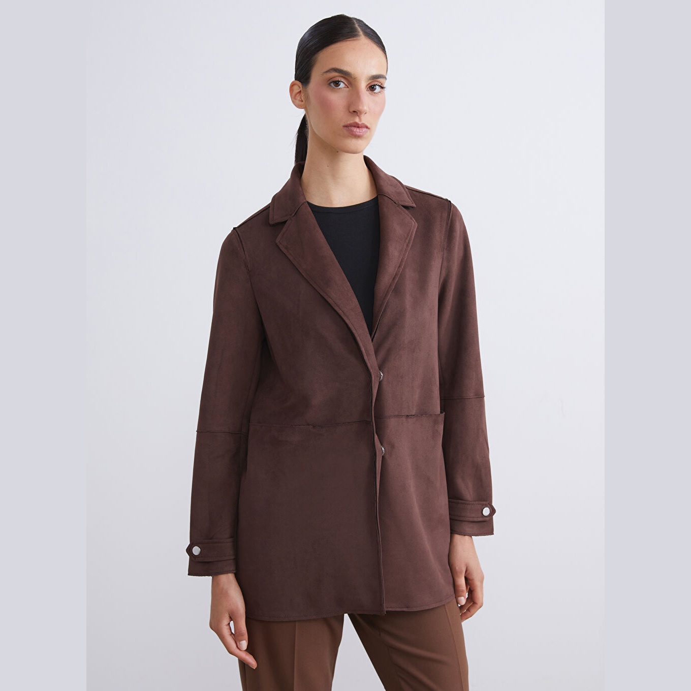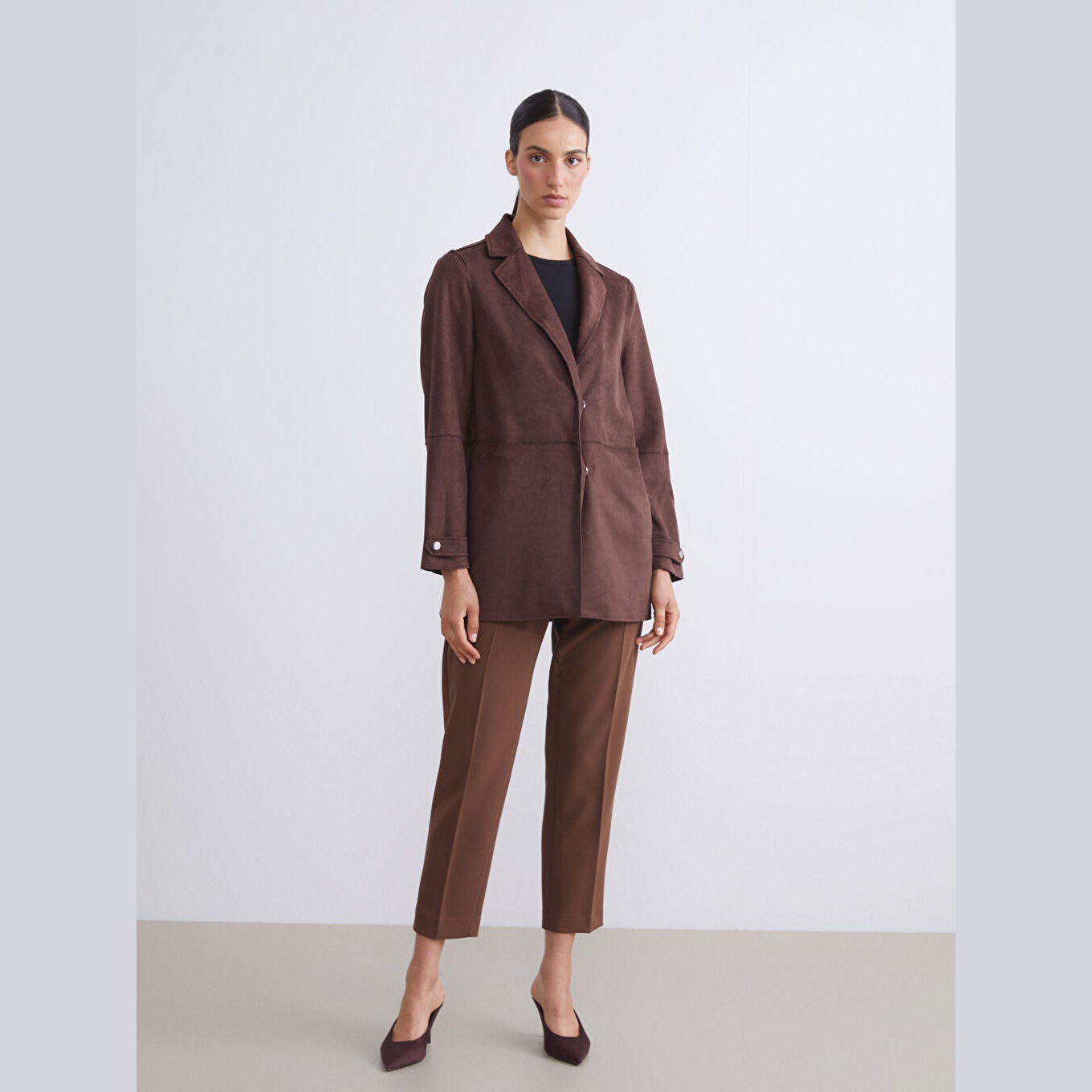 جاكيت بليزر بلون بني (Kahverengi) من مجموعة LCW Modest، مصمم بياقة جاكيت كلاسيكية (Ceket Yaka)، قصة واسعة (Loose Fit) تمنحك مظهرًا محتشمًا وانسيابيًا، خامة شمواه ناعمة (Süet Görünümlü) بتركيبة مرنة من %95 بوليستر و%5 إيلاستان، بدون بطانة داخلية، تصميم سادة بدون نقوش، بطول ميدي يُقاس من الكتف، مثالي للإطلالات الخريفية أو الرسمية ضمن أسلوب محتشم.