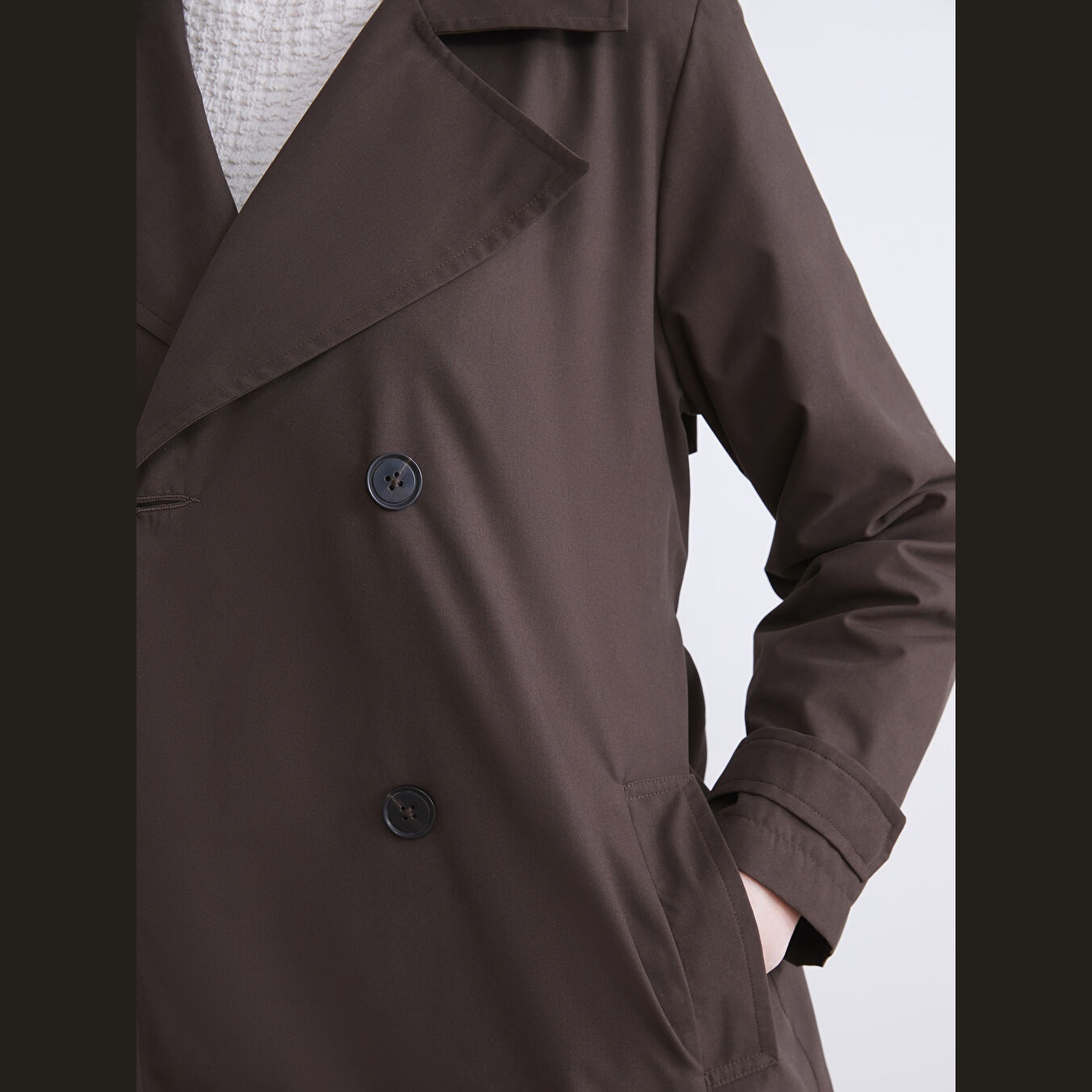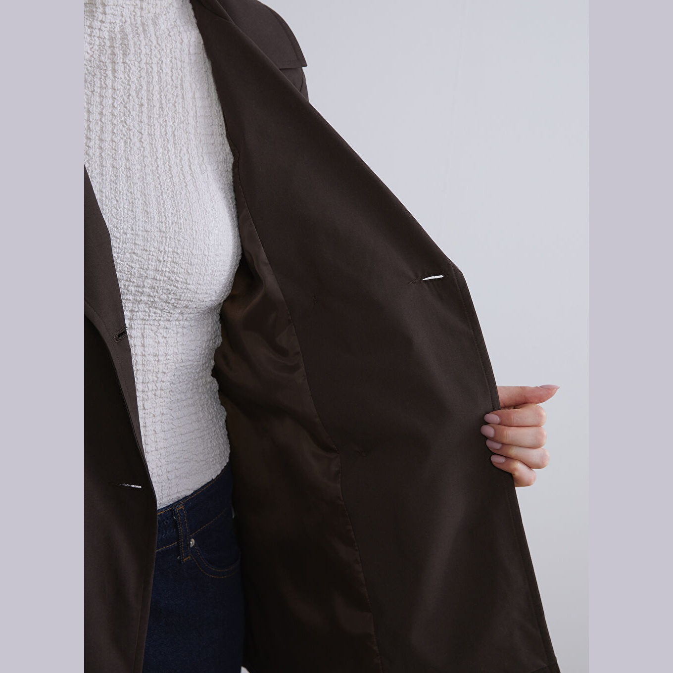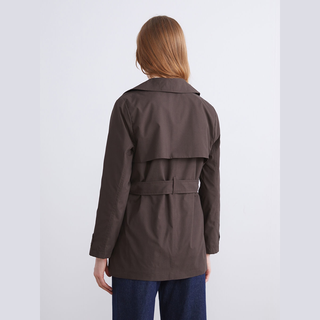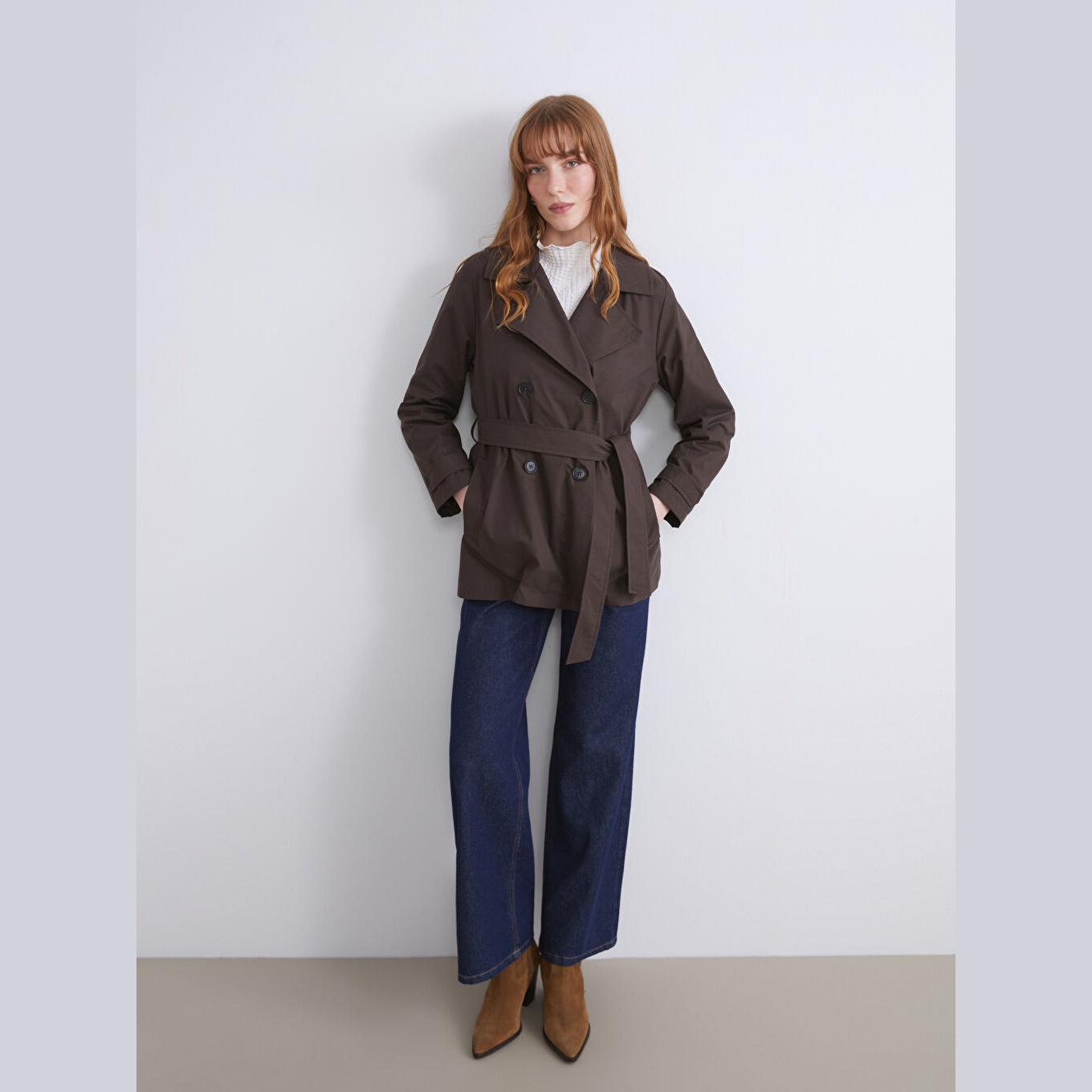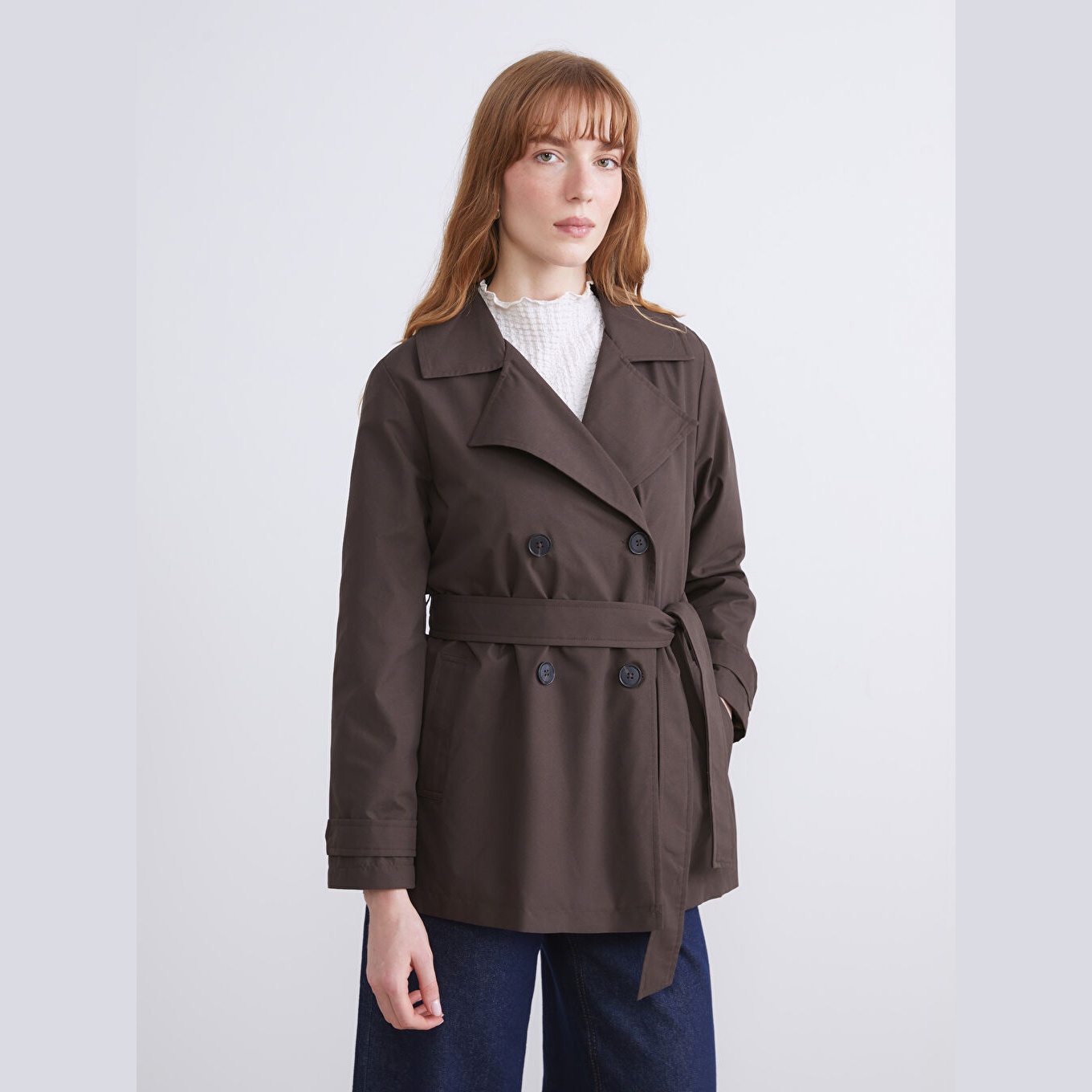 ترنش كوت نسائي بياقة مزدوجة مع حزام خصر من LCW Classic – بني (قصة واسعة، تصميم رسمي قصير، خامة ناعمة مبطّنة بالكامل، مثالي لفصل الخريف والإطلالات الأنيقة)