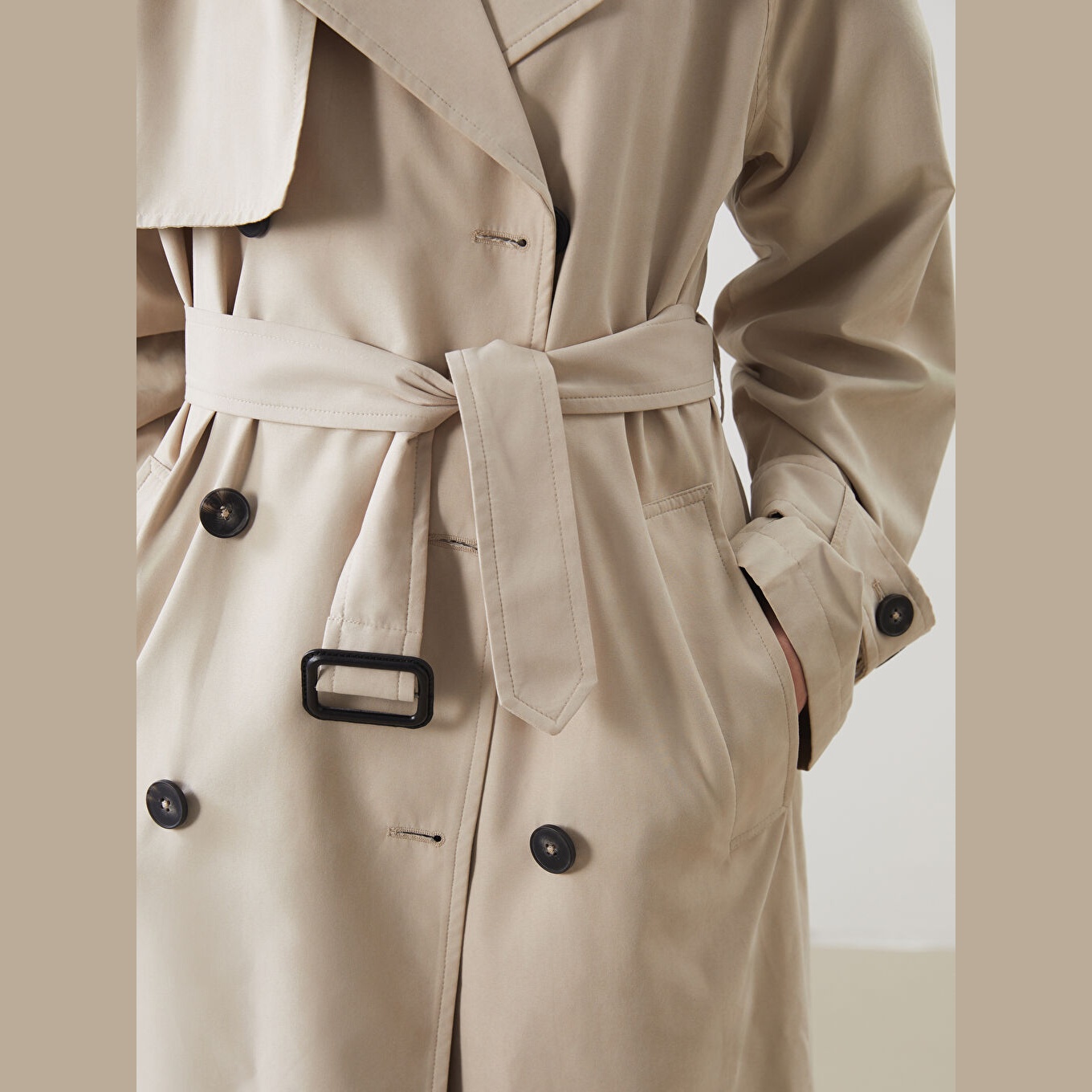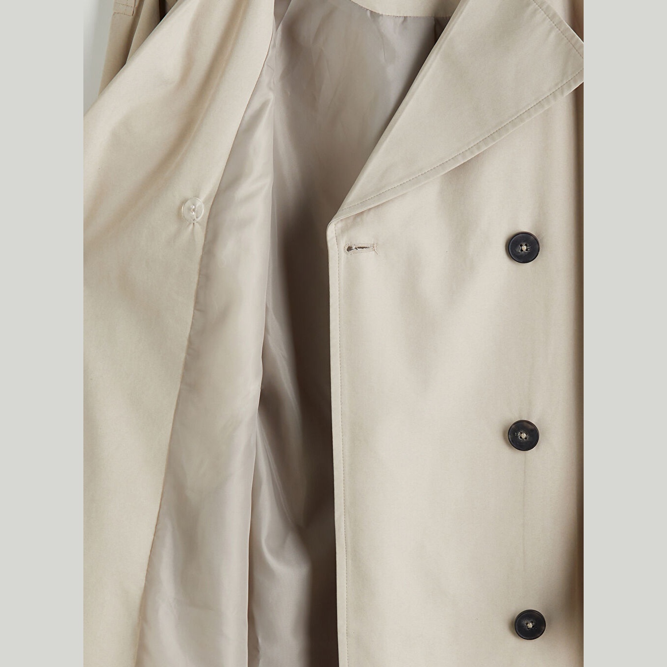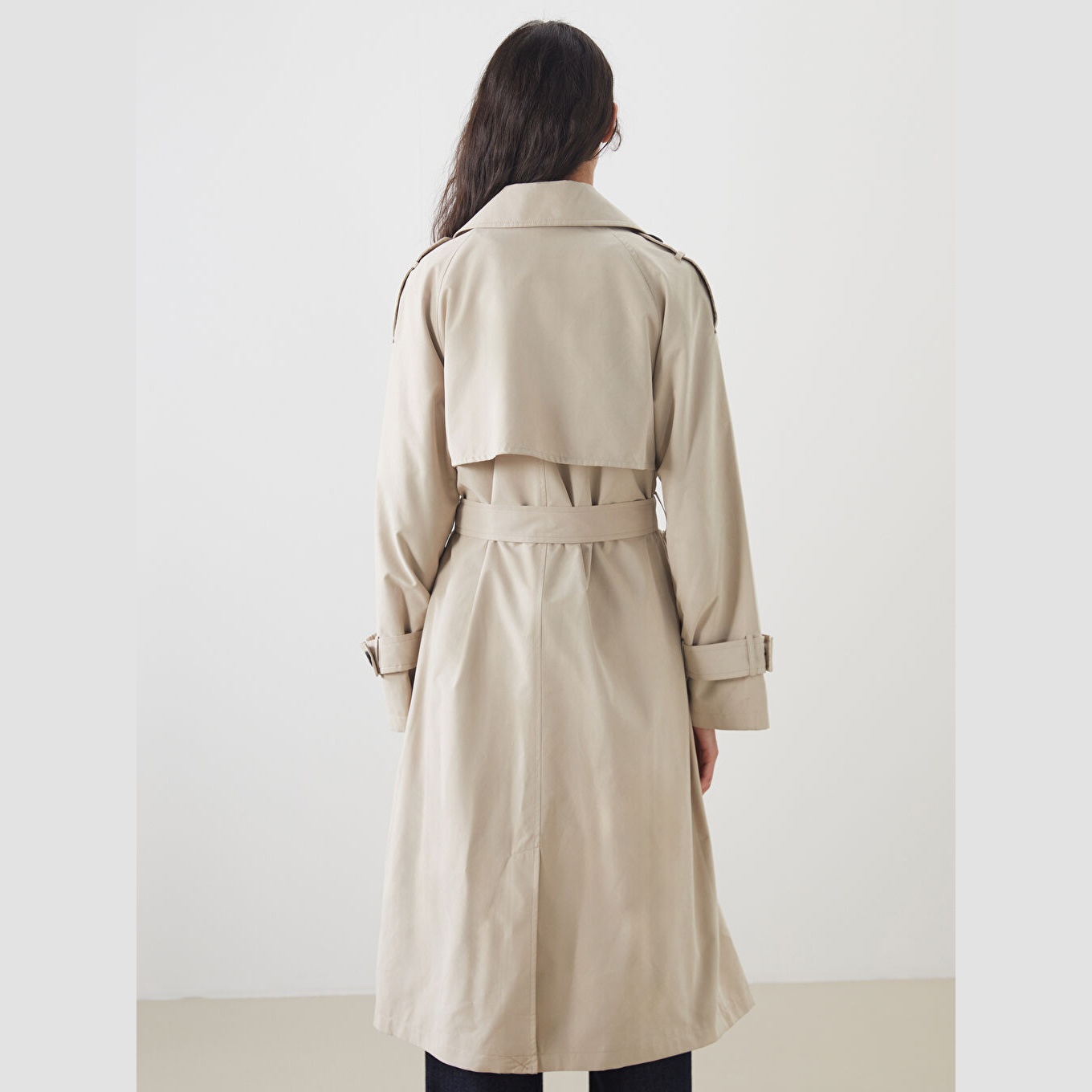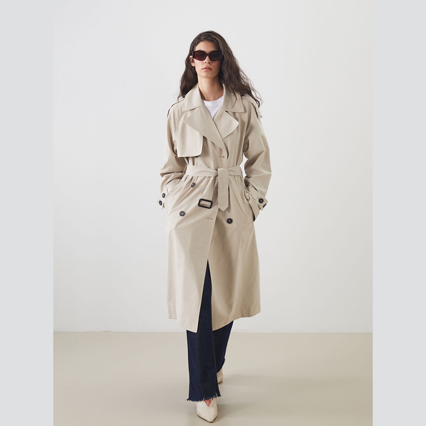 ترنش كوت نسائي أوفرسايز بياقة مزدوجة من LCW Modest – بيج (قصة فضفاضة، تصميم محتشم متوسط الطول، خامة خفيفة مبطّنة بالكامل، مثالي للإطلالات الخريفية والرسمية)