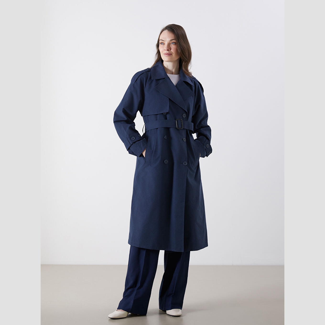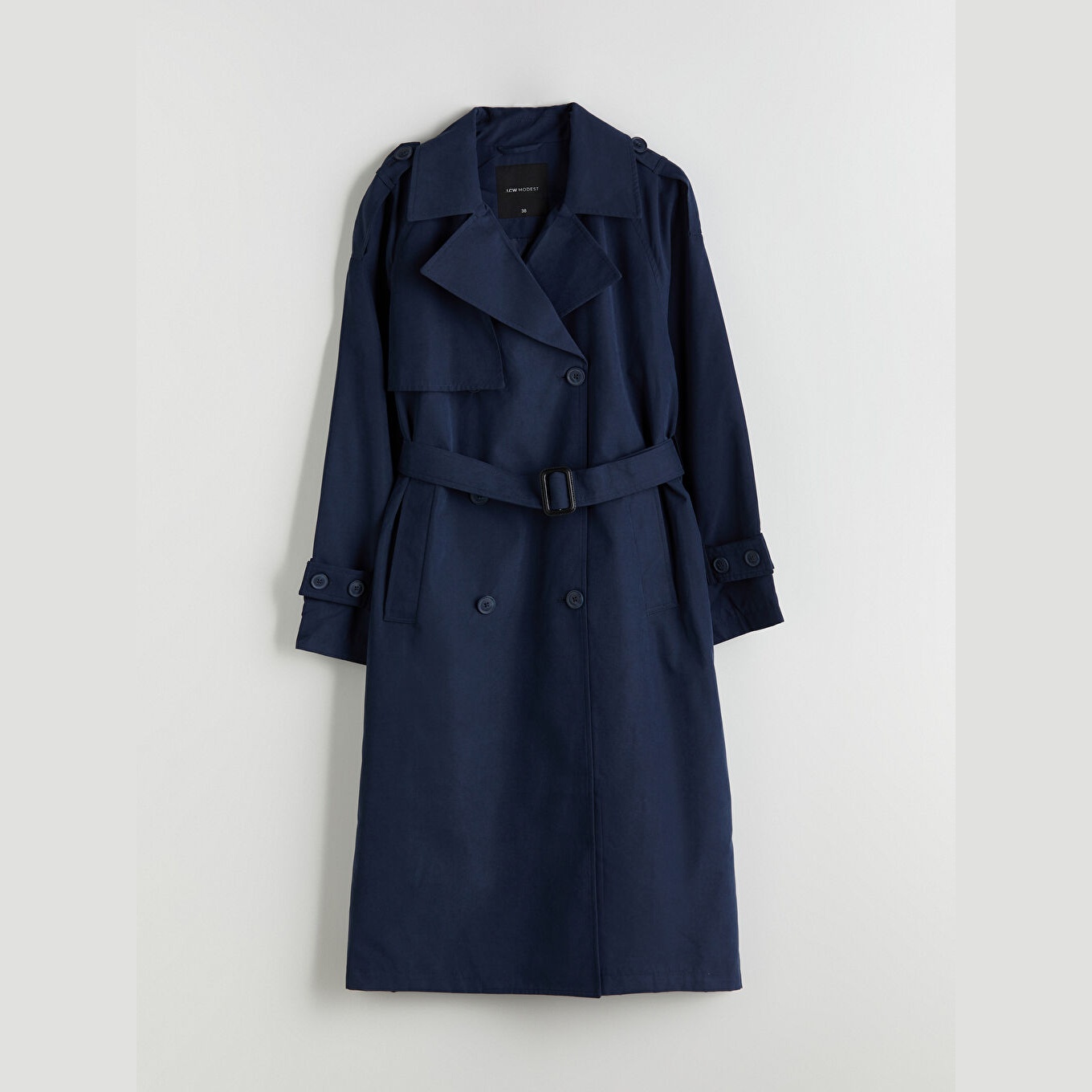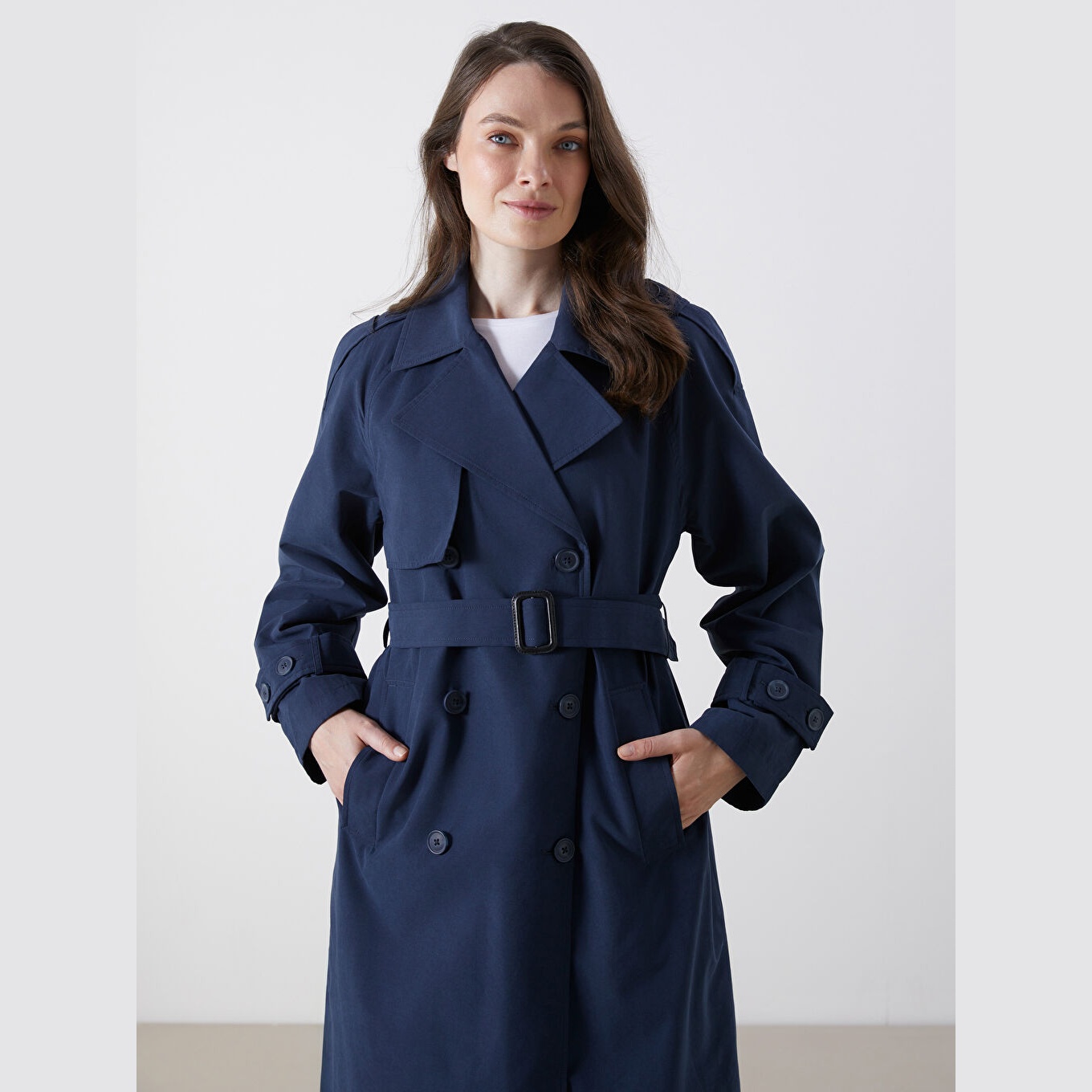 ترنش كوت نسائي أوفرسايز بياقة مزدوجة من LCW Modest – كحلي (قصة فضفاضة، تصميم محتشم متوسط الطول، خامة خفيفة مبطّنة بالكامل، مثالي للإطلالات الخريفية والرسمية)