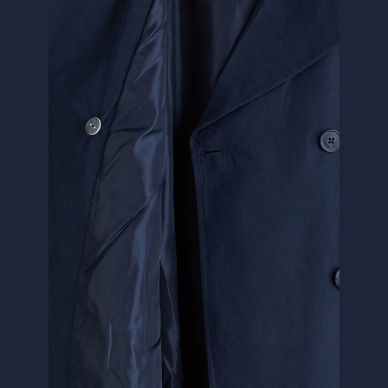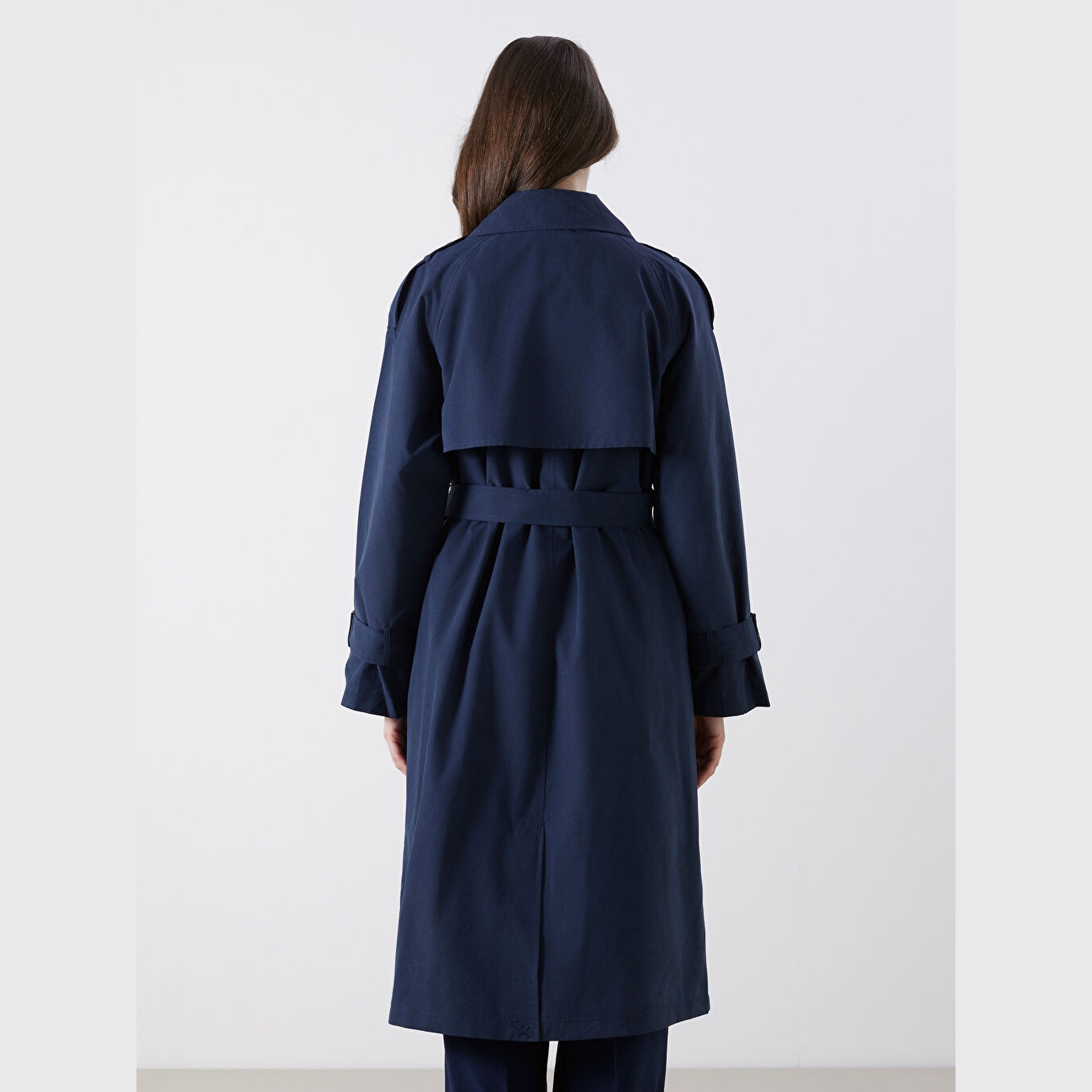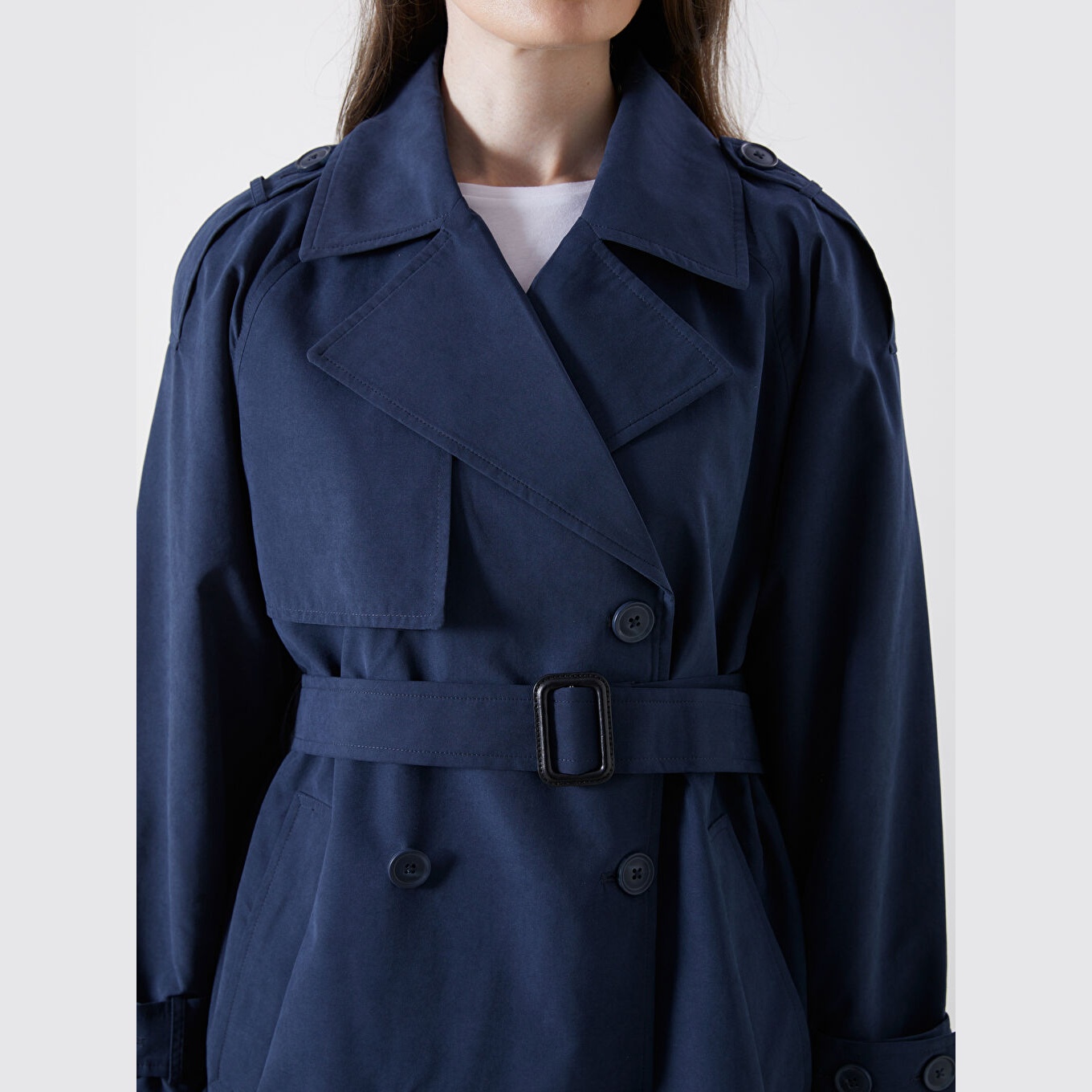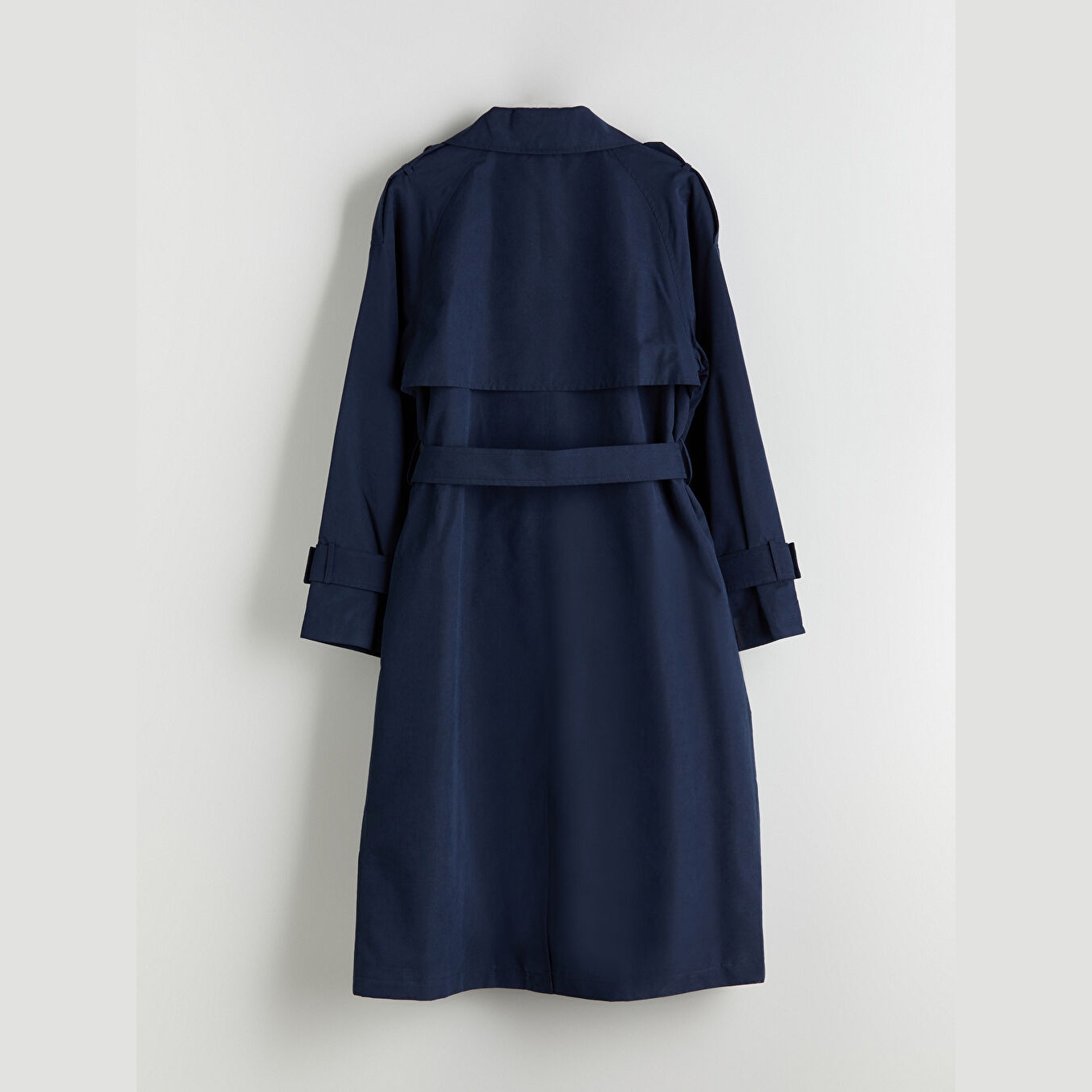 ترنش كوت نسائي أوفرسايز بياقة مزدوجة من LCW Modest – كحلي (قصة فضفاضة، تصميم محتشم متوسط الطول، خامة خفيفة مبطّنة بالكامل، مثالي للإطلالات الخريفية والرسمية)