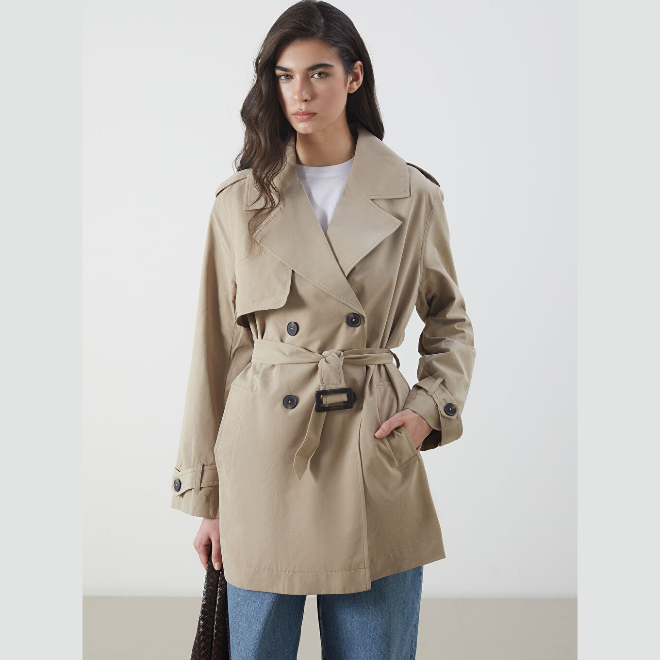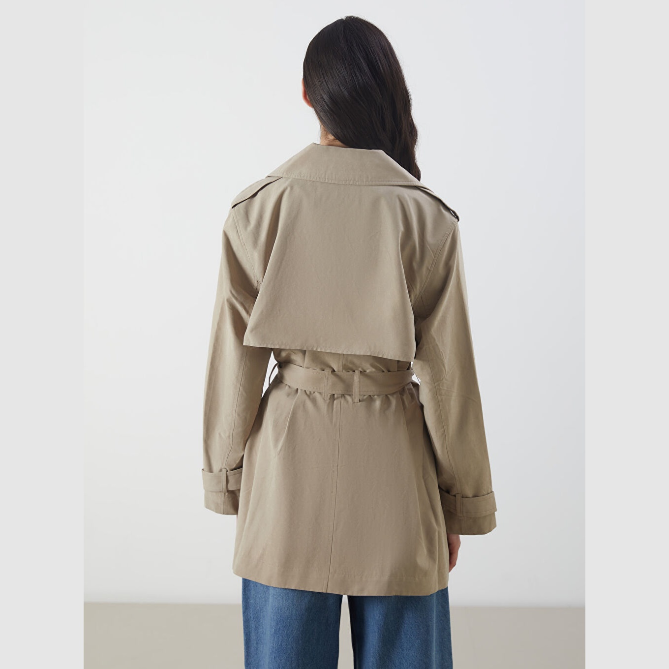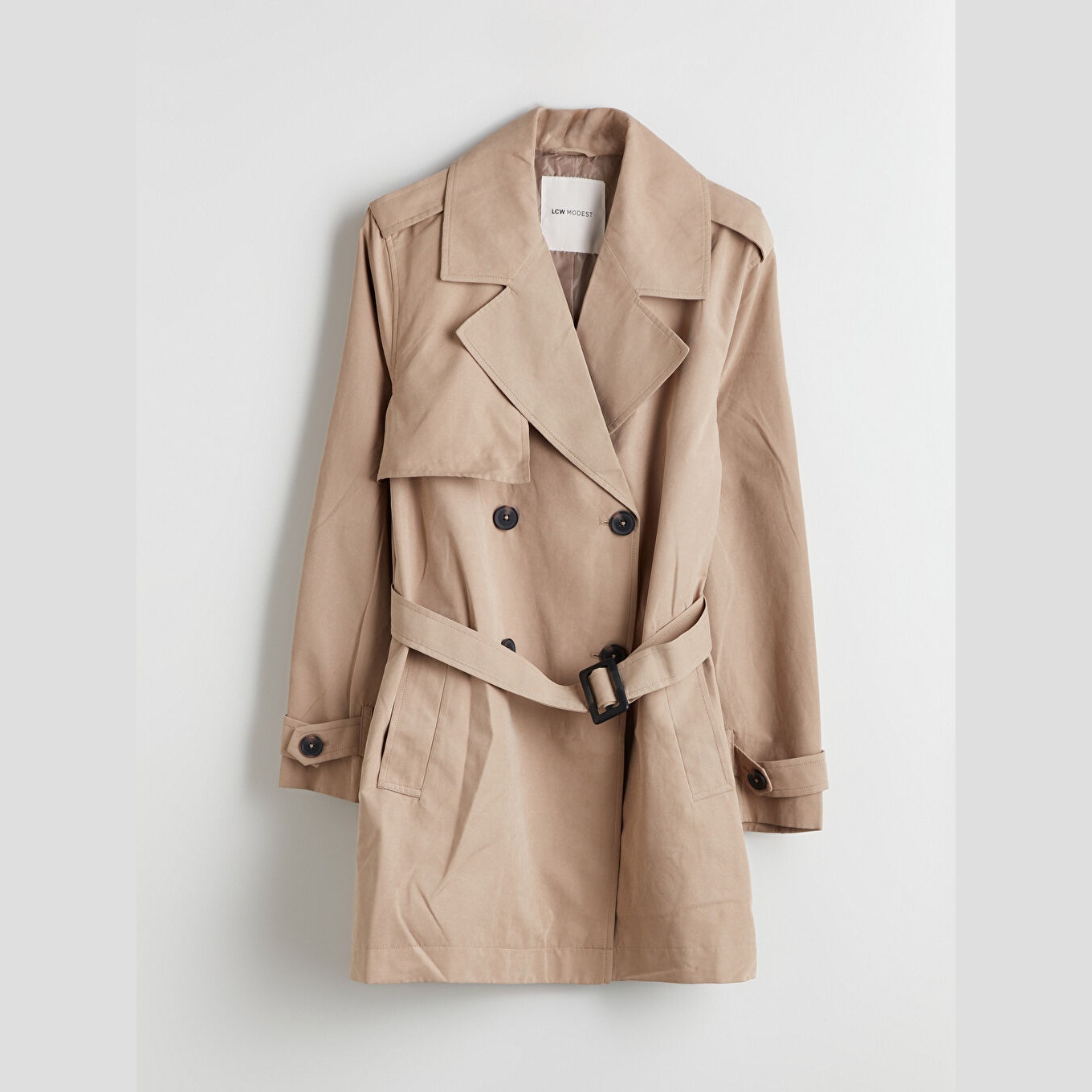 ترنش كوت نسائي بياقة مزدوجة من LCW Modest – بيج (قصة واسعة، تصميم محتشم متوسط الطول، خامة خفيفة مبطّنة بالكامل، مزود بحزام خصر، مثالي للإطلالات اليومية والرسمية)