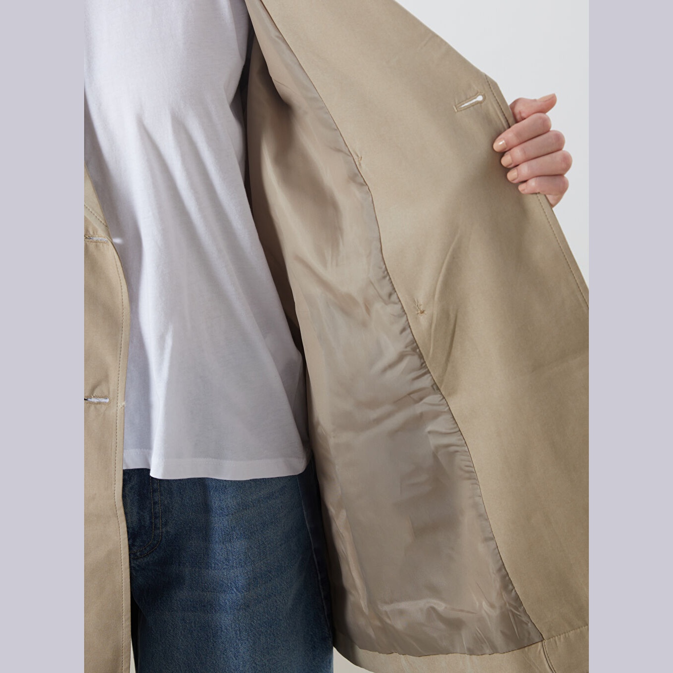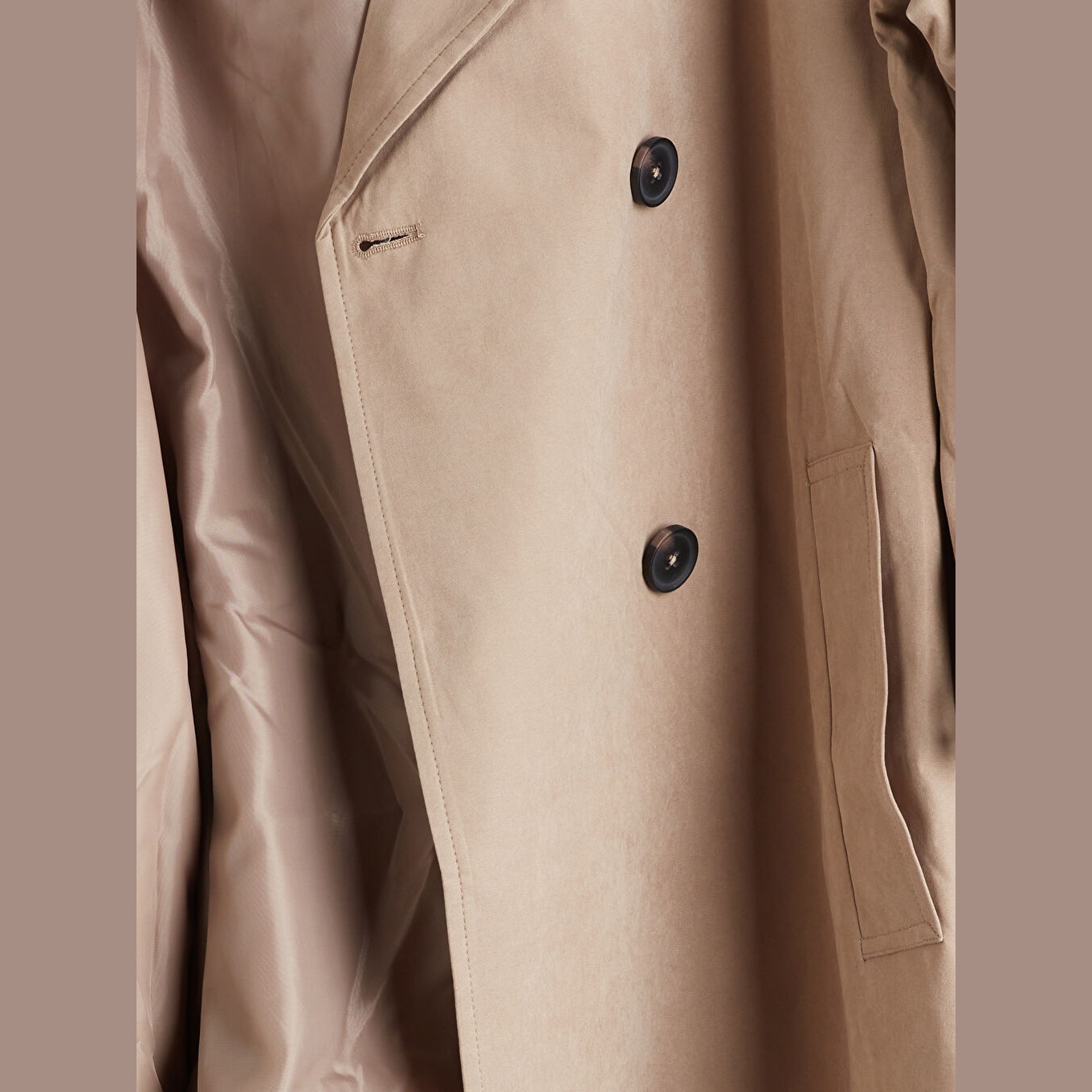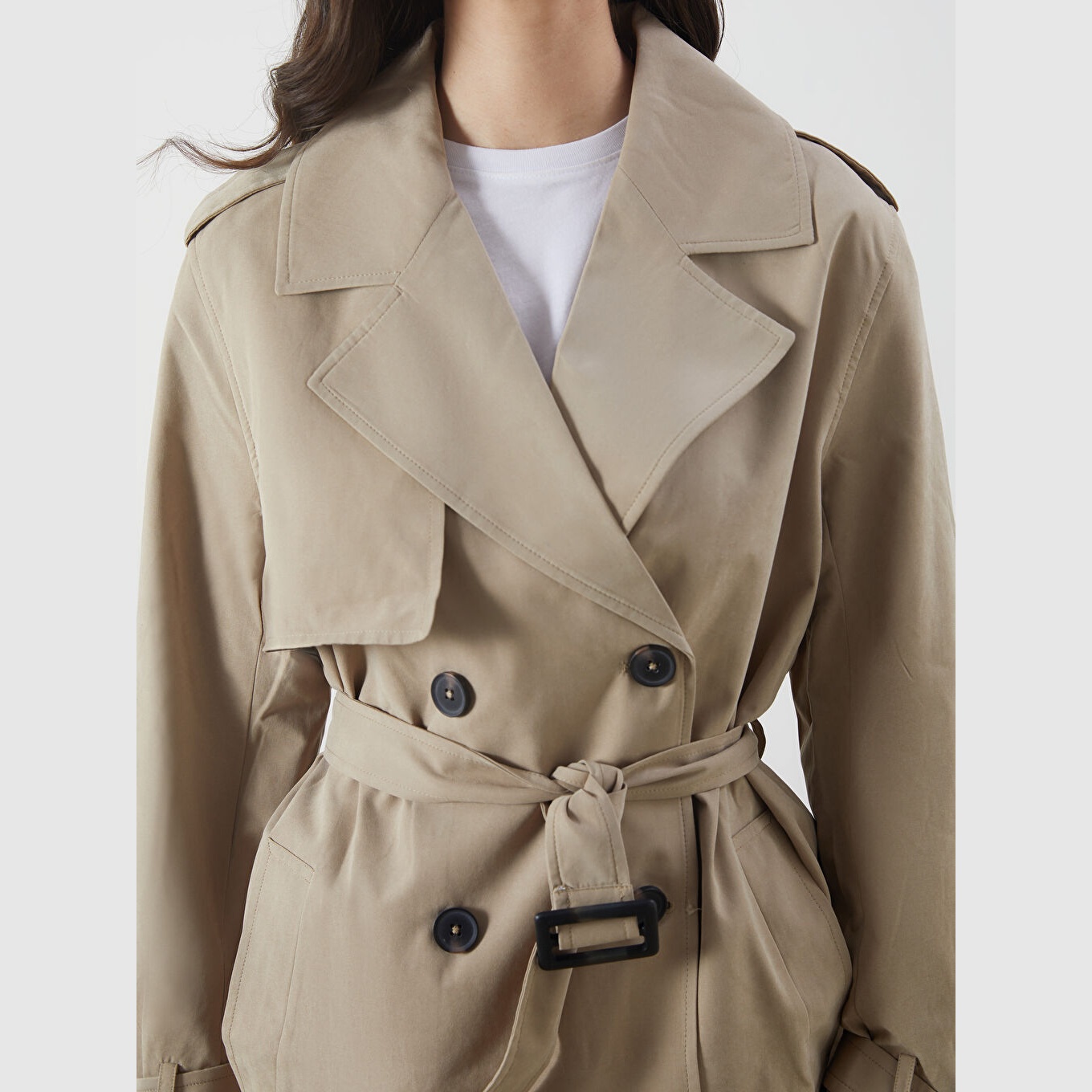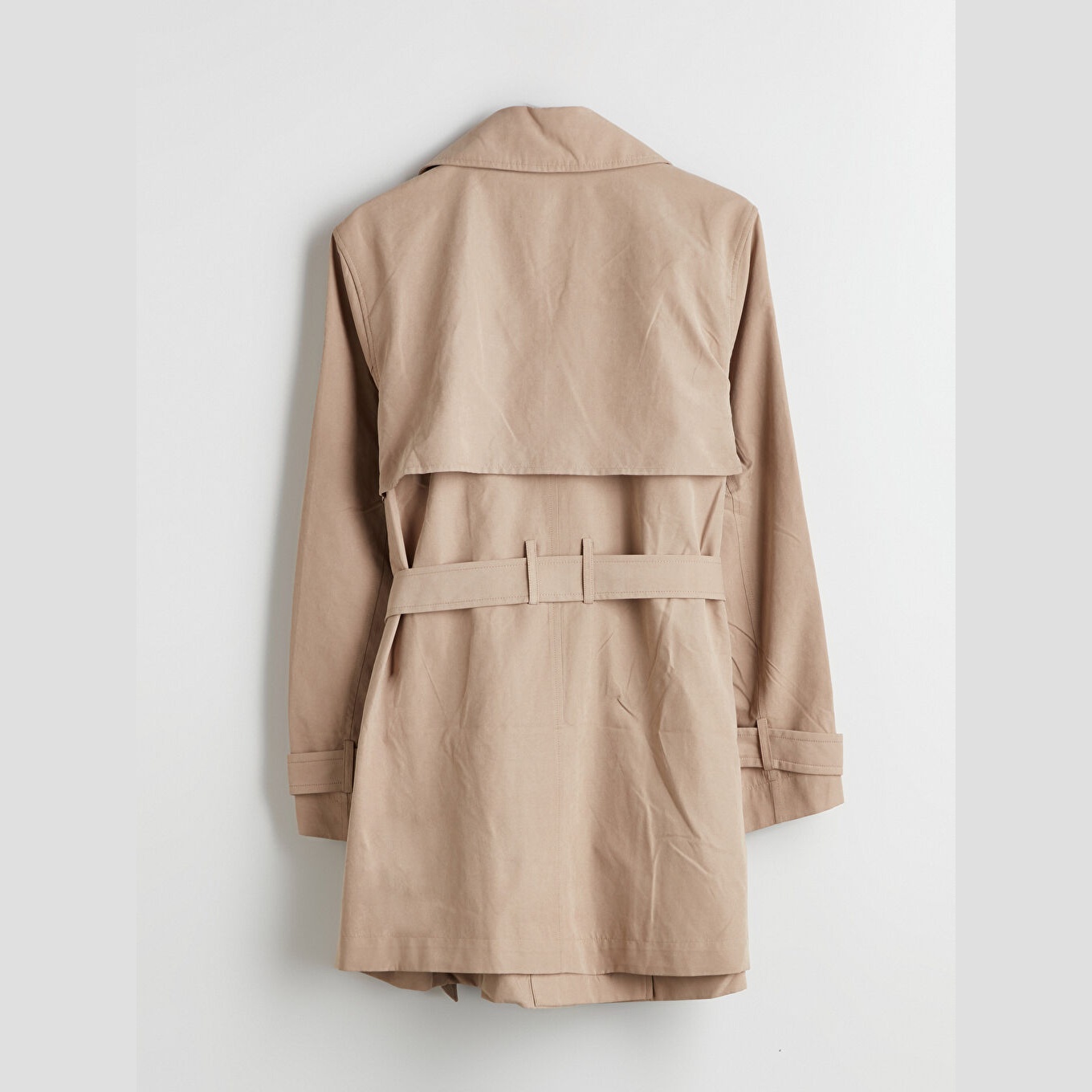 ترنش كوت نسائي بياقة مزدوجة من LCW Modest – بيج (قصة واسعة، تصميم محتشم متوسط الطول، خامة خفيفة مبطّنة بالكامل، مزود بحزام خصر، مثالي للإطلالات اليومية والرسمية)