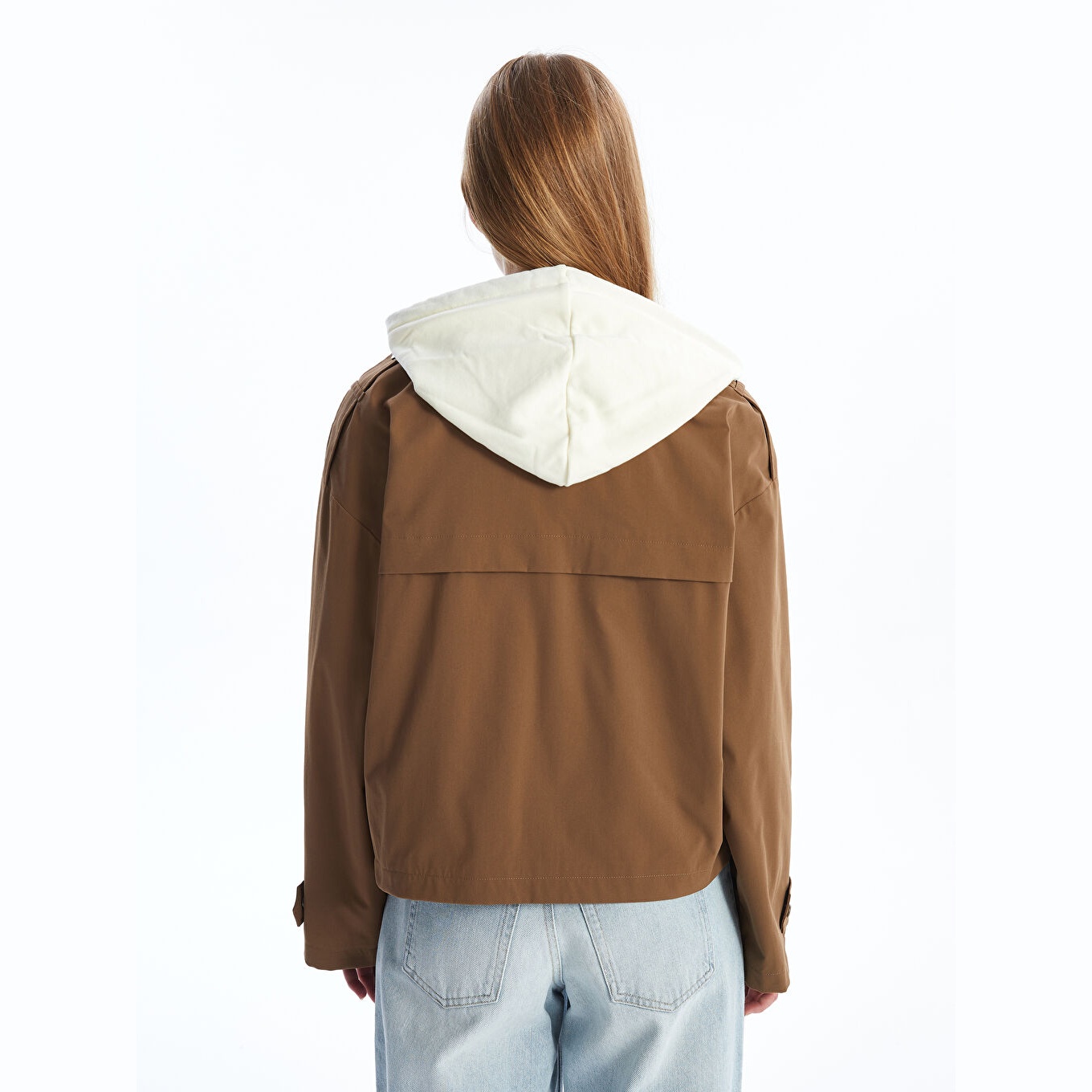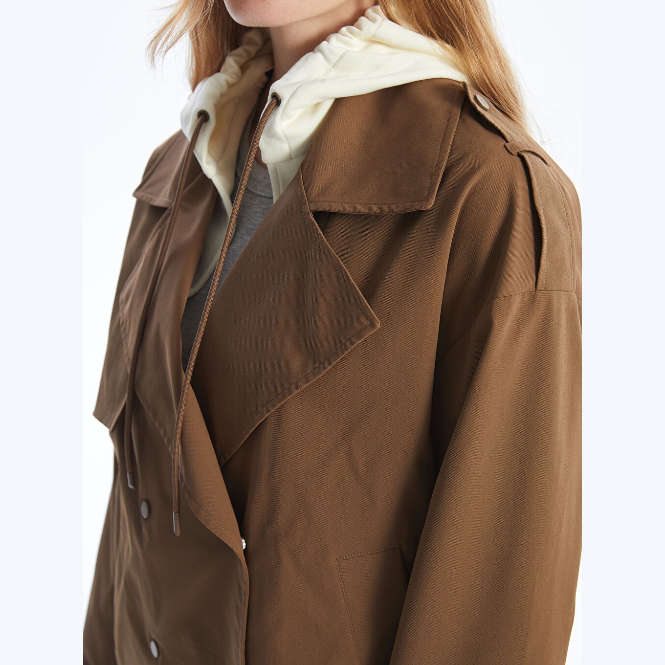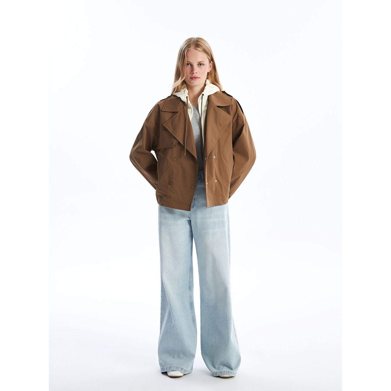ترنش كوت نسائي بقبعة قابلة للإزالة من LCW Vision – بني (قصة واسعة، تصميم عملي قصير، خامة خفيفة مبطّنة بالكامل، مثالي للإطلالات اليومية المحتشمة في الأجواء المتقلبة)