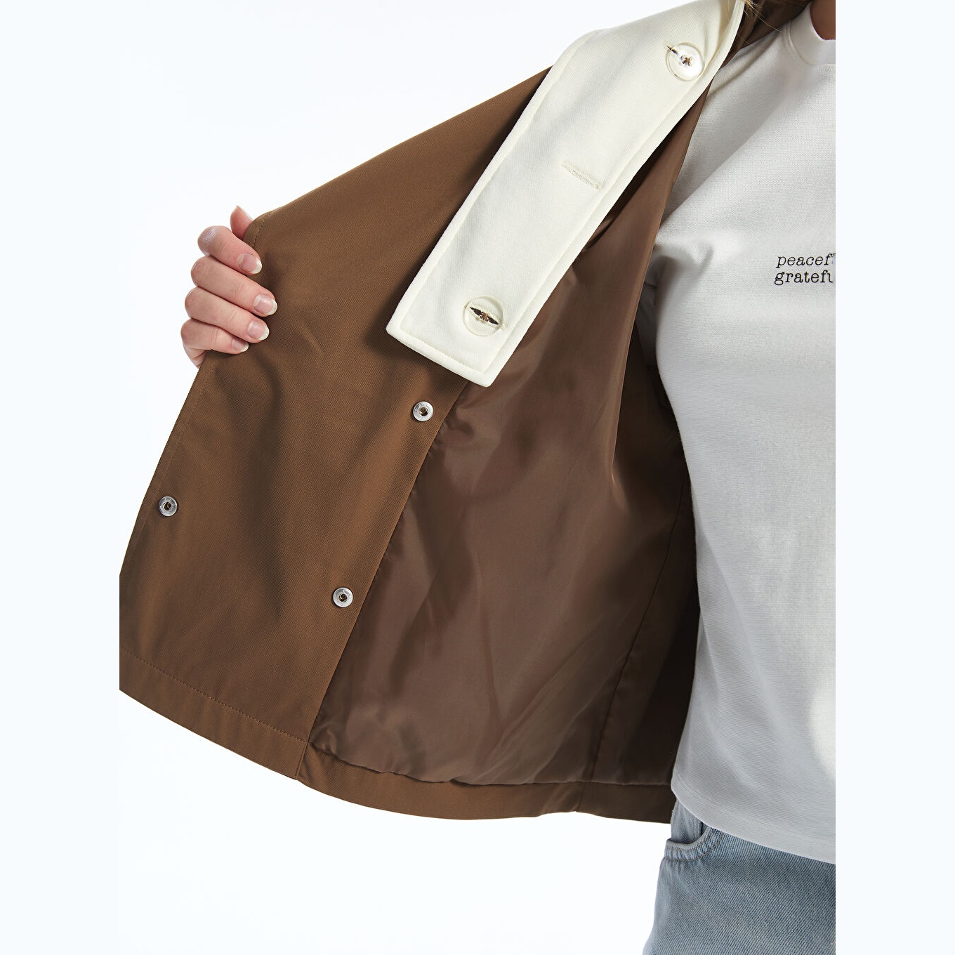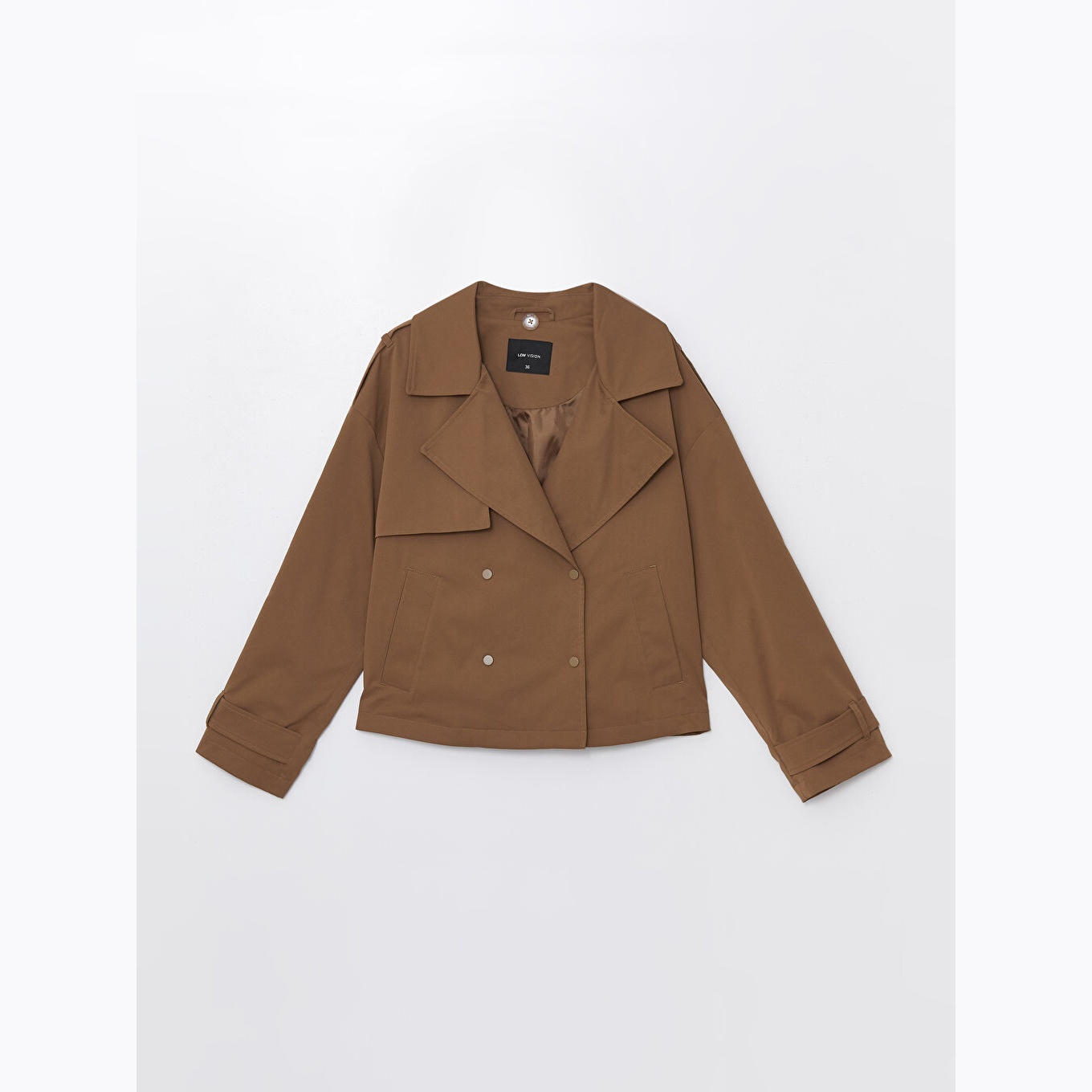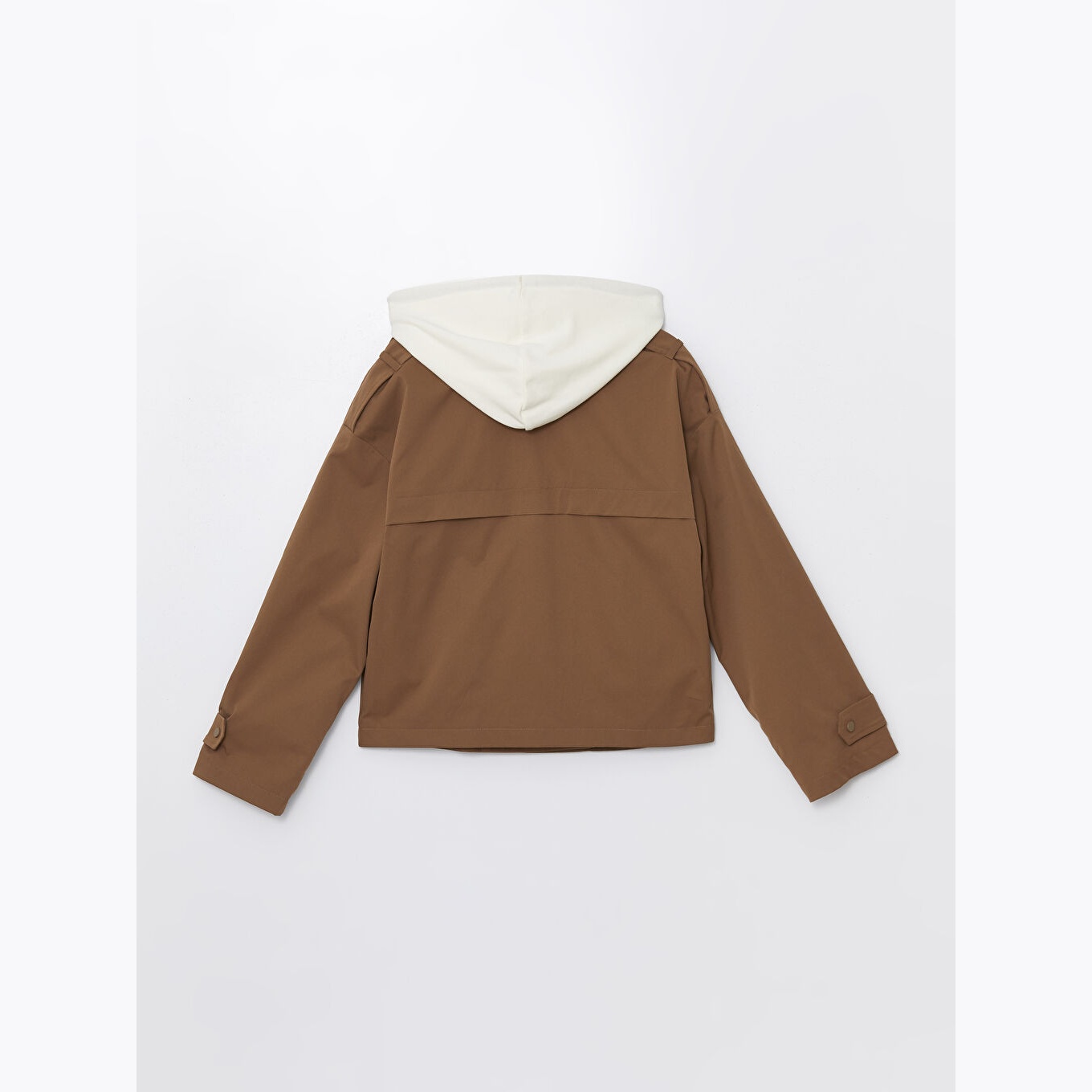ترنش كوت نسائي بقبعة قابلة للإزالة من LCW Vision – بني (قصة واسعة، تصميم عملي قصير، خامة خفيفة مبطّنة بالكامل، مثالي للإطلالات اليومية المحتشمة في الأجواء المتقلبة)