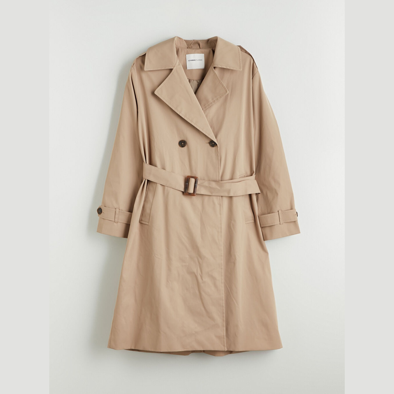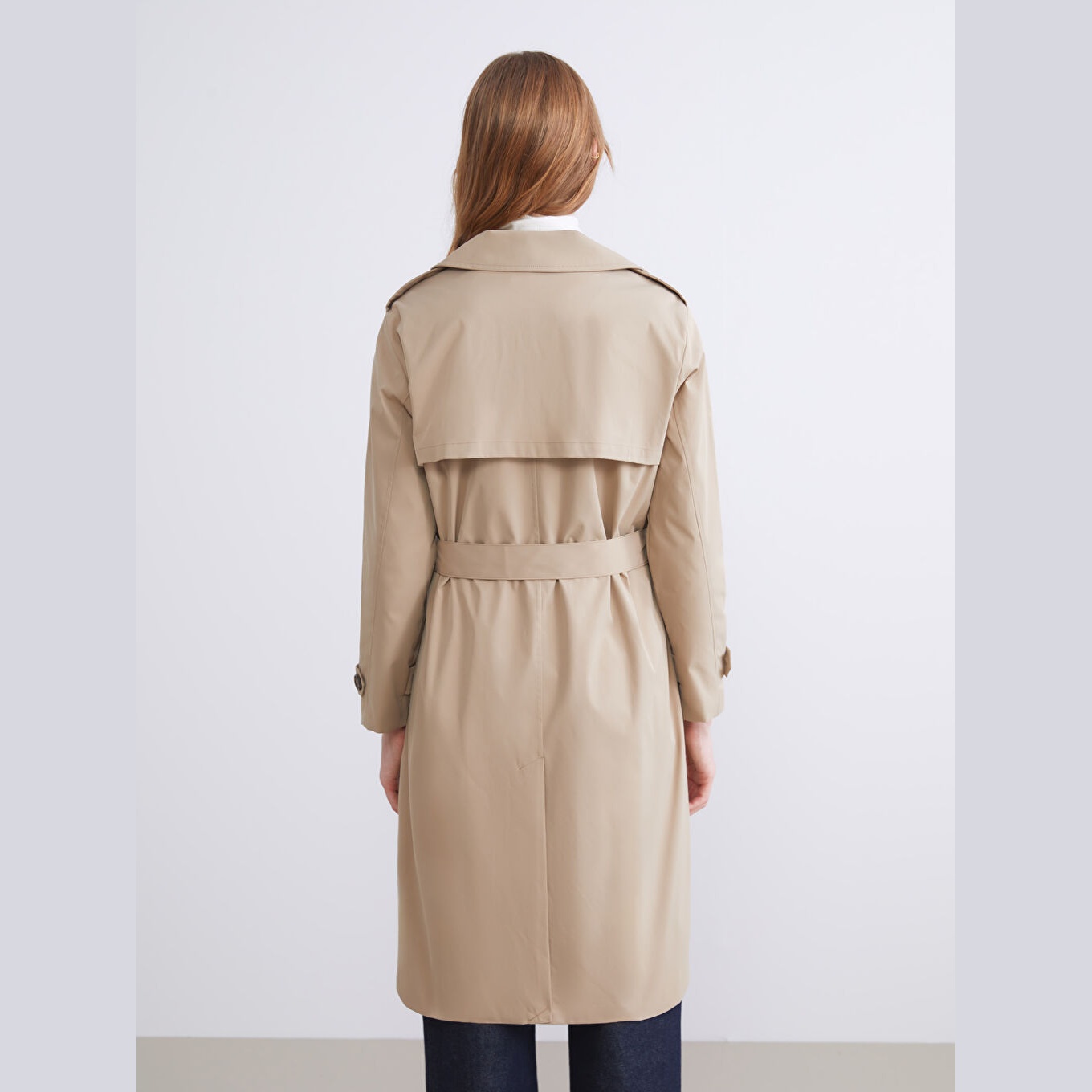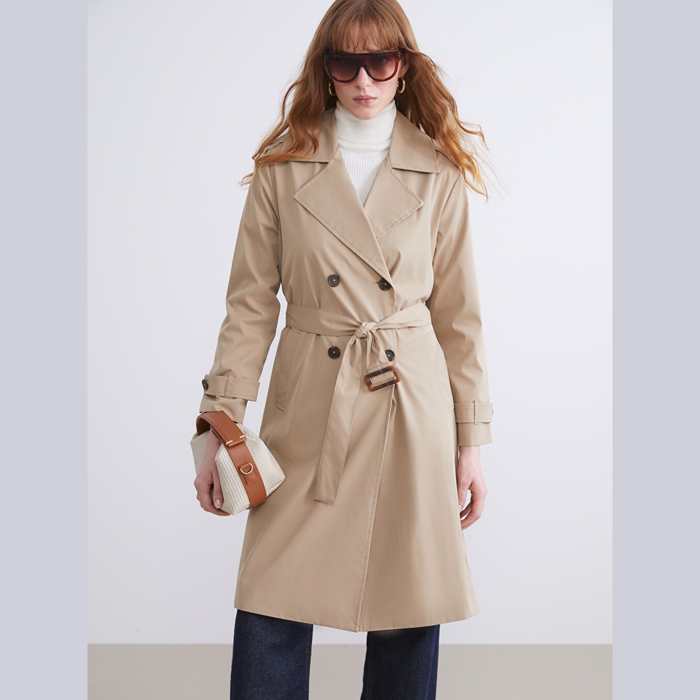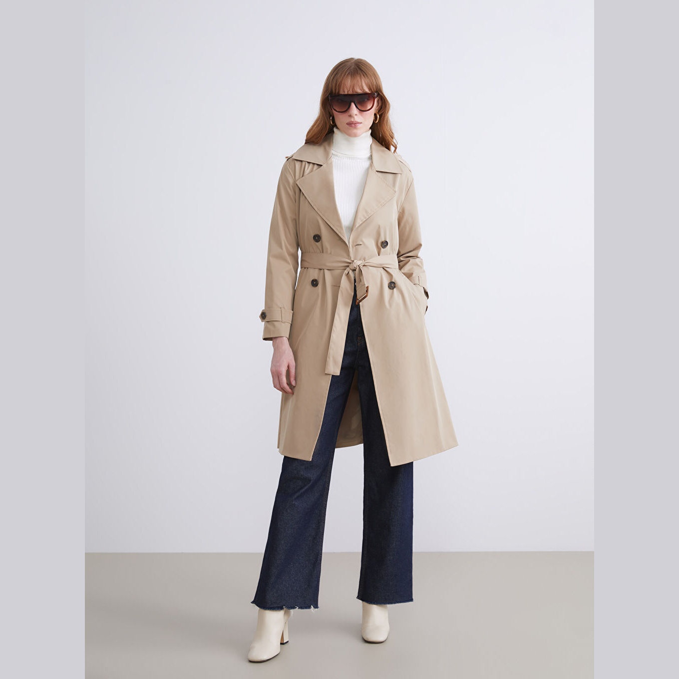ترنش كوت نسائي بياقة مزدوجة من LCWAIKIKI Classic – بيج (قصة واسعة، تصميم رسمي متوسط الطول، خامة جاباردين ناعمة مبطّنة بالكامل، مزود بحزام خصر، مثالي للإطلالات الخريفية والرسمية)