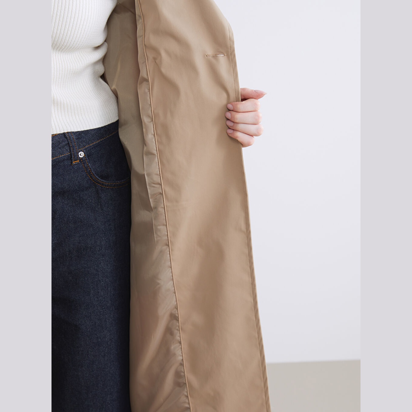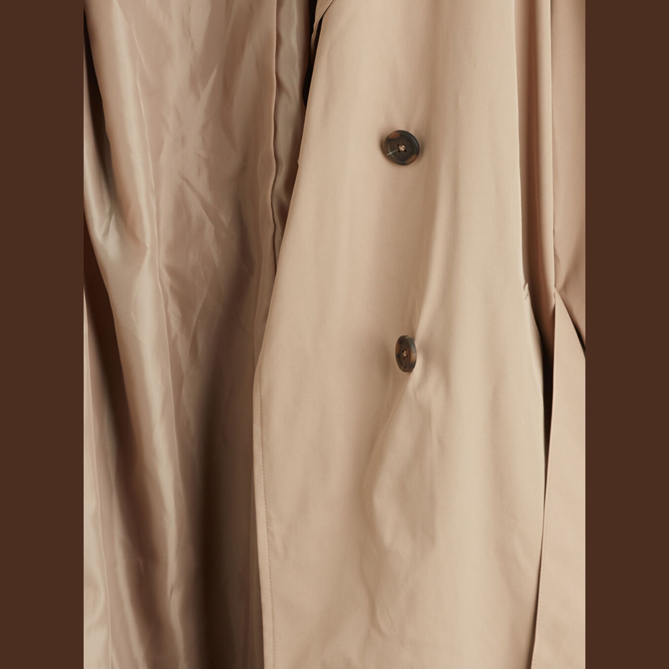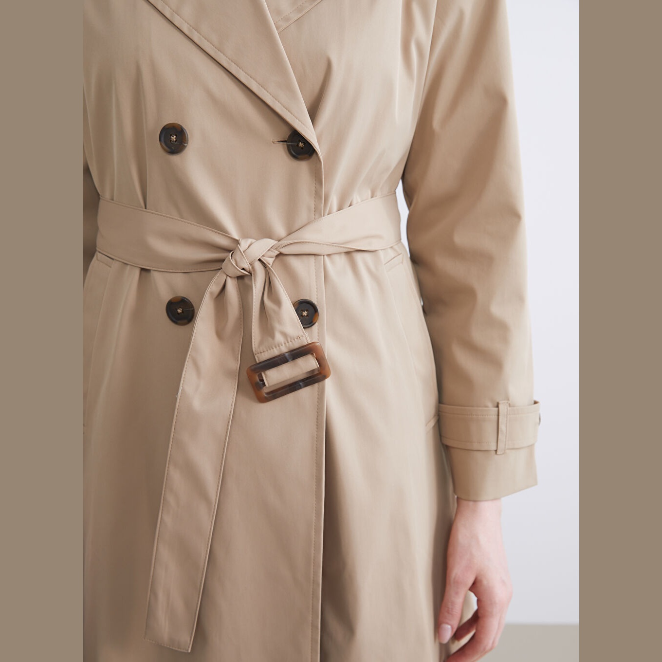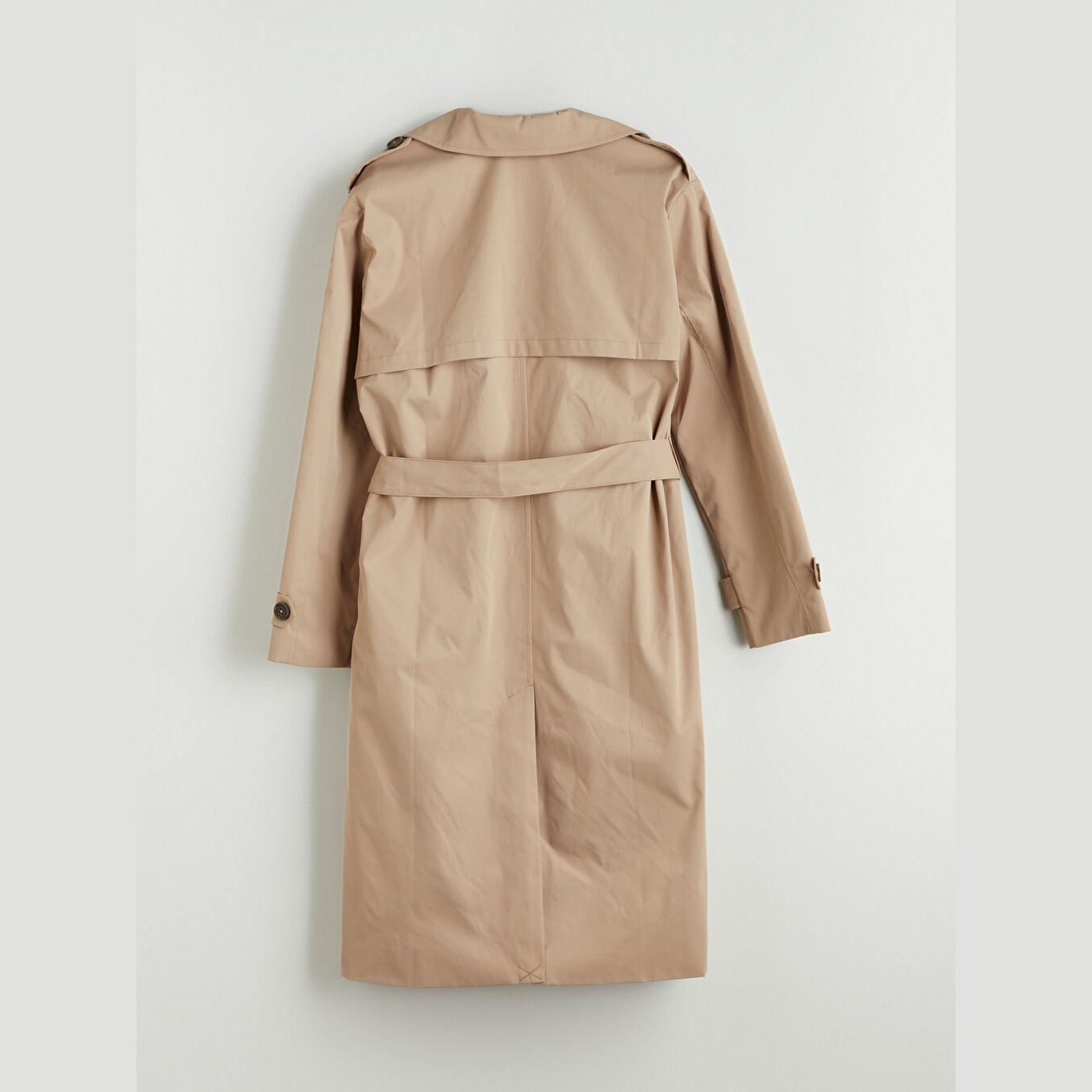 ترنش كوت نسائي بياقة مزدوجة من LCWAIKIKI Classic – بيج (قصة واسعة، تصميم رسمي متوسط الطول، خامة جاباردين ناعمة مبطّنة بالكامل، مزود بحزام خصر، مثالي للإطلالات الخريفية والرسمية)