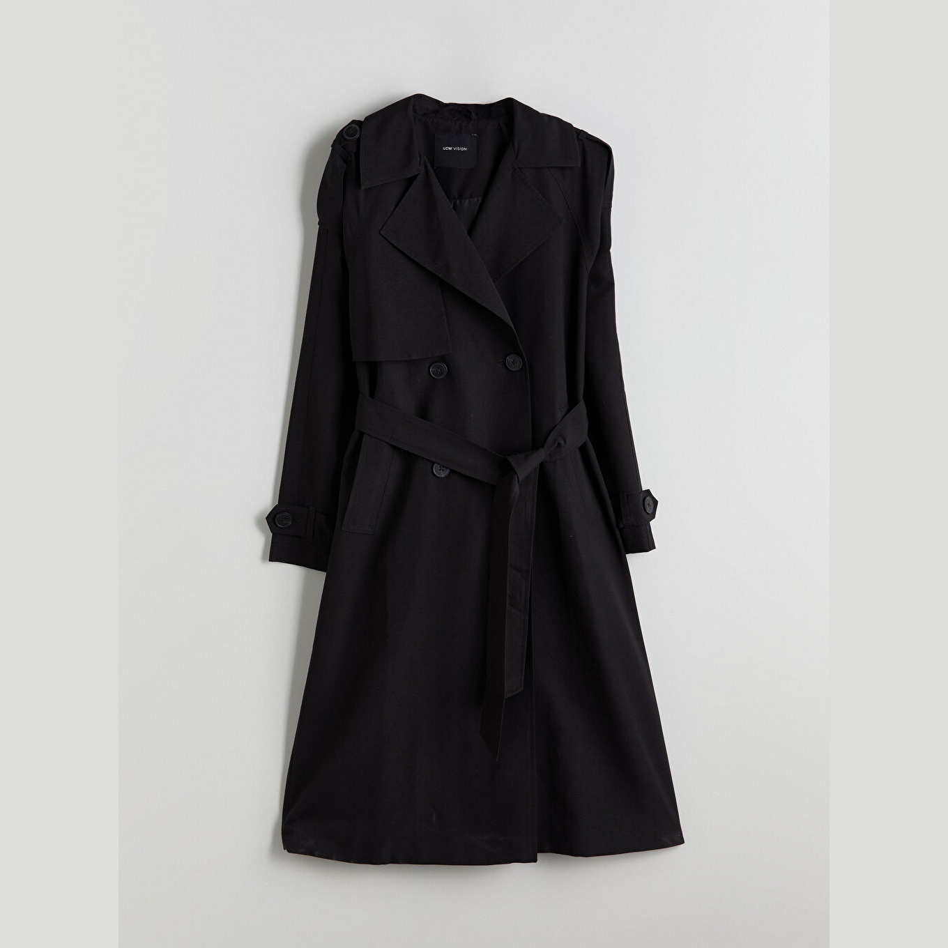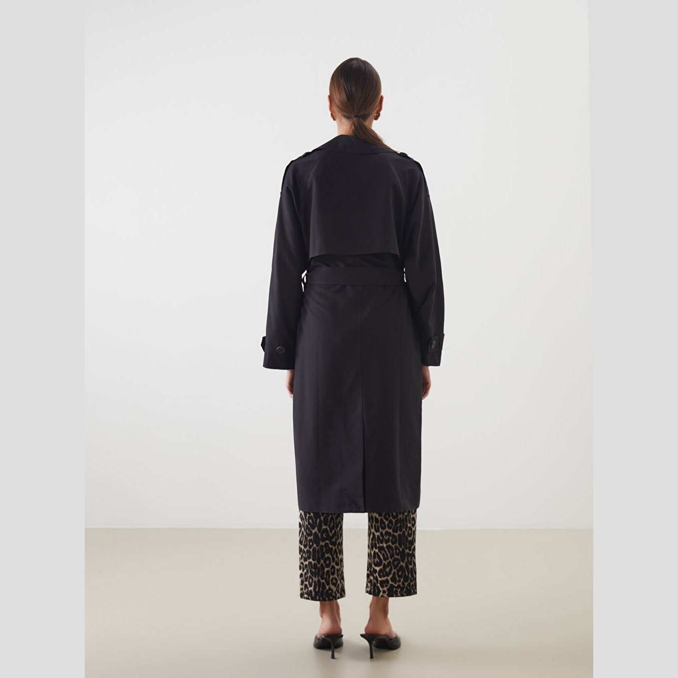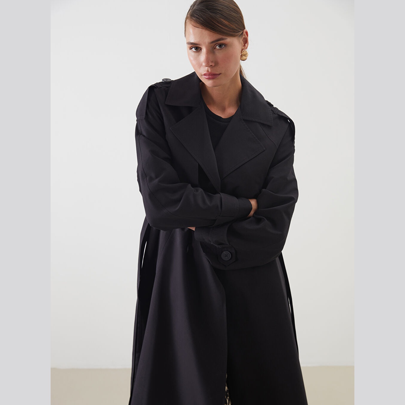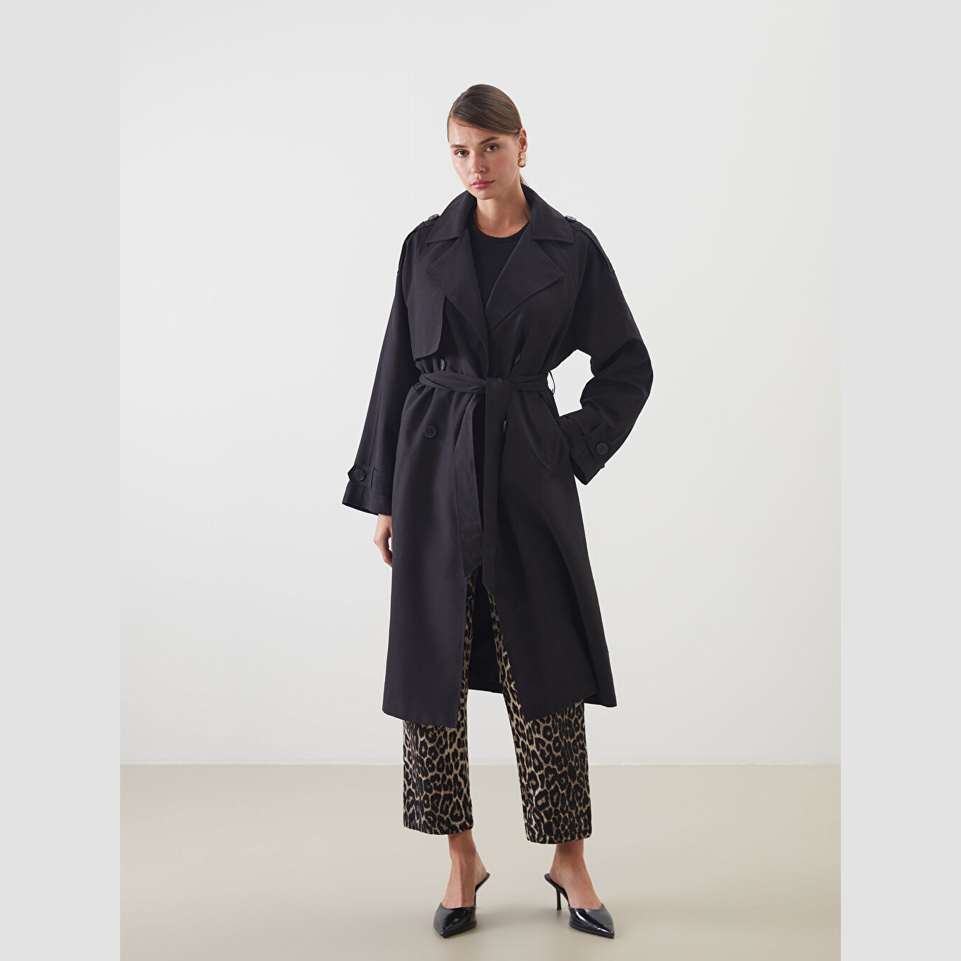 ترنش كوت نسائي بياقة جاكيت من LCW Vision – أسود (قصة واسعة، تصميم عصري طويل، خامة ناعمة مبطّنة بالكامل، مزود بحزام خصر، مثالي للإطلالات الرسمية والعصرية)